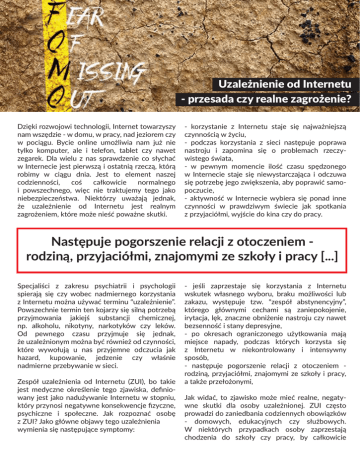 Uzależnienie od Internetu - przesada czy realne zagrożenie? Dzięki rozwojowi technologii, Internet towarzyszy nam wszędzie - w domu, w pracy, nad jeziorem czy w pociągu. Bycie online umożliwia nam już nie tylko komputer, ale i telefon, tablet czy nawet zegarek. Dla wielu z nas sprawdzenie co słychać w Internecie jest pierwszą i ostatnią rzeczą, którą robimy w ciągu dnia. Jest to element naszej codzienności, coś całkowicie normalnego i powszechnego, więc nie traktujemy tego jako niebezpieczeństwa. Niektórzy uważają jednak, że uzależnienie od Internetu jest realnym zagrożeniem, które może nieść poważne skutki. - korzystanie z Internetu staje się najważniejszą czynnością w życiu, - podczas korzystania z sieci następuje poprawa nastroju i zapomina się o problemach rzeczywistego świata, - w pewnym momencie ilość czasu spędzonego w Internecie staje się niewystarczająca i odczuwa się potrzebę jego zwiększenia, aby poprawić samopoczucie, - aktywność w Internecie wybiera się ponad inne czynności w prawdziwym świecie jak spotkania z przyjaciółmi, wyjście do kina czy do pracy. Następuje pogorszenie relacji z otoczeniem rodziną, przyjaciółmi, znajomymi ze szkoły i pracy [...] Specjaliści z zakresu psychiatrii i psychologii spierają się czy wobec nadmiernego korzystania z Internetu można używać terminu “uzależnienie”. Powszechnie termin ten kojarzy się silną potrzebą przyjmowania jakiejś substancji chemicznej, np. alkoholu, nikotyny, narkotyków czy leków. Od pewnego czasu przyjmuje się jednak, że uzależnionym można być również od czynności, które wywołują u nas przyjemne odczucia jak hazard, kupowanie, jedzenie czy właśnie nadmierne przebywanie w sieci. Zespół uzależnienia od Internetu (ZUI), bo takie jest medyczne określenie tego zjawiska, definiowany jest jako nadużywanie Internetu w stopniu, który przynosi negatywne konsekwencje fizyczne, psychiczne i społeczne. Jak rozpoznać osobę z ZUI? Jako główne objawy tego uzależnienia wymienia się następujące symptomy: - jeśli zaprzestaje się korzystania z Internetu wskutek własnego wyboru, braku możliwości lub zakazu, występuje tzw. “zespół abstynencyjny”, którego głównymi cechami są zaniepokojenie, irytacja, lęk, znaczne obniżenie nastroju czy nawet bezsenność i stany depresyjne, - po okresach ograniczonego użytkowania mają miejsce napady, podczas których korzysta się z Internetu w niekontrolowany i intensywny sposób, - następuje pogorszenie relacji z otoczeniem rodziną, przyjaciółmi, znajomymi ze szkoły i pracy, a także przełożonymi, Jak widać, to zjawisko może mieć realne, negatywne skutki dla osoby uzależnionej. ZUI często prowadzi do zaniedbania codziennych obowiązków - domowych, edukacyjnych czy służbowych. W niektórych przypadkach osoby zaprzestają chodzenia do szkoły czy pracy, by całkowicie poświęcić swój czas na przesiadywanie w Internecie. Często dochodzi też do częściowego lub całkowitego zaniku relacji interpersonalnych z rodziną czy znajomymi w realnym życiu. Należy jednak pamiętać, że człowiek nie uzależnia się od Internetu samego w sobie, ale od uczuć, które wywołuje w nim przebywanie w sieci. Często są to przyjemne, euforyczne stany, związane z osiągnięciem dobrego wyniku w grze internetowej, “poznania” kogoś ciekawego na czacie czy zebrania dużej ilości “lajków” i pozytywnych komentarzy pod swoim zdjęciem. Badania wykazały, że osobami z ZUI najczęściej są ludzie, którzy mają niską samoocenę i niskie poczucie własnej wartości. Są to raczej osoby niedojrzałe, które są mało zaradne oraz mają problem z wytrwałością w działaniu i samokontrolą. Świat wirtualny jest dla nich lepszy od rzeczywistości, bo pozwala na kreowanie swojej osoby, dzięki czemu można być bardziej lubianym i docenianym - przynajmniej pozornie. Można pokazać się z lepszej, atrakcyjniejszej strony, prezentując dopracowane, a czasem nawet fikcyjne wycinki ze swojego życia. Z tematyką uzależnienia od Internetu związane jest także zjawisko FOMO. To skrót od angielskiego wyrażenia fear of missing out, oznaczającego strach przed przegapieniem czegoś - przeoczeniem ważnej informacji czy możliwości nawiązania interakcji z innymi internautami. FOMO pojawiło się wskutek rozwoju urządzeń mobilnych i mediów społecznościowych. Według statystyk może na nie cierpieć nawet 70% osób dorosłych z krajów rozwiniętych. Zjawisko to najczęściej dotyka osoby, które mają niezaspokojone potrzeby bycia kochanym czy szanowanym oraz jednostki, które mają tendencję do porównywania się z innymi ludźmi i które odczuwają w związku z tym frustrację. Osoby z FOMO mają również problemy ze skupieniem się na jednej rzeczy, ciągle narzekają też na brak czasu - przerywają bieżące zadania, by sprawdzić co nowego dzieje się w sieci. Czy bronisz się przed problemami życia codziennego ? Osoby uzależnione od Internetu najczęściej, jak w przypadku innych uzależnień, negują istnienie problemu. Niektórzy z nich są go jednak świadomi mają poczucie winy i starają się ograniczyć czas spędzany w sieci. Niestety, próby te często kończą się niepowodzeniem i konieczne jest udanie się do specjalisty. ZUI leczone jest w podobny sposób jak inne uzależnienia, aby zwiększyć skuteczność terapii, monitoruje się czas spędzony w sieci, np. poprzez opracowanie szczegółowego planu dnia, który dokładnie określa ramy czasowe na wszystkie aktywności w ciągu doby, w tym korzystanie z Internetu. Współcześnie trudno jest nie być w sieci. Należy jednak pamiętać, by korzystać z Internetu z rozsądkiem i umiarem. Może być on źródłem wiedzy i rozrywki, ale także zagrożeniem, które odetnie nas od realnego świata. Warto mieć świadomość, że prawdziwe życie toczy się cały czas i nadużywając Internetu, tracimy szansę na