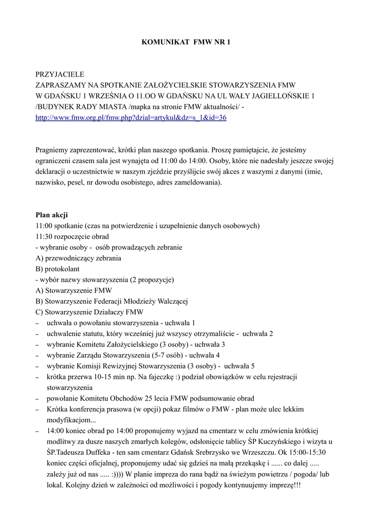 KOMUNIKAT FMW NR 1 PRZYJACIELE ZAPRASZAMY NA SPOTKANIE ZAŁOŻYCIELSKIE STOWARZYSZENIA FMW W GDAŃSKU 1 WRZEŚNIA O 11.OO W GDAŃSKU NA UL WAŁY JAGIELLOŃSKIE 1 /BUDYNEK RADY MIASTA /mapka na stronie FMW aktualności/ http://www.fmw.org.pl/fmw.php?dzial=artykul&dz=s_1&id=36 Pragniemy zaprezentować, krótki plan naszego spotkania. Proszę pamiętajcie, że jesteśmy ograniczeni czasem sala jest wynajęta od 11:00 do 14:00. Osoby, które nie nadesłały jeszcze swojej deklaracji o uczestnictwie w naszym zjeździe przyślijcie swój akces z waszymi z danymi (imie, nazwisko, pesel, nr dowodu osobistego, adres zameldowania). Plan akcji 11:00 spotkanie (czas na potwierdzenie i uzupełnienie danych osobowych) 11:30 rozpoczęcie obrad - wybranie osoby - osób prowadzących zebranie A) przewodniczący zebrania B) protokolant - wybór nazwy stowarzyszenia (2 propozycje) A) Stowarzyszenie FMW B) Stowarzyszenie Federacji Młodzieży Walczącej C) Stowarzyszenie Działaczy FMW – uchwała o powołaniu stowarzyszenia - uchwała 1 – uchwalenie statutu, który wcześniej już wszyscy otrzymaliście - uchwała 2 – wybranie Komitetu Założycielskiego (3 osoby) - uchwała 3 – wybranie Zarządu Stowarzyszenia (5-7 osób) - uchwała 4 – wybranie Komisji Rewizyjnej Stowarzyszenia (3 osoby) - uchwała 5 – krótka przerwa 10-15 min np. Na fajeczkę :) podział obowiązków w celu rejestracji stowarzyszenia – powołanie Komitetu Obchodów 25 lecia FMW podsumowanie obrad – Krótka konferencja prasowa (w opcji) pokaz filmów o FMW - plan może ulec lekkim modyfikacjom... – 14:00 koniec obrad po 14:00 proponujemy wyjazd na cmentarz w celu zmówienia krótkiej modlitwy za dusze naszych zmarłych kolegów, odsłonięcie tablicy ŚP Kuczyńskiego i wizyta u ŚP.Tadeusza Duffeka - ten sam cmentarz Gdańsk Srebrzysko we Wrzeszczu. Ok 15:00-15:30 koniec części oficjalnej, proponujemy udać się gdzieś na małą przekąskę i ...... co dalej ..... zależy już od nas ..... :)))) W planie impreza do rana bądź na świeżym powietrzu / pogoda/ lub lokal. Kolejny dzień w zależności od możliwości i pogody kontynuujemy imprezę!!! CO DO NOCLEGU, NA ZASADACH PARTYZANCKICH JEŚLI KTOŚ "PADNIE" UDZIELIMY POMOCY. Kaskę proszę zabrać koniecznie!!! Wszystko co robimy do tej pory jest ze zrzutek i tak to będzie działać nadal do czasu podjęcia działań przez Stowarzyszenie, liczymy jednak na Wasze wsparcie. Liczymy też na wsparcie tych, którzy nie przyjadą - tablica dla Kuczyńskiego, wsparcie przy budowie nagrobka dla Dudiego... Pozdrawiamy serdecznie i zapraszamy do Gdańska Tymczasowy Komitet Organizacyjny FMW Gdańsk 2007.08.10 Kontakt w sprawie spotkania Robert Licbarski Piona 607 046 800 i [email protected] Jeżeli to tylko możliwe to prześlijcie ten komunikat dalej, do tych wszystkich, z którymi macie kontakt. Prosimy o potwierdzenie przyjazdu do Gdańska. PROSIMY O NIEWYKORZYSTYWANIE ADRESÓW MAIL'OWYCH JAKO POTENCJALNEJ BAZY DANYCH DO PRZESYANIA TREŚCI NIE ZWIĄZANYCH Z FMW. W załączeniu przesyłam projekt Statutu. Pozdrawiam Mariusz Szary Sieraczkiewicz - Biuro Informacyjne FMW 695 138 289; e-mail: [email protected]; gg 6652382