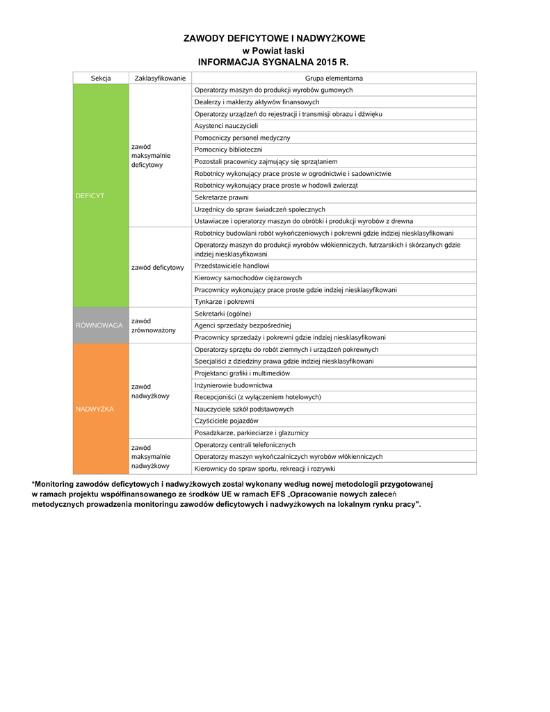 ZAWODY DEFICYTOWE I NADWYŻKOWE w Powiat łaski INFORMACJA SYGNALNA 2015 R. Sekcja Zaklasyfikowanie Grupa elementarna Operatorzy maszyn do produkcji wyrobów gumowych Dealerzy i maklerzy aktywów finansowych Operatorzy urządzeń do rejestracji i transmisji obrazu i dźwięku Asystenci nauczycieli zawód maksymalnie deficytowy Pomocniczy personel medyczny Pomocnicy biblioteczni Pozostali pracownicy zajmujący się sprzątaniem Robotnicy wykonujący prace proste w ogrodnictwie i sadownictwie Robotnicy wykonujący prace proste w hodowli zwierząt DEFICYT Sekretarze prawni Urzędnicy do spraw świadczeń społecznych Ustawiacze i operatorzy maszyn do obróbki i produkcji wyrobów z drewna Robotnicy budowlani robót wykończeniowych i pokrewni gdzie indziej niesklasyfikowani Operatorzy maszyn do produkcji wyrobów włókienniczych, futrzarskich i skórzanych gdzie indziej niesklasyfikowani zawód deficytowy Przedstawiciele handlowi Kierowcy samochodów ciężarowych Pracownicy wykonujący prace proste gdzie indziej niesklasyfikowani Tynkarze i pokrewni RÓWNOWAGA zawód zrównoważony Sekretarki (ogólne) Agenci sprzedaży bezpośredniej Pracownicy sprzedaży i pokrewni gdzie indziej niesklasyfikowani Operatorzy sprzętu do robót ziemnych i urządzeń pokrewnych Specjaliści z dziedziny prawa gdzie indziej niesklasyfikowani Projektanci grafiki i multimediów zawód nadwyżkowy NADWYŻKA Inżynierowie budownictwa Recepcjoniści (z wyłączeniem hotelowych) Nauczyciele szkół podstawowych Czyściciele pojazdów Posadzkarze, parkieciarze i glazurnicy zawód maksymalnie nadwyżkowy Operatorzy centrali telefonicznych Operatorzy maszyn wykończalniczych wyrobów włókienniczych Kierownicy do spraw sportu, rekreacji i rozrywki *Monitoring zawodów deficytowych i nadwyżkowych został wykonany według nowej metodologii przygotowanej w ramach projektu współfinansowanego ze środków UE w ramach EFS „Opracowanie nowych zaleceń metodycznych prowadzenia monitoringu zawodów deficytowych i nadwyżkowych na lokalnym rynku pracy".