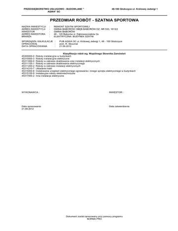 PRZEDSIĘBIORSTWO USŁUGOWO - BUDOWLANE " AQWA" SC 48-100 Głubczyce ul. Królowej Jadwigi 1 PRZEDMIAR ROBÓT - SZATNIA SPORTOWA NAZWA INWESTYCJI ADRES INWESTYCJI INWESTOR ADRES INWESTORA BRANŻA : : : : : REMONT SZATNI SPORTOWEJ GMINA BABORÓW OBĘB BABORÓW DZ. NR 533, 1613/2 GMINA BABORÓW 48 - 120 Baborów ul. Dąbrowszczaków 2a ELEKTRYCZNA: BUDYNEK SZATNI SPORZĄDZIŁ KALKULACJE : OPRACOWAŁ : DATA OPRACOWANIA : 45300000-0 45310000-3 45311000-0 45311100-1 45311200-2 45314310-7 45315000-8 45315100-9 45317000-2 PUB AQWA SC ul. Królowej Jadwigi 1, 48 - 100 Głubczyce arch. R. Skoumal 21.09.2012 Klasyfikacja robót wg. Wspólnego Słownika Zamówień Roboty instalacyjne w budynkach Roboty instalacyjne elektryczne Roboty w zakresie okablowania oraz instalacji elektrycznych Roboty w zakresie okablowania elektrycznego Roboty w zakresie instalacji elektrycznych Układanie kabli Instalowanie urządzeń elektrycznego ogrzewania i innego sprzętu elektrycznego w budynkach Instalacyjne roboty elektrotechniczne Inne instalacje elektryczne WYKONAWCA : INWESTOR : Data opracowania 21.09.2012 Data zatwierdzenia Dokument został opracowany przy pomocy programu NORMA PRO OGÓLNA CHARAKTERYSTYKA OBIEKTU Lokalizacja: SZATNIA SPORTOWA 48 - 120 BABORÓW DZ. NR 533, 1613/2 Inwestor: GMINA BABORÓW 48-120 Baborów ul. Dąbrowszczaków 2a Parametry techniczne obiektu: KATEGORIA XV, k = 9,0 w = 1,0 Obiekt nie wymaga opiniowania ze strony rzeczoznawcy do spraw zabezpieczeń P.Poż. Parametry techniczne systemowego budynku zaplecza: Obiekt niski [N], jedna kondygnacja nadziemna. Szerokość: 6,55m Długość: 21,15m Wysokość: - okap: 3,20 m - kalenica: 3,50 m Powierzchnia zabudowy 176,13 m2 Powierzchnia użytkowa w zakresie opracowania 56,92 m2 Kubatura wewnętrzna 170,76 m3 Zakres opracowania Zakresem opracowania projektu budowlano - wykonawczego ujęto : - instalację oświetlenia pomieszczeń szatni - instalację gniazd wtyczkowych ogólnego przeznaczenia 230V - instalację zasilania piecy akumulacyjnych 400V - instalację zasilania podgrzewacza wody 400V Zasilanie w energię elektryczną Zasilanie projektowanego budynku szatni odbywać się będzie z sieci zgodnie z warunkami i mocą zainstalowana na obiekcie. Pomiar rozliczeniowy energii elektrycznej Pomiar energii elektrycznej istniejący jako bezpośredni, jednostrefowy, 3-fazowy z licznikiem zlokalizowanym na szynie w istniejącej RG umieszczonej na ścianie. Wskażniki elektroenergetyczne - zasilanie w układzie - odbiory obiektu w układzie - sieć oświetlenia terenu - napięcie zasilania - moc zainstalowana TN-C TN-S TN-C-S 230/400 V AC 30,0 kW Tablica rozdzielcza "RG" Tablica projektowana - schemat w załączeniu. Awaryjne wyłączenie zasilania tablicy rozdzielczej "RG" przewidziano przy pomocy wyłącznika "p-poż" zabudowanego przy wejściu do budynku. Oświetlenie Oświetlenie ogólne budynku szatni Zgodnie z wytycznymi normy PN-EN-12464-1 natężenie oświetlenia dobrano odpowiednio: - pomieszczenie trenera pow. 300 lx - łazienki i sanitariaty pow. 200 lx - szatnia pow. 100 lx Oprawy oświetleniowe wyposażone zostaną w świetlówki liniowe i kompaktowe. Typy opraw podano na planach instalacji oraz w zestawieniu materiałów. Instalację oświetleniową wykonać przewodami YDYżo3x1,5 mm2 . Przewody układać wewnątrz konstrukcji ścian i ponad sufitami w osłonie z rurek z PCV. Sterowanie oświetleniem za pomocą wyłączników mocowanych na wysokości 1,4 m. Obwody gniazd wtykowych Przewidziano gniazda wtykowe do ścian murowanych ogólnego przeznaczenia, bryzgoszczelne, gniazda do zasilania podgrzewaczy wody i grzejników konwektorowych. Rozmieszczenie gniazd wtykowych podano na planach instalacji. Instalację zasilania gniazd wykonać przewodami YDYżo3x2,5 mm2 oraz YDYżo5x2,5 mm2 - dla podgrzewacza i piecy akumulacyjnych. Gniazda wtyczkowe mocować na wysokości: - + 0,30 m. w pomieszczeniach ogólnych - + 1,40 m. w łazienkach [ogólne] -2- Norma PRO Wersja 4.25 Licencja: 20106 dla P.U.B. "AQWA" s.c. PRZEDMIAR Lp. Podst 1 1 KNNR 5 d.1 0405-06 analogia Nr spec. techn. SST 01/5 2 KNR-W 4- SST d.1 01 0337-01 01/5 analogia 3 KNNR 5 d.1 0404-01 analogia SST 01/5 Opis i wyliczenia Wewnętrzne instalacje elektryczne Skrzynki i rozdzielnice skrzynkowe o masie do 10 kg wraz z konstrukcją mocowaną do podłoża przez przykręcenie - RG kompletnie wyposażona zgd z PT typu TR-230/400V XL160 izolacyjna 4x24 1 SST 01/5 5 PRZEWÓD SST d.1 kalk. własna 01/5 6 KNR 5-10 d.1 0118-02 SST 01/5 7 PRZEWÓD SST d.1 kalk. własna 01/5 8 KNR 5-10 d.1 0118-02 SST 01/5 9 PRZEWÓD SST d.1 kalk. własna 01/5 10 KNNR 5 d.1 0301-11 11 KNNR 5 d.1 0302-06 12 KNNR 5 d.1 0303-01 analogia 13 KNNR 5 d.1 0410-02 14 KNNR 5 d.1 0308-05 15 KNNR 5 d.1 0306-02 16 KNNR 5 d.1 1201-01 SST 01/5 SST 01/5 SST 01/5 SST 01/5 SST 01/5 SST 01/5 SST 01/5 Poszcz Razem szt. szt. Wykucie bruzd poziomych 1/4 x 1/2 ceg. w ścianach z cegieł na zaprawie m wapiennej - kompletne bruzdowanie ścian i sufitów pod wszystkie zaprojektowane przewody oświetleniowe i obwody gniazd 275 m 1.000 RAZEM 1.000 275.000 RAZEM 275.000 1.000 RAZEM 1.000 100.000 RAZEM 100.000 100.000 RAZEM 100.000 120.000 RAZEM 120.000 120.000 RAZEM 120.000 55.000 RAZEM 55.000 55.000 RAZEM 55.000 19.000 RAZEM 19.000 15.000 RAZEM 15.000 4.000 RAZEM 4.000 7.000 RAZEM 7.000 7.000 RAZEM 7.000 8.000 RAZEM 8.000 150.000 RAZEM 150.000 Montaż głównego wyłącznika prądu - przycisk ST22 SPAMEL w skrzynce szt. wewnątrz budynku 1 4 KNR 5-10 d.1 0118-02 j.m. szt. Układanie kabli wielożyłowych o masie do 1.0 kg/m na nap. znamionowe m poniżej 110 kV w budynkach, budowlach lub na estakadach z mocowaniem - p/t - INSTALACJA OŚWIETLENIOWA 100 m Przewód elektroenergetyczny typu YDYżo 3x1,5mm2 - INSTALACJA OŚWIETLENIOWA 100 m m Układanie kabli wielożyłowych o masie do 1.0 kg/m na nap. znamionowe m poniżej 110 kV w budynkach, budowlach lub na estakadach z mocowaniem - p/t - INSTALACJA GNIAZD 120 m Przewód elektroenergetycz