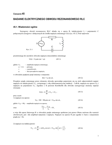 Ćwiczenie 45 BADANIE ELEKTRYCZNEGO OBWODU REZONANSOWEGO RLC 45.1. Wiadomości ogólne Szeregowy obwód rezonansowy RLC składa się z oporu R, indukcyjności L i pojemności C połączonych szeregowo i dołączonych do źródła napięcia zmiennego U(t) (rys. 45.1). Pod wpływem Rys. 21.1 przyłożonego do zacisków obwodu napięcia sinusoidalnie zmiennego U(t) = U0sin (ωt + ϕ) gdzie: U0 – ω = 2πν – ν – ϕ – (45.1) amplituda napięcia zmiennego, pulsacja, częstotliwość, faza początkowa napięcia, w obwodzie popłynie prąd zmienny o natężeniu I(t) = I0 sin ωt . (45.2) Przepływ prądu zmiennego przez elementy obwodu spowoduje pojawienie się na nich odpowiednich napięć: napięcia na indukcyjności UL, związanego z siłą elektromotoryczną indukcji – LdI/dt, napięcia na oporze UR i napięcia na pojemności UC. Zgodnie z II prawem Kirchhoffa dla obwodu szeregowego możemy napisać równanie U( t ) − L dI = UR + UC , dt (45.3) przy czym: 1) napięcie na oporze UR = RI = RI0sin ωt = U0R sin ωt , (45.4) gdzie: U0R = RI0 – amplituda napięcia na oporze, U R U oR = =R, I Io oraz (45.5) a więc dla oporu liniowego R w obwodzie prądu zmiennego spełnione jest prawo Ohma zarówno dla wartości chwilowych, jak i dla amplitud natężenia i napięcia. Napięcie na oporze R jest zgodne w fazie z natężeniem prądu (ϕ = 0); 2) napięcie na indukcyjności UL = L dI π = ωLI 0 cos ωt = U 0 L sin ωt + , dt 2 (45.6) 1 gdzie: U0L = ωLI0 – amplituda napięcia na indukcyjności, U 0L = ωL = XL – oporność indukcyjna. I0 Napięcie na indukcyjności wyprzedza w fazie natężenie prądu o π/2 (ϕ = π/2); 3) napięcie na kondensatorze UC = I Q 1 π = ∫ Idt = − 0 cos ωt = U 0 C sin ωt − , C C ωt 2 (45.7) I0 – amplituda napięcia na kondensatorze, ωC 1 = = X C – oporność pojemnościowa. ωC gdzie: U 0C = oraz: U 0C I0 Napięcie na kondensatorze opóźnione jest w fazie za natężeniem prądu o π/2 (ϕ = – π/2). II Prawo Kirchhoffa (45.3) dla obwodu zamkniętego przyjmuje więc postać π I π U 0 sin( ωt + ϕ) = RI 0 sin ωt + ωI 0 sin ωt + + 0 sin ωt − . 2 ωC 2 (45.8) 0 I(t)=I0sinω t Jest to sumowanie przebiegów sinusoidalnie zmiennych o jednakowej y pulsacji ω, ale o różnych amplitudach i fazach początkowych. ω Sumowanie to można przedstawić poglądowo metodą wykresów wektorowych, stosowaną też przy opisie ruchu harmonicznego (rys. 45.2). I Jeżeli wektor o długości równej amplitudzie rozważanego α = ωt przebiegu (np. natężenie prądu I0), obraca się wokół początku układu x współrzędnych za stałą prędkością kątową ω równą pulsacji drgań, to jego rzut na oś rzędnych I = I0 sin ωt, obrazuje zmiany wartości chwilowej tego przebiegu. Na wykresie wektorowym (rys. 21.3), wykreślonym w chwili, gdy wektor obrazujący amplitudę napięcia na oporze U0R = RI0 pokrywa się z osią X, wektory obrazujące amplitudy napięcia na indukcyjności U0L = ωLI0 i na pojemności U0C = I0 /ωC Rys.45.2 skierowane są odpowiednio wzdłuż dodatniego (ϕ = π/2) i ujemnego (ϕ = – π/2) zwrotu osi y, a wektor wypadkowy o długości U0 obrazuje amplitudę napięcia źródła dołączonego do obwodu (ϕ – przesunięcie fazowe natężenia prądu względem napięcia). Z rys. 45.3. widać, że: 1 ωL − ωC = X L − X C , (45.9) tgϕ = R R oraz 2 1 2 U 02 = R 2 I 02 + ωL − I0 , ωC skąd I0 = U0 1 R 2 + ωL − ωC . (45.10) 2 2 U0L- U0C U 0L= I0ωL U 0= I0Z ϕ 0 U0R = I0 R 1 U 0C = I0 ω C Rys. 45.3 Równanie (45.10) jest odpowiednikiem prawa Ohma dla obwodu prądu zmiennego, a wielkość 2 1 2 2 Z = R + ωL − = R + (X L − X C ) ωC (45.11) 2 nazywamy impedancją, zawadą lub oporem pozornym szeregowego obwodu RLC. xL Z x L- x C ϕ 0 R xC Rys. 45.4 Postać równania (45.11) wskazuje, że zawadę Z obwodu szeregowego można również przedstawić poglądowo w formie wykresu wektorowego (rys. 45.4). I0 max ωr ω Rys. 45.5 Z równania (45.11) wynika, że amplituda natężenia prądu I0 zależy od pulsacji ω. Krzywą obrazującą tę zależność nazywamy krzywą rezonansową (rys. 45.5). Jak widać, natężenie prądu osiąga wartość maksymalną I 0 max = U0 , R ωr = 1 (45.12) dla pulsacji rezonansowej LC , (45.13) 3 spełniającej warunek ωr L − 1 = 0, ωr C (45.14) przy którym zawada osiąga wartość minimalną Z=R, (45.15) a natężenie prądu jest zgodne w fazie z przyłożonym napięciem (ϕ = 0). Stan ten nosi nazwę rezonansu napięć. W rezonansie amplituda napięcia na indukcyjności U0L i na pojemności U0C są sobie równe i mogą znacznie przekraczać amplitudę napięcia zasilającego U0 (tzw. przepięcie). Miara liczbowa przepięcia U U 1 Q = 0 L = 0C = U 0 rez U 0 rez R L , C (45.16) zwana również dobrocią obwodu rezonansowego, odgrywa istotną rolę w technice odbioru radiowego. 45.2. Zadania 45.2.1. Wyznaczyć krzywe rezonansowe kilku obwodów RLC. 45.2.2. Wykonać pomiary napięć na poszczególnych elementach obwodów RLC dla trzech pulsacji: ω1 < ωr, ω2 = ωr, ω3 > ωr. Wykonać wykresy wektorowe. 45.2.3. Obliczyć wartości oporów, indukcyjności cewek i dobroci obwodów. 45.3. Zasada i przebieg pomiarów 45.3.1. Zestawić obwód rezonansowy analogiczny do przedstawionego na rys. 45.1 i podłączyć szeregowo amperomierz. Jako źródło napięcia zmiennego U(t) zastosować generator. Wykonać pomiary wartości natężenia prądu dla różnych częstotliwości generatora. Pomiary takie należy wykonać dla wszystkich obwodów RLC zestawionych w pkt. 45.2.1. Wykreślić krzywe rezonansowe i znaleźć wartości pulsacji rezonansowych poszczególnych obwodów (należy pamiętać, że ω = 2πν, gdzie ν – częstotliwość). 45.3.2. W każdym obwodzie rezonansowym zmierzyć napięcia na L, C, R i na zaciskach generatora (UL, UC, UR, Ug) dla trzech wartości pulsacji: ω1 < ωr, ω2 = ωr, ω3 > ωr. Wykonać wykresy wektorowe analogiczne do przedstawionych na rys. 45.2. 45.3