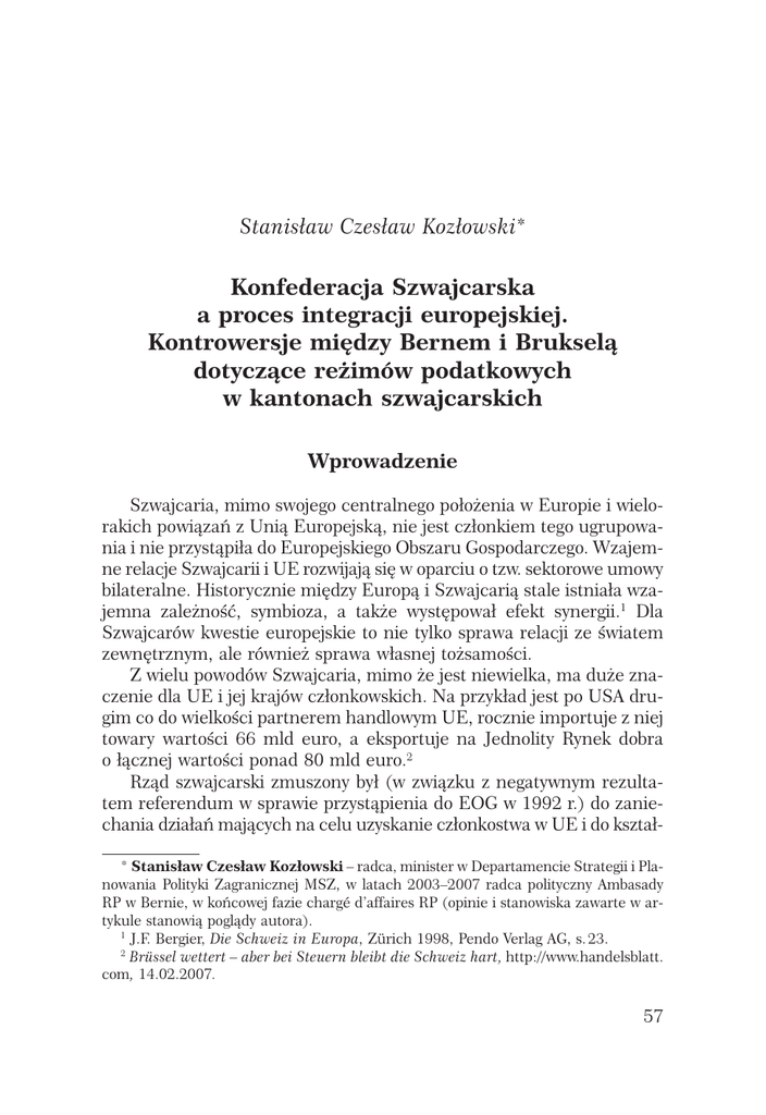 Stanisław Czesław Kozłowski* Konfederacja Szwajcarska a proces integracji europejskiej. Kontrowersje mi´dzy Bernem i Brukselà dotyczàce re˝imów podatkowych w kantonach szwajcarskich Wprowadzenie Szwajcaria, mimo swojego centralnego poło˝enia w Europie i wielorakich powiàzaƒ z Unià Europejskà, nie jest członkiem tego ugrupowania i nie przystàpiła do Europejskiego Obszaru Gospodarczego. Wzajemne relacje Szwajcarii i UE rozwijajà si´ w oparciu o tzw. sektorowe umowy bilateralne. Historycznie mi´dzy Europà i Szwajcarià stale istniała wzajemna zale˝noÊç, symbioza, a tak˝e wyst´pował efekt synergii.1 Dla Szwajcarów kwestie europejskie to nie tylko sprawa relacji ze Êwiatem zewn´trznym, ale równie˝ sprawa własnej to˝samoÊci. Z wielu powodów Szwajcaria, mimo ˝e jest niewielka, ma du˝e znaczenie dla UE i jej krajów członkowskich. Na przykład jest po USA drugim co do wielkoÊci partnerem handlowym UE, rocznie importuje z niej towary wartoÊci 66 mld euro, a eksportuje na Jednolity Rynek dobra o łàcznej wartoÊci ponad 80 mld euro.2 Rzàd szwajcarski zmuszony był (w zwiàzku z negatywnym rezultatem referendum w sprawie przystàpienia do EOG w 1992 r.) do zaniechania działaƒ majàcych na celu uzyskanie członkostwa w UE i do kształ* Stanisław Czesław Kozłowski – radca, minister w Departamencie Strategii i Planowania Polityki Zagranicznej MSZ, w latach 2003–2007 radca polityczny Ambasady RP w Bernie, w koƒcowej fazie chargé d’affaires RP (opinie i stanowiska zawarte w artykule stanowià poglàdy autora). 1 J.F. Bergier, Die Schweiz in Europa, Zürich 1998, Pendo Verlag AG, s. 23. 2 Brüssel wettert – aber bei Steuern bleibt die Schweiz hart, http://www.handelsblatt. com, 14.02.2007. 57 Studia Europejskie, 2/2009 towania relacji na bazie rozwiàzaƒ poÊrednich, którymi stały si´ od tego czasu umowy bilateralne. Droga umów bilateralnych jako podstawa rozwoju stosunków z UE cieszy si´ poparciem wi´kszoÊci obywateli i zyskała rang´ priorytetowej strategii rozwoju relacji szwajcarsko-unijnych. W trakcie realizacji tej strategii Szwajcaria zawarła ok. 20 bilateralnych umów sektorowych, wokół których wytworzona została bogata sieç wzajemnych powiàzaƒ sprawiajàcych, ˝e stosunki szwajcarsko-unijne majà cechy uprzywilejowanego partnerstwa.3 PodejÊcie Szwajcarii do procesu integracji europejskiej to kluczowa kwestia jej polityki zagranicznej, a zarazem przedmiot debaty wewnàtrzpolitycznej na przestrzeni ostatniego półwiecza. Berno wprawdzie zawsze doceniało znaczenie projektu europejskiego, głównie w aspekcie jego wpływu na umocnienie pokoju i bezpieczeƒstwa, niemniej swoje relacje z Europà kształtowało w pierwszej kolejnoÊci przez pryzmat interesów gospodarczych. To właÊnie interesy gospodarcze, przede wszystkim koniecznoÊç zapewnienia dost´pu do rynku europejskiego, oraz silnie zakorzeniona instytucja demokracji bezpoÊredniej determinowały kurs, którym podà˝ała Szwajcaria w swej polityce europejskiej.4 Badania opinii publicznej wykazujà, ˝e od 46 do 66 proc. społeczeƒstwa jest za członkostwem w UE.5 WielkoÊç ta si´ waha, a w ostatnich latach, charakteryzujàcych si´ intensywnymi kontaktami z UE, poparcie dla akcesji było na poziomie poni˝ej 50 proc. C. Longchamp, który w ramach prac Szwajcarskiego Towarzystwa Badaƒ Socjologicznych realizował projekt badawczy Barometr Europejski, tu˝ po dwu zwyci´skich referendach w sprawach europejskich w czerwcu i wrzeÊniu 2005 r. uzyskał wyniki stanowiàce podstaw´ oceny, i˝ oba głosowania (referenda) wprawdzie umocniły klimat otwarcia Szwajcarii na zewnàtrz, ale nie miały wpływu na podejÊcie jej mieszkaƒców do członkostwa w UE. Pozostawało ono niepopularne i gdyby Szwajcarzy mieli decydowaç o tym w koƒcu 2005 r., 54 proc. byłoby przeciw lub raczej przeciw, a 37 proc. za lub raczej za. JeÊli chodzi natomiast o podejÊcie Unii Europejskiej, paƒstw członkowskich i instytucji europejskich, sà one generalnie gotowe do poparcia członkostwa Szwajcarii. Badania Eurobarometru regularnie sugerujà, ˝e ok. 78 proc. obywateli UE widziałoby ten kraj w UE. 3 Ch. Calliess, Die Privilegierte Partnerschaft der Schweiz als Modell für die Er weiterungsfrage der EU w Schriftenreihe des Arbeitskreises Europäische Integration e.V. 61, Nomos Verlag, Baden-Baden 2008. 4 Center for Security Studies, ETH Zürich; „CSS Analysen zur Sicherheitspolitik” no. 37, Juli 2008. 5 Schweizerische Gesellschaft für praktische Sozialforschung, http://www.polittrends. ch/bereiche/eurobaro.php. 58 S.Cz. Kozłowski, Konfederacja Szwajcarska a proces integracji... 1. Podstawy prawne i główne kierunki rozwoju relacji Szwajcarii i UE Podstaw´ rozwoju współpracy Szwajcarii z Unià Europejskà i jej paƒstwami członkowskimi stanowi ok. 20 sektorowych umów bilateralnych, których dotychczasowa implementacja sprawiła, ˝e charakter wzajemnych stosunków okreÊla si´ niekiedy jako integracj´ bez członkostwa. Osiàgni´ty wysoki poziom współpracy nie oznacza jednak, ˝e rozwój tych relacji wolny jest od trudnoÊci. Odzwierciedla to trwajàcy od 2005 r. spór podatkowy, który omówiony jest szerzej w dalszej cz´Êci artykułu. Sektorowe umowy bilateralne Szwajcaria – UE w połàczeniu z tzw. autonomicznà implementacjà unijnego dorobku prawnego, przy jednoczesnym zachowaniu pełnej suwerennoÊci i nienaruszalnoÊci specyfiki systemu politycznego,6 to podstawowe elementy realizowanej od 1992 r. strategii współpracy z UE. Doprowadziło to Szwajcari´ do takiego zakresu powiàzaƒ z UE, który daje podstawy, by postrzegaç je jako integracj´ bez członkostwa lub uprzywilejowane partnerstwo.7 Retrospektywne spojrzenie na relacje Szwajcarii i UE w okresie od powstania Wspólnot Europejskich w roku 1957 do dziÊ pozwala wyró˝niç cztery zasadnicze fazy ich rozwoju. W pierwszej fazie, przypadajàcej na okres 1957–1971, Szwajcaria nie znalazła powodów
