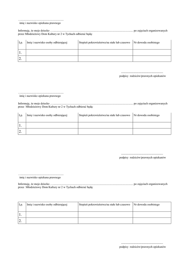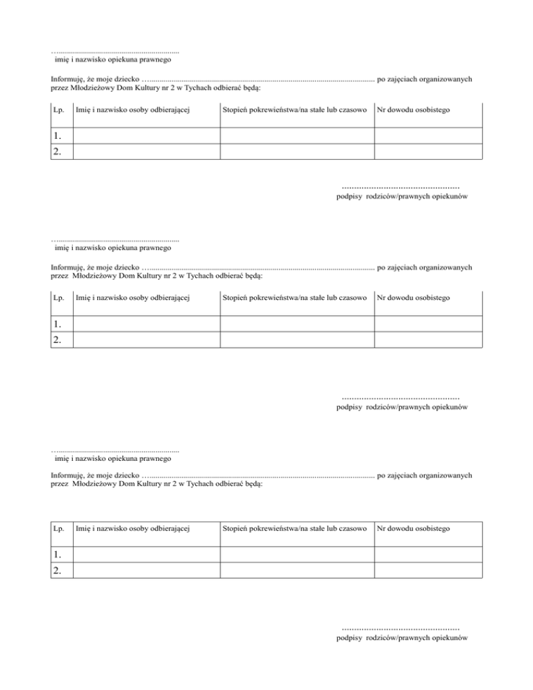 …............................................................ imię i nazwisko opiekuna prawnego Informuję, że moje dziecko …................................................................................................................ po zajęciach organizowanych przez Młodzieżowy Dom Kultury nr 2 w Tychach odbierać będą: Lp. Imię i nazwisko osoby odbierającej Stopień pokrewieństwa/na stałe lub czasowo Nr dowodu osobistego 1. 2. ................................................ podpisy rodziców/prawnych opiekunów …............................................................ imię i nazwisko opiekuna prawnego Informuję, że moje dziecko …................................................................................................................ po zajęciach organizowanych przez Młodzieżowy Dom Kultury nr 2 w Tychach odbierać będą: Lp. Imię i nazwisko osoby odbierającej Stopień pokrewieństwa/na stałe lub czasowo Nr dowodu osobistego 1. 2. ................................................ podpisy rodziców/prawnych opiekunów …............................................................ imię i nazwisko opiekuna prawnego Informuję, że moje dziecko …................................................................................................................ po zajęciach organizowanych przez Młodzieżowy Dom Kultury nr 2 w Tychach odbierać będą: Lp. Imię i nazwisko osoby odbierającej Stopień pokrewieństwa/na stałe lub czasowo Nr dowodu osobistego 1. 2. ................................................ podpisy rodziców/prawnych opiekunów