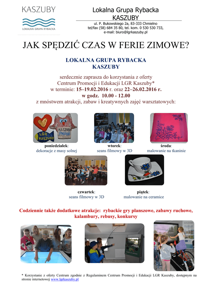 Lokalna Grupa Rybacka KASZUBY ul. P. Bukowskiego 2a, 83-333 Chmielno tel/fax (58) 684 35 80, tel. kom. 0 530 530 733, e-mail: [email protected] JAK SPĘDZIĆ CZAS W FERIE ZIMOWE? LOKALNA GRUPA RYBACKA KASZUBY serdecznie zaprasza do korzystania z oferty Centrum Promocji i Edukacji LGR Kaszuby* w terminie: 15–19.02.2016 r. oraz 22–26.02.2016 r. w godz. 10.00 - 12.00 z mnóstwem atrakcji, zabaw i kreatywnych zajęć warsztatowych: poniedziałek: dekoracje z masy solnej wtorek: seans filmowy w 3D czwartek: seans filmowy w 3D środa: malowanie na tkaninie piątek: malowanie na ceramice Codziennie także dodatkowe atrakcje: rybackie gry planszowe, zabawy ruchowe, kalambury, rebusy, konkursy * Korzystanie z oferty Centrum zgodnie z Regulaminem Centrum Promocji i Edukacji LGR Kaszuby, dostępnym na stronie internetowej www.lgrkaszuby.pl