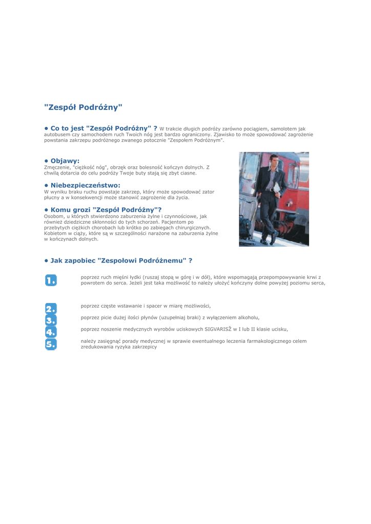 "Zespół Podróżny" • Co to jest "Zespół Podróżny" ? W trakcie długich podróży zarówno pociągiem, samolotem jak autobusem czy samochodem ruch Twoich nóg jest bardzo ograniczony. Zjawisko to może spowodować zagrożenie powstania zakrzepu podróżnego zwanego potocznie "Zespołem Podróżnym". • Objawy: Zmęczenie, "ciężkość nóg", obrzęk oraz bolesność kończyn dolnych. Z chwilą dotarcia do celu podróży Twoje buty stają się zbyt ciasne. • Niebezpieczeństwo: W wyniku braku ruchu powstaje zakrzep, który może spowodować zator płucny a w konsekwencji może stanowić zagrożenie dla życia. • Komu grozi "Zespół Podróżny"? Osobom, u których stwierdzono zaburzenia żylne i czynnościowe, jak również dziedziczne skłonności do tych schorzeń. Pacjentom po przebytych ciężkich chorobach lub krótko po zabiegach chirurgicznych. Kobietom w ciąży, które są w szczególności narażone na zaburzenia żylne w kończynach dolnych. • Jak zapobiec "Zespołowi Podróżnemu" ? poprzez ruch mięśni łydki (ruszaj stopą w górę i w dół), które wspomagają przepompowywanie krwi z powrotem do serca. Jeżeli jest taka możliwość to należy ułożyć kończyny dolne powyżej poziomu serca, poprzez częste wstawanie i spacer w miarę możliwości, poprzez picie dużej ilości płynów (uzupełniaj braki) z wyłączeniem alkoholu, poprzez noszenie medycznych wyrobów uciskowych SIGVARISŽ w I lub II klasie ucisku, należy zasięgnąć porady medycznej w sprawie ewentualnego leczenia farmakologicznego celem zredukowania ryzyka zakrzepicy