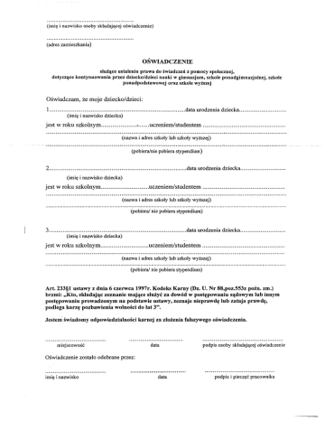 (imię i nazwisko osoby składającej oświadczenie) (adres zamieszkania) OŚWIADCZENIE służące ustaleniu prawa do świadczeń z pomocy społecznej, dotyczące kontynuowania przez dziecko/dzieci nauki w gimnazjum, szkole ponadgimnazjalnej, szkole ponadpodstawowej oraz szkole wyższej Oświadczam, że moje dziecko/dzieci: 1.00 •.......... o •• o ••••• o •••••••• o ••••••••••••••••••••••• data urodzenia dziecka o •••••••••••••••••••••••••••• o (imię i nazwisko dziecka) jest w roku szko1nym :o •••••• uczeniem/studentem o; •••••••••••••••••••••••••••• o •••••••••••••••• o (nazwa i adres szkoły lub szkoły wyższej) (pobiera!nie pobiera stypendium) 2 data urodzenia dziecka o ••••••••••••••••••••••••• o ••• (imię i nazwisko dziecka) jest w roku szkolnym uczeniem/studentem o •••••••• o •• o ••••••••••••••••• o" (nazwa i adres szkoły lub szkoły wyższej) (pobiera! nie pobiera stypendium) 3 o ••••• data urodzenia dziecka o ••••••••• (imię i nazwisko dziecka) jest w roku szkolnym 0 •••••••••••••• uczeniem/studentem o ••••••••••••••••••••••••••••• 0 ••••• (nazwa i adres szkoły lub szkoły wyższej) (pobiera! nie pobiera stypendium) Art. 233§lustawy z dnia 6 czerwca 1997r. Kodeks Karny (Dz. U. Nr 88,poz.553z poźn. zm.) brzmi: "Kto, składąjąc zeznanie mające służyć za dowód w postępowaniu sądowym lub innym . postępowaniu prowadzonym na pods'tawie ustawy, zeznaje nieprawdę lub zataja prawdę, podlega .karzę pozbawienia wolności do lat 3". Jestem świadomy odpowiedzialności miejscowość karnej za złożenia fałszywego oświadczenia. data podpis osoby składającej oświadczenie Oświadczenie zostało odebrane przez: imię i nazwisko data podpis i pieczęć pracownika
