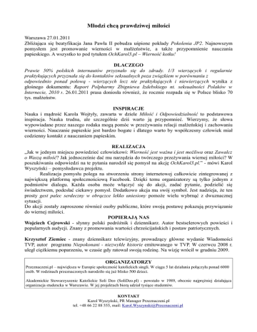 Młodzi chcą prawdziwej miłości Warszawa 27.01.2011 Zbliżająca się beatyfikacja Jana Pawła II pobudza uśpione pokłady Pokolenia JP2. Najnowszym pomysłem jest promowanie wierności w małżeństwie, a także przypomnienie nauczania papieskiego. A wszystko to pod tytułem OchKarol3.pl – Wierność kotku! DLACZEGO Prawie 50% polskich internautów przyznało się do zdrady. 1/3 wierzących i regularnie praktykujących przyznała się do kontaktów seksualnych poza związkiem w porównaniu z odpowiednio ponad połową - wierzących lecz nie praktykujących i niewierzących wynika z głośnego dokumentu: Raport Polpharmy Zbigniewa Izdebskiego nt. seksualności Polaków w Internecie, 2010 r. 26.01.2011 prasa doniosła również, że rocznie rozpada się w Polsce blisko 70 tys. małżeństw. INSPIRACJE Nauka i mądrość Karola Wojtyły, zawarta w dziele Miłość i Odpowiedzialność to podstawowa inspiracja. Nauka trudna, ale szczególnie dziś warto ją przypomnieć. Wierzymy, że słowa wypowiadane przez naszego rodaka mogą pomóc w przeżywaniu relacji małżeńskiej i zachowaniu wierności. Nauczanie papieskie jest bardzo bogate i dlatego warto by współczesny człowiek miał codzienny kontakt z nauczaniem papieskim. REALIZACJA „Jak w jednym miejscu powiedzieć człowiekowi: Wierność jest ważna i jest możliwa oraz Zawalcz o Waszą miłość? Jak jednocześnie dać mu narzędzia do twórczego przeżywania wiernej miłości? W poszukiwaniu odpowiedzi na te pytania narodził się pomysł na akcję OchKarol3.pl.” - mówi Karol Wyszyński – pomysłodawca projektu. Realizacja pomysłu polega na stworzeniu strony internetowej całkowicie zintegrowanej z największą platformą społecznościową Facebook. Dzięki temu organizatorzy są tylko jednym z podmiotów dialogu. Każda osoba może włączyć się do akcji, zadać pytanie, podzielić się świadectwem, podesłać ciekawy pomysł. Dodatkowo akcja ma swój symbol. Jest nadzieja, że ten prosty gest palec serdeczny w obrączce lekko uniesiony pomoże wielu wybrnąć z dwuznacznej sytuacji. Do akcji zostały zaproszone również osoby publiczne, które swoją postawę pokazują przywiązanie do wiernej miłości. POPIERAJĄ NAS Wojciech Cejrowski - słynny polski podróżnik i dziennikarz. Autor bestselerowych powieści i popularnych audycji. Znany z promowania wartości chrześcijańskich i postaw patriotycznych. Krzysztof Ziemiec - znany dziennikarz telewizyjny, prowadzący główne wydanie Wiadomości TVP, autor programu Niepokonani - niezwykłe historie emitowanego w TVP. W czerwcu 2008 r. uległ ciężkiemu poparzeniu, w czasie gdy ratował swoją rodzinę. Na wizję wrócił w grudniu 2009. ORGANIZATORZY Przeznaczeni.pl – największa w Europie społeczność katolickich singli. W ciągu 5 lat działania połączyła ponad 6000 osób. W rodzinach przeznaczonych narodziło się już blisko 500 dzieci. Akademickie Stowarzyszenie Katolickie Soli Deo (SoliDeo.pl) - powstało w 1989, obecnie najprężniej działająca organizacja studencka w Warszawie. W jej projektach biorą udział tysiące studentów. KONTAKT Karol Wyszyński, PR Manager Przeznaczeni.pl tel. +48 66 22 88 555, mail: [email protected]
