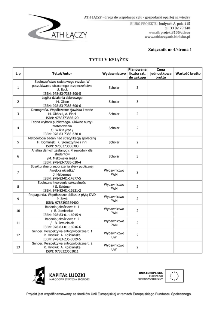 Załącznik nr 4/strona 1 TYTUŁY KSIĄŻEK L.p 1 2 3 4 5 6 7 8 9 10 11 12 13 Tytuł/Autor Społeczeństwo światowego ryzyka. W poszukiwaniu utraconego bezpieczeństwa U. Beck ISBN: 978-83-7383-300-5 Logika działania zbiorowego M. Olson ISBN: 978-83-7383-600-6 Demografia. Współczesne zjawiska i teorie M. Okólski, A. Fihel ISBN: 9788373836129 Teoria wyboru publicznego. Główne nurty i zastosowania /J. Wilkin /red./ ISBN: 978-83-7383-628-0 Metodologia badań nad stratyfikacją społeczną H. Domański, K. Słomczyński i inni ISBN: 9788373836303 Analiza danych zastanych. Przewodnik dla studentów /M. Makowska /red./ ISBN: 978-83-7383-620-4 Strukturalne przeobrażenia sfery publicznej /miękka okładka/ J. Habermas ISBN: 978-83-01-14877-5 Społeczne tworzenie seksualności / S. Seidman ISBN: 978-83-01-16931-2 Propaganda. Współczesne oblicza z płytą DVD P. Znyk ISBN: 9788393359400 Badania jakościowe t. 1 / B. Jemielniak ISBN: 978-83-01-16945-9 Badania jakościowe t. 2 / B. Jemielniak ISBN: 978-83-01-16946-6 Gender. Perspektywa antropologiczna t. 1 R. Hryciuk, A. Kościańska ISBN: 978-83-235-0309-5 Gender. Perspektywa antropologiczna t. 2 R. Hryciuk, A. Kościańska ISBN: 9788323503811 Wydawnictwo Planowana liczba szt. do zakupu Scholar 3 Scholar 3 Scholar 2 Scholar 2 Scholar 2 Scholar 3 Wydawnictwo PWN 2 Wydawnictwo PWN 2 Wydawnictwo PWN 2 Wydawnictwo PWN 2 Wydawnictwo PWN 2 Wydawnictwo UW 2 Wydawnictwo UW 2 Cena jednostkowa brutto Wartość brutto Załącznik nr 4/strona 2 14 15 16 17 18 19 20 21 22 23 24 25 26 27 28 Style życia, wartości, obyczaje A.Jawłowska, W. Pawlik, B. Fatyga ISBN: 978-83-235-0907-3 Storytelling. Narracja w reklamie i biznesie K. Fog, Ch. Budtz, P. Munch, S. Blanchette ISBN: 978-83-932399-0-0 Korozja charakteru / R. Sennett ISBN: 83-7495-013-7 Efektywna komunikacja w zespole / B. Rzepka ISBN: 978-83-7788-170-5 Propaganda dobrych serc, czyli pierwszy tom o reklamie społecznej D. Maison, P. Wasilewski /red./ ISBN: 978-83-924039-1-3 Szlachetna propaganda dobroci, czyli drugi tom o reklamie społecznej D. Maison, P. Wasilewski /red./ ISBN: 978-83-924039-0-6 Sztuka public relations. Z doświadczeń polskich praktyków ISBN: 978-83-923262-2-9 Praktycznie o PR. Case Studies projektów nagrodzonych w konkursie ZFPR Złote Spinacze ISBN: 978-83-923262-1-2 Straty uboczne / Z. Bauman ISBN: 978-83-233-3306-7 Kultura zabawy T. Paleczny, R. Kantor, M. Banaszkiewicz ISBN: 978-83-233-3386-9 Budowanie zespołów. Materiały szkoleniowe, ćwiczenia, formularze, wskazówki dla prowadzącego zestaw z CD M. Kossowska, I. Sołtysińska ISBN: 978-83-264-1457-2 Aktywne ćwiczenia szkoleniowe. Uczenie przez doświadczenie zestaw z CD / M. Silberman ISBN: 978-83-264-1456-5 Zarządzanie kapitałem ludzkim. Uzyskiwanie wartości dodanej dzięki ludziom M.Armstrong, A. Baron ISBN: 978-83-264-4098-4 Efekt Facebooka / D. Kirkpatrick ISBN: 978-83-264-1173-1 Nowoczesność jako źródło cierpień / M. Shore ISBN: 978-83-62467-89-1 Wydawnictwo UW 2 Saatchi&Saatchi 3 MUZA SA 2 Samo sedno 3 Agencja Wasilewski 2 Agencja Wasilewski 2 Związek Firm PR 3 Związek Firm PR 3 Wydawnictwo UJ 2 Wydawnictwo UJ 2 Wolters Kluwer 1 Wolters Kluwer 1 Wolters Kluwer 2 Wolters Kluwer 2 Krytyka Polityczna 2 Załącznik nr 4/strona 3 29 30 31 32 Żywe lalki. Powrót seksizmu / N. Walter ISBN: 978-83-7554-204-2 Marketing 3.0 / P. Kotler ISBN: 978-83-62195-92-3 Marketing szeptany / M. Hugehes ISBN: 978-83-61040-04-0 Człowiek w teatrze życia codziennego E. Goffman ISBN: 978-83-61182-19-1 Czarna owca 2 MT Biznes 2 MT Biznes 2 Aletheia 2 Razem wartość brutto: ..................................................... (Data) ……………………………………………………….. (Podpis i pieczęć osoby upoważnionej do składania oświadczeń w imieniu Wykonawcy)