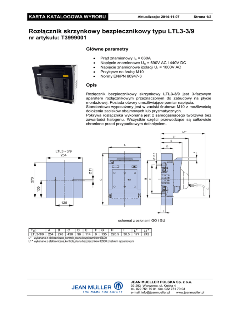 KARTA KATALOGOWA WYROBU Aktualizacja: 2014-11-07 Strona 1/2 Rozłącznik skrzynkowy bezpiecznikowy typu LTL3-3/9 nr artykułu: T3999001 Główne parametry • • • • • Prąd znamionowy I n = 630A Napięcie znamionowe U n = 690V AC i 440V DC Napięcie znamionowe izolacji U i = 1000V AC Przyłącze na śrubę M10 Normy EN/PN 60947-3 Opis Rozłącznik bezpiecznikowy skrzynkowy LTL3-3/9 jest 3-fazowym aparatem rozłącznikowym przeznaczonym do zabudowy na płycie montażowej. Posiada otwory umożliwiające pomiar napięcia. Standardowo wyposażony jest w zaciski śrubowe M10 z możliwością dołożenia zacisków obejmowych lub pryzmatycznych. Pokrywa rozłącznika wykonana jest z samogasnącego tworzywa bez zawartości halogenu. Wszystkie części przewodzące są całkowicie chronione przed przypadkowym dotknięciem. schemat z osłonami GO i GU Typ A B C D E F G H I L٭ LTL3-3/9 254 270 430 96 114 9 135 220.5 30.5 177 L ٭wykonane z elektroniczną kontrolą stanu bezpieczników ES00 L1 ٭wykonane z elektroniczną kontrolą stanu bezpieczników ES00 z kablem łączeniowym L1٭ 242 JEAN MUELLER POLSKA Sp. z o.o. 02-293 Warszawa, ul. Krótka 4 tel. 022 751 79 01, fax. 022 751 79 03 e-mail: [email protected] www.jeanmueller.pl KARTA KATALOGOWA WYROBU Aktualizacja: 2014-11-07 Strona 2/2 Rozłącznik skrzynkowy bezpiecznikowy typu LTL3-3/9 nr artykułu: T3999001 DANE TECHNICZNE Parametry elektryczne Napięcie znamionowe łączeniowe Prąd znamionowy łączeniowy Prąd cieplny z wkładką topikową Prąd cieplny ze zworą Częstotliwość znamionowa Napięcie znamionowe izolacji Warunkowy znamionowy prąd zwarciowy Prąd znamionowy krótkotrwały wytrzymywany Kategoria użytkowania Napięcie znamionowe udarowe wytrzymywane Elektryczny okres użytkowania (cykle łączeniowe) Strata mocy przy I th (bez wkładki topikowej) Wkładki bezpiecznikowe Un In I th I th Ui I cc I cw V A A A Hz V kA eff kA eff - - U imp Pv kV W Wielkość wg. normy DIN 43620 Maksymalny prąd znamionowy (gL/gG) Maksymalna dopuszczalna strata mocy na wkładce topikowej 690 AC/440 DC 630 630 910 (TM3) 40-60 1000 AC 80 AC-22B (690V/500A) AC-22B (500V/630A) DC-21B (440V/500A) DC-22B (220V/630A) 8 200 52 3 630A 48W Parametry mechaniczne Mechaniczny okres użytkowania (cykle łączeniowe) 800 Przyłącze kablowe Stopień ochrony Od strony czołowej (aparat zabudowany) Przekrój zaciskanych kabli Moment dokręcenia Ma mm2 Nm Stan pracy Pokrywa przednia otwarta Śruba M10 1 x 25-300 30-35 IP20 IP10 Warunki pracy Temperatura otoczenia Zakładany tryb pracy Uruchomienie Położenie montażowe Maksymalna wysokość montażu Stopień zabrudzenia Kategoria przepięcia Tu °C m - 25 do + 55 praca ciągła zależne uruchomienie ręczne w poziomie i w pionie do 2000 3 III JEAN MUELLER POLSKA Sp. z o.o. 02-293 Warszawa, ul. Krótka 4 tel. 022 751 79 01, fax. 022 751 79 03 e-mail: [email protected] www.jeanmueller.pl