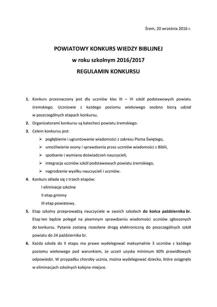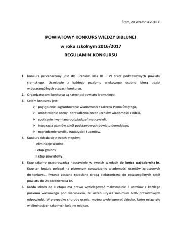 POWIATOWY KONKURS WIEDZY BIBLIJNEJ w roku szkolnym 2016