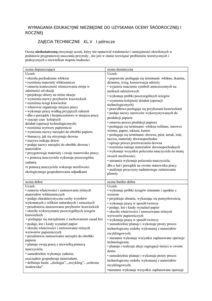 WYMAGANIA EDUKACYJNE NIEZBĘDNE DO UZYSKANIA OCENY ŚRÓDROCZNEJ I ROCZNEJ ZAJĘCIA TECHNICZNE KL.V I półrocze Ocenę niedostateczną otrzymuje uczeń, który nie opanował wiadomości i umiejętności określonych w podstawie programowej nauczania przyrody , nie jest w stanie rozwiązać problemów teoretycznych i praktycznych o niewielkim stopniu trudności. ocena dopuszczająca Uczeń: • określa pochodzenie włókien • rozróżnia materiały włókiennicze • omawia konieczność różnicowania stroju w zależności od okazji • projektuje ubiory na różne okazje • wymienia nazwy przyborów krawieckich • rozróżnia ściegi krawieckie • właściwie organizuje miejsce pracy • wykonuje pracę według przyjętych założeń • dba o porządek i bezpieczeństwo w miejscu pracy • szacuje czas kolejnych działań (operacji technologicznych) • rozróżnia wytwory papiernicze • wymienia nazwy narzędzi do obróbki papieru • tłumaczy, jak się otrzymuje drewno • nazywa rodzaje drzew • podaje nazwy narzędzi do obróbki drewna i materiałów • przygotowuje materiały i swoje stanowisko pracy; • z pomocą nauczyciela wykonuje poszczególne zadania. •z pomocą nauczyciela wskazuje możliwości ekologicznego gospodarowania odpadkami ocena dostateczna Uczeń: • poprawnie posługuje się terminami: włókno, tkanina, dzianina, ścieg, konserwacja odzieży • wyjaśnia znaczenie symboli umieszczonych na metkach odzieżowych • wykonuje próbki poszczególnych ściegów • wymienia kolejność działań (operacji technologicznych) • prawidłowo posługuje się przyborami krawieckimi • podaje nazwy surowców wykorzystywanych do produkcji papieru • omawia proces produkcji papieru • posługuje się terminami: włókna roślinne, surowce wtórne, papier, tektura, karton • posługuje się terminami: drewno, pień, tartak, trak, tarcica, materiały drewnopochodne • opisuje proces przetwarzania drewna • rozróżnia rodzaje materiałów drewnopochodnych • wykonuje wszystkie polecenia nauczyciela na miarę swoich możliwości; • starannie wykonuje polecenia nauczyciela; dba o ład i porządek na swoim stanowisku pracy. • analizuje przyczyny nadmiernego zaśmiecania planety. ocena dobra Uczeń: • omawia właściwości i zastosowanie różnych materiałów włókienniczych • podaje charakterystyczne cechy wyrobów wykonanych z włókien naturalnych i sztucznych • przedstawia zastosowanie przyborów krawieckich • określa wykorzystanie poszczególnych ściegów krawieckich • posługuje się narzędziami z zachowaniem zasad bez • podaje, kto i kiedy wynalazł papier • określa właściwości i zastosowanie różnych wytworów papierniczych • przedstawia zastosowanie narzędzi do obróbki papieru • planuje swoją pracę z niewielką pomocą nauczyciela; • samodzielnie wykonuje zadania; oszczędnie gospodaruje materiałami. • definiuje hasła: „ekologia”, „recykling”, „ochrona środowiska”. ocena bardzo dobra Uczeń: • wykonuje próbki ściegów starannie i zgodnie z wzorem • projektuje ubrania, wykazując się pomysłowością • wykonuje pracę w sposób twórczy • podaje, kto i kiedy wynalazł papier • określa właściwości i zastosowanie różnych wytworów papierniczych • wykonuje pracę w sposób twórczy • samodzielnie planuje i wykonuje prosty proces technologiczny ozdoby wykonanej z materiałów recyklingowych; • starannie wykonuje wszystkie zaplanowane operacje technologiczne. • planuje i realizuje akcje segregacji śmieci w swoim domu • samodzielnie planuje i wykonuje prosty proces technologiczny ozdoby wykonanej z materiałów recyklingowych; •starannie wykonuje wszystkie zaplanowane operacje technologiczne. ocena celująca Uczeń: • wykazuje się kreatywnymi pomysłami; planuje, wykonuje i realizuje proces technologiczny niepowtarzalnej ozdoby wykonanej z materiałów recyklingowych. • porównuje półprodukty drewniane podając ich zastosowanie; • ocenia elementy konstrukcyjne wykonane z drewna pod względem wytrzymałości materiału. • bierze udział w konkursach technicznych wewnątrzszkolnych i zewnętrznych. • wykazuje się kreatywnymi pomysłami; •projektuje ubrania, wykazując się pomysłowością • wykonuje pracę w sposób twórczy II półrocze ocena dopuszczająca Uczeń: • właściwie organizuje miejsce pracy • wymienia kolejność działań (operacji technologicznych) • prawidłowo posługuje się narzędziami do obróbki papieru, materiałów włókienniczych i tworzyw sztucznych • wykonuje pracę według przyjętych założeń • dba o porządek i bezpieczeństwo w miejscu pracy ocena dobra Uczeń: •planuje swoją pracę z niewielką pomocą nauczyciela; •samodzielnie wykonuje zadania; ocena dostateczna Uczeń: • wymienia kolejność działań (operacji technologicznych) • wyjaśnia, do czego wykorzystuje się rysunek techniczny • rozpoznaje poszczególne narzędzia kreślarskie i pomiarowe • prawidłowo posługuje się przyborami do kreślenia i pomiaru • posługuje się terminem: normalizacja • wyjaśnia, do czego używa się pisma technicznego • odwzorowuje pismem technicznym poszczególne litery i cyfry • podaje wysokość i szerokość znaków pisma technicznego • stosuje pismo techniczne do zapisania określonych wyrazów ocena bardzo dobra Uczeń: • tłumaczy, dlaczego rysunek techniczny opisuje się za pomocą uniwersalnego języka technicznego oszczędnie gospodaruje materiałami • podaje wzory charakterystycznych wielkości pisma technicznego; • oblicza wielkości pisma technicznego; •samodzielnie pisze pismem technicznym starając kreślić litery na miarę swoich możliwości. • podaje przykłady przedmiotów wykonanych z różnego rodzaju tworzyw • określa właściwości tworzyw • przedstawia zastosowanie narzędzi do obróbki tworzyw sztucznych • określa funkcję narzędzi kreślarskich i pomi