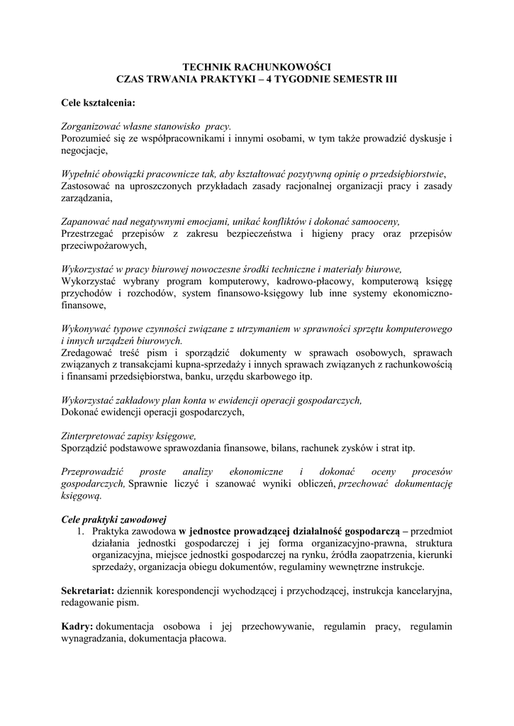 TECHNIK RACHUNKOWOŚCI CZAS TRWANIA PRAKTYKI – 4 TYGODNIE SEMESTR III Cele kształcenia: Zorganizować własne stanowisko pracy. Porozumieć się ze współpracownikami i innymi osobami, w tym także prowadzić dyskusje i negocjacje, Wypełnić obowiązki pracownicze tak, aby kształtować pozytywną opinię o przedsiębiorstwie, Zastosować na uproszczonych przykładach zasady racjonalnej organizacji pracy i zasady zarządzania, Zapanować nad negatywnymi emocjami, unikać konfliktów i dokonać samooceny, Przestrzegać przepisów z zakresu bezpieczeństwa i higieny pracy oraz przepisów przeciwpożarowych, Wykorzystać w pracy biurowej nowoczesne środki techniczne i materiały biurowe, Wykorzystać wybrany program komputerowy, kadrowo-płacowy, komputerową księgę przychodów i rozchodów, system finansowo-księgowy lub inne systemy ekonomicznofinansowe, Wykonywać typowe czynności związane z utrzymaniem w sprawności sprzętu komputerowego i innych urządzeń biurowych. Zredagować treść pism i sporządzić dokumenty w sprawach osobowych, sprawach związanych z transakcjami kupna-sprzedaży i innych sprawach związanych z rachunkowością i finansami przedsiębiorstwa, banku, urzędu skarbowego itp. Wykorzystać zakładowy plan konta w ewidencji operacji gospodarczych, Dokonać ewidencji operacji gospodarczych, Zinterpretować zapisy księgowe, Sporządzić podstawowe sprawozdania finansowe, bilans, rachunek zysków i strat itp. Przeprowadzić proste analizy ekonomiczne i dokonać oceny procesów gospodarczych, Sprawnie liczyć i szanować wyniki obliczeń, przechować dokumentację księgową. Cele praktyki zawodowej 1. Praktyka zawodowa w jednostce prowadzącej działalność gospodarczą – przedmiot działania jednostki gospodarczej i jej forma organizacyjno-prawna, struktura organizacyjna, miejsce jednostki gospodarczej na rynku, źródła zaopatrzenia, kierunki sprzedaży, organizacja obiegu dokumentów, regulaminy wewnętrzne instrukcje. Sekretariat: dziennik korespondencji wychodzącej i przychodzącej, instrukcja kancelaryjna, redagowanie pism. Kadry: dokumentacja osobowa i jej przechowywanie, regulamin pracy, regulamin wynagradzania, dokumentacja płacowa. Komórki handlowe: źródła zaopatrzenia, dokumentacja zakupu, kierunki sprzedaży, dokumentacja sprzedaży, organizacja marketingu, stosunki jednostki gospodarczej z otoczeniem. Komórki finansowo-księgowe. Zakładowy plan kont. Formy i techniki ewidencji księgowej. Zasady prowadzenia ksiąg rachunkowych. Dokumentacja finansowo-księgowa. Ewidencja operacji na kontach syntetycznych i analitycznych. Wykorzystanie programów komputerowych w rachunkowości. Interpretacja zapisów księgowych. Uzgadnianie ewidencji syntetycznej i analitycznej. Rozliczenie z kontrahentami, instytucjami finansowymi oraz budżetem. Rozliczenia z pracownikami. Rachunek kosztów. 2. Praktyka w banku – działalność banku i jego struktura organizacyjna, zadania rachunkowości bankowej, zasady budowy bankowego planu kont, wpływ planu kont na rachunkowość bankową, środki techniczne i materiały wykorzystywane w banku, wykorzystanie programów komputerowych, obroty na rachunkach bankowych, zakładanie rachunków bankowych, dokumentacja obrotu bezgotówkowego, rodzaje kredytów bankowych, umowa kredytowa, rodzaje form oszczędzania, odsetki i prowizje, zasady obliczania, operacje walutowe. 3. Praktyka w urzędzie skarbowym – działalność urzędu skarbowego, struktura organizacyjna, rejestracja nowych przedsiębiorstw, nadanie numeru identyfikacji podatkowej, miesięczne rozliczanie i dokumentacja podatku VAT, formy podatku dochodowego od osób fizycznych i prawnych, dokumentacja i rozliczanie zaliczek na podatek dochodowy, rozliczenie roczne podatku dochodowego od osób fizycznych i prawnych, inne podatki i zasady ich uiszczania, opłaty skarbowe, skutki finansowe wynikające z nieuiszczenia podatków, postępowanie egzekucyjne, organizacja wpłat do budżetu, środki gospodarcze, wydatki i dochody urzędu skarbowego, zasady prowadzenia rachunkowości w urzędach skarbowych.