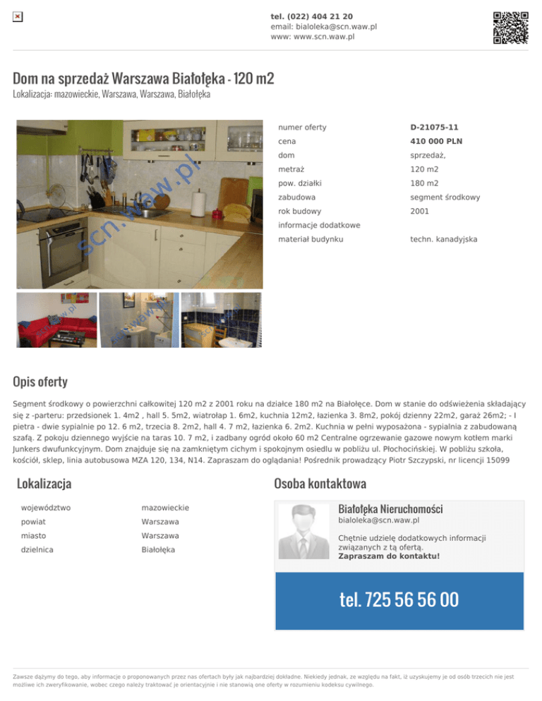 tel. (022) 404 21 20 email: [email protected] www: www.scn.waw.pl Dom na sprzedaż Warszawa Białołęka - 120 m2 Lokalizacja: mazowieckie, Warszawa, Warszawa, Białołęka numer oferty D-21075-11 cena 410 000 PLN dom sprzedaż, metraż 120 m2 pow. działki 180 m2 zabudowa segment środkowy rok budowy 2001 informacje dodatkowe materiał budynku techn. kanadyjska Opis oferty Segment środkowy o powierzchni całkowitej 120 m2 z 2001 roku na działce 180 m2 na Białołęce. Dom w stanie do odświeżenia składający się z -parteru: przedsionek 1. 4m2 , hall 5. 5m2, wiatrołap 1. 6m2, kuchnia 12m2, łazienka 3. 8m2, pokój dzienny 22m2, garaż 26m2; - I pietra - dwie sypialnie po 12. 6 m2, trzecia 8. 2m2, hall 4. 7 m2, łazienka 6. 2m2. Kuchnia w pełni wyposażona - sypialnia z zabudowaną szafą. Z pokoju dziennego wyjście na taras 10. 7 m2, i zadbany ogród około 60 m2 Centralne ogrzewanie gazowe nowym kotłem marki Junkers dwufunkcyjnym. Dom znajduje się na zamkniętym cichym i spokojnym osiedlu w pobliżu ul. Płochocińskiej. W pobliżu szkoła, kościół, sklep, linia autobusowa MZA 120, 134, N14. Zapraszam do oglądania! Pośrednik prowadzący Piotr Szczypski, nr licencji 15099 Lokalizacja Osoba kontaktowa Białołęka Nieruchomości województwo mazowieckie powiat Warszawa [email protected] miasto Warszawa dzielnica Białołęka Chętnie udzielę dodatkowych informacji związanych z tą ofertą. Zapraszam do kontaktu! tel. 725 56 56 00 Zawsze dążymy do tego, aby informacje o proponowanych przez nas ofertach były jak najbardziej dokładne. Niekiedy jednak, ze względu na fakt, iż uzyskujemy je od osób trzecich nie jest możliwe ich zweryfikowanie, wobec czego należy traktować je orientacyjnie i nie stanowią one oferty w rozumieniu kodeksu cywilnego.
