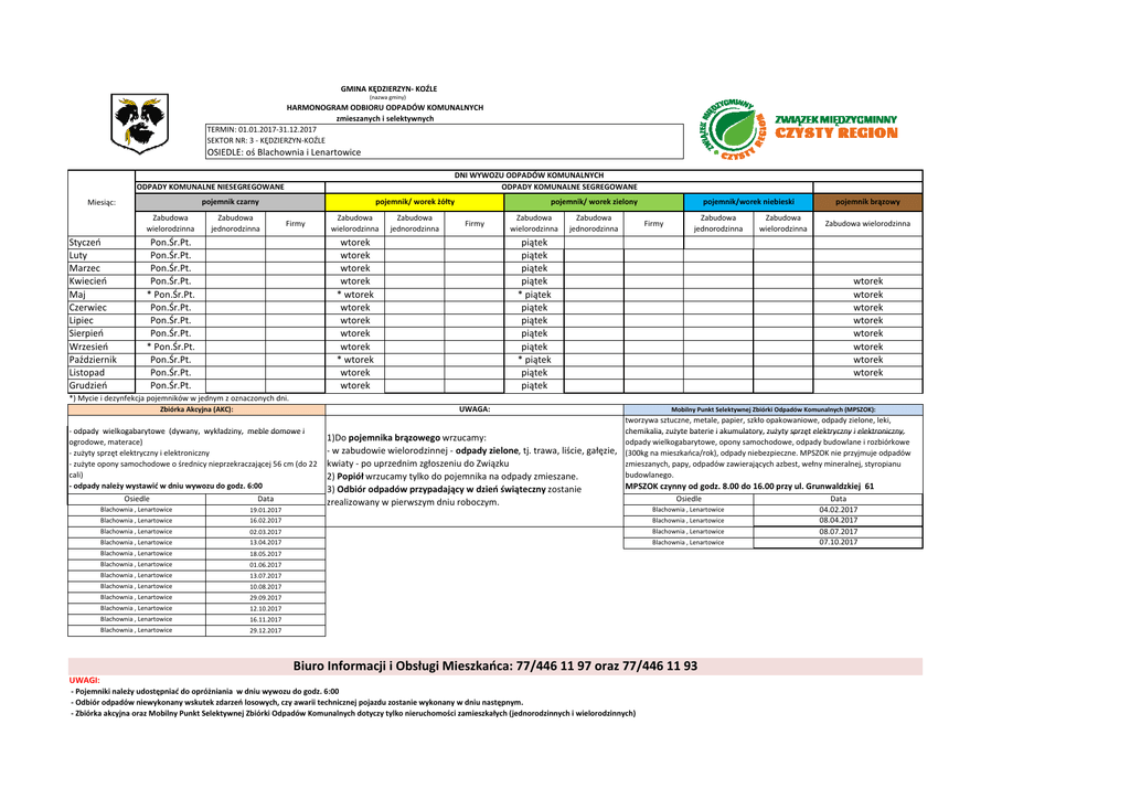 GMINA KĘDZIERZYN- KOŹLE (nazwa gminy) HARMONOGRAM ODBIORU ODPADÓW KOMUNALNYCH zmieszanych i selektywnych TERMIN: 01.01.2017-31.12.2017 SEKTOR NR: 3 - KĘDZIERZYN-KOŹLE OSIEDLE: oś Blachownia i Lenartowice DNI WYWOZU ODPADÓW KOMUNALNYCH ODPADY KOMUNALNE SEGREGOWANE ODPADY KOMUNALNE NIESEGREGOWANE pojemnik czarny Miesiąc: Zabudowa wielorodzinna Styczeń Luty Marzec Kwiecień Maj Czerwiec Lipiec Sierpień Wrzesień Październik Listopad Grudzień Zabudowa jednorodzinna pojemnik/ worek żółty Firmy Pon.Śr.Pt. Pon.Śr.Pt. Pon.Śr.Pt. Pon.Śr.Pt. * Pon.Śr.Pt. Pon.Śr.Pt. Pon.Śr.Pt. Pon.Śr.Pt. * Pon.Śr.Pt. Pon.Śr.Pt. Pon.Śr.Pt. Pon.Śr.Pt. Zabudowa wielorodzinna Zabudowa jednorodzinna pojemnik/ worek zielony Firmy wtorek wtorek wtorek wtorek * wtorek wtorek wtorek wtorek wtorek * wtorek wtorek wtorek Zabudowa wielorodzinna Zabudowa jednorodzinna pojemnik/worek niebieski Firmy Zabudowa jednorodzinna piątek piątek piątek piątek * piątek piątek piątek piątek piątek * piątek piątek piątek Zabudowa wielorodzinna pojemnik brązowy Zabudowa wielorodzinna wtorek wtorek wtorek wtorek wtorek wtorek wtorek wtorek *) Mycie i dezynfekcja pojemników w jednym z oznaczonych dni. UWAGA: Zbiórka Akcyjna (AKC): - odpady wielkogabarytowe (dywany, wykładziny, meble domowe i ogrodowe, materace) - zużyty sprzęt elektryczny i elektroniczny - zużyte opony samochodowe o średnicy nieprzekraczającej 56 cm (do 22 cali) - odpady należy wystawić w dniu wywozu do godz. 6:00 Osiedle Data Blachownia , Lenartowice 19.01.2017 16.02.2017 Blachownia , Lenartowice Blachownia , Lenartowice Blachownia , Lenartowice 02.03.2017 13.04.2017 Blachownia , Lenartowice 18.05.2017 Blachownia , Lenartowice 01.06.2017 Blachownia , Lenartowice 13.07.2017 Blachownia , Lenartowice 10.08.2017 Blachownia , Lenartowice 29.09.2017 Blachownia , Lenartowice 12.10.2017 Blachownia , Lenartowice 16.11.2017 Blachownia , Lenartowice 29.12.2017 Mobilny Punkt Selektywnej Zbiórki Odpadów Komunalnych (MPSZOK): tworzywa sztuczne, metale, papier, szkło opakowaniowe, odpady zielone, leki, chemikalia, zużyte baterie i akumulatory, zużyty sprzęt elektryczny ii elektroniczny, elektroniczny, 1)Do pojemnika brązowego wrzucamy: odpady wielkogabarytowe, opony samochodowe, odpady budowlane i rozbiórkowe - w zabudowie wielorodzinnej - odpady zielone, tj. trawa, liście, gałęzie, (300kg na mieszkańca/rok), odpady niebezpieczne. MPSZOK nie przyjmuje odpadów zmieszanych, papy, odpadów zawierających azbest, wełny mineralnej, styropianu kwiaty - po uprzednim zgłoszeniu do Związku budowlanego. 2) Popiół wrzucamy tylko do pojemnika na odpady zmieszane. 3) Odbiór odpadów przypadający w dzień świąteczny zostanie zrealizowany w pierwszym dniu roboczym. MPSZOK czynny od godz. 8.00 do 16.00 przy ul. Grunwaldzkiej 61 Osiedle Blachownia , Lenartowice Blachownia , Lenartowice Blachownia , Lenartowice Blachownia , Lenartowice Biuro Informacji i Obsługi Mieszkańca: 77/446 11 97 oraz 77/446 11 93 UWAGI: - Pojemniki należy udostępniać do opróżniania w dniu wywozu do godz. 6:00 - Odbiór odpadów niewykonany wskutek zdarzeń losowych, czy awarii technicznej pojazdu zostanie wykonany w dniu następnym. - Zbiórka akcyjna oraz Mobilny Punkt Selektywnej Zbiórki Odpadów Komunalnych dotyczy tylko nieruchomości zamieszkałych (jednorodzinnych i wielorodzinnych) Data 04.02.2017 08.04.2017 08.07.2017 07.10.2017