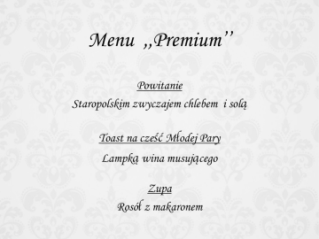 Menu ,,Premium’’ Powitanie Staropolskim zwyczajem chlebem i solą Toast na cześć Młodej Pary Lampką wina musującego Zupa Rosół z makaronem Danie główne ( 4 porcje na osobę) Kotlet schabowy z peperonatą Zraz zawijany z polędwicy wieprzowej karkówka po żydowsku Polędwiczka z suszonymi pomidorami i mozzarellą zapiekana na szpinaku Kotlet de volaille z drobiu Łosoś w papilotach w sosie śmietanowo- porowym Sakiewki ze schabu w sosie borowikowym Dodatki Ziemniaki gotowane z koperkiem Pyzy drożdżowe Kluski śląskie Sos pieczeniowy Bukiet warzyw gotowanych z posypką ze zrumienionej bułki tartej Zestaw surówek ( trzy rodzaje) Zakąski ( 4,5 porcje na osobę) galantyna z kaczki w galarecie porto Sushi z wędzonym łososiem i paluszkami krabowymi Schab pieczony nadziewany musem jabłkowo-chrzanowy szparagi w szynce w galarecie Roladka szpinakowa z wędzonym łososiem polędwiczka pieczona w niskiej temperaturze z rukolą i sosem pieprzowym Miruna w zalewie octowej Befsztyk tatarski Sałatka grecka Pieczywo , masło Zakąski gorące kurczak w pięciu smakach,krojony podany na żeliwnej płycie z dodatkiem zapiekanego ryżu z warzywami Sajgonki w sosie orientalnym Serwis kawowy Kawa , herbata Owoce świeże na paterach Kolacja barszcz z panini filet drobiowy zapiekany z pomidorami i serem szaszłyk wieprzowy golonki pieczone w piwie z dodatkiem kapusty kiszonej zasmażanej z grzybami zapiekanka pene z kurczakiem i brokułami musztarda , chrzan pieczywo , masło Po północy serwis kawowy kawa , herbata Kulinarna atrakcja wieczoru udziec wieprzowy pieczony krojony i serwowany na Sali ziemniaki pieczone , kasza zapiekana z warzywami sos czosnkowy Śniadanie Zupa gulaszowa Żurek na białej kiełbasie gorące bułeczki Opcja bez : ciasta , tortu , soków , alkoholi Pakiet: soki, woda, gazowane (coca-cola, sprite) – bez ograniczeń oraz ciasto 3 porcję na osobę z Cukierni „Szarlotka” * dzieci małe bez osobnego nakrycia przy stole bezpłatnie * dzieci do lat 10 – 50% * obsługa imprezy (orkiestra , kamerzysta , fotograf itp.) – 120 pln / osoba Menu dla dzieci W przypadku ustawienia oddzielnego stolika dla dzieci , istnieje możliwość zamiany menu zakąsek dla dzieci na pizzę (różne smaki) ,frytki, nuggetsy , ketchup Dodatkowe usługi gastronomiczne *Sandacz faszerowany w całości podany na lustrze na sałatce włoskiej *Kaczka pieczona porcjowana (udka , piersi) z dodatkiem zasmażanej modrej kapusty , klusek śląskich i pieczonego jabłka *Golonka z kością po bawarsku podawana w kamionce z kapustą kwaszoną zasmażaną i chrzanem (6 sztuk) Dodatkowe usługi gastronomiczne *Paśnik z wiejskim jadłem ( szynka pieczona , kiełbasy na kiju podwędzane, pasztet z żurawiną, Sery dojrzewające, bukiet wędlin i szynek ,ogórki kwaszone, smalec z cebulką, Śliwki w zalewie octowej, chleb wiejski. ) Dodatkowe usługi gastronomiczne *Bufet z włoskimi specjałami (szynka dojrzewająca, wędliny podsuszane i wędzone ,sery dojrzewające,Suszone pomidory w oliwie pomace, oliwki i papryczki faszerowane, ogórki w marynacie czosnkowej, cebulka marynowana ) *Poprawiny Obiad oraz serwis kawowy w formie stołu szwedzkiego Zakąski na stołach