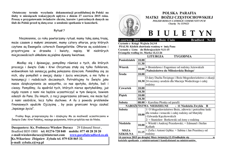 Ostateczny termin wysyłania dokumentacji przedślubnej do Polski na śluby w miesiącach wakacyjnych upływa z dniem 27 czerwca 2015 roku. Proszę o przygotowanie świadectw chrztu, kursów i potrzebnych danych na ślub do Polski przed tą datą oraz o ustalenie spotkania w kancelarii. POLSKA PARAFIA MATKI BOŻEJ CZĘSTOCHOWSKIEJ POLISH ROMAN CATHOLIC COMMUNITY PCM Charity No 1119423 B I U L E T YN Rytuał ? Niezmiennie, co roku powtarzamy rytuał, mamy taką samą trasę, może czasem z małymi zmianami, mamy cztery ołtarze, przy których czytane są Ewangelie czterech Ewangelistów. Ołtarze są ozdobione i przystrojone w drzewka i kwiaty, napisy. W niektórych miejscowościach układane są piękne dywany kwiatowe. Modląc się i śpiewając, pomyślmy również o tych, dla których procesja i święto Ciała i Krwi Chrystusa stały się tylko folklorem, widowiskiem lub sensacją godną pokazania dzieciom. Pomódlmy się za nich, aby pomyśleli o swojej duszy i życiu wiecznym, a nie tylko o konsumpcji i radościach doczesnych. Potraktujmy to Święto jako nasze dziękczynienie za wszystko, co nas spotyka, dotyka, boli i cieszy. Pomyślmy, ilu spośród tych, których nieraz spotykaliśmy, już nigdy razem z nami nie będzie uczestniczyć w tym święcie, bowiem odeszli do Pana. Ilu innych, z racji pogorszenia zdrowia, nie może być z nami osobiście, lecz tylko duchowo. A ilu z powodu problemów finansowych opuściło Ojczyznę , by poza granicami kraju szukać „lepszego życia”. Prośmy Boga, przepraszajmy Go i dziękujmy Mu za możliwość uczestniczenia w Święcie Ciała i Krwi Pańskiej, naszego pożywienia, które przybliża nas do Nieba. Duszpasterz: Ks. Proboszcz Wiesław Duracz 29 Edmund Street , Bradford BD5 OBH tel. 01274-720 848 mobile: 077 48 28 20 20 e-mail:[email protected] www.parafiabradford.co.uk Ks.Wikariusz Zbigniew Zybała tel. 079 028 865 32. e-mail: [email protected] 7 czerwca 2015 Boże Ciało Bradford Nr.23 Czytanie z Księgi Wyjścia 24,3-8 PSALM: Kielich zbawienia wzniosę w imię Pana Czytanie z Listu do Hebrajczyków 9,11-15 Ewangelia według św. Marka 14,12-26 LITURGIA TYGODNIA Poniedziałek 10.00 11.30 Wtorek + Bronisława i Eugeniusz od rodziny Jeżewskich 10.00 /Nabożeństwo do Miłosierdzia Bożego/ Środa 10.00 O dary Ducha Świętego i Boże błogosławieństwo z okazji 10.30 24 rocznicy urodzin dla Macieja Wodeckiego i całej rodziny Czwartek 10.00 10.30 Piątek 10.00 10.30 Sobota 08.00 + Karolina Płonka od parafii NABOŻEŃSTWA NIEDZIELNE - 11 Niedziela Zwykła B Sobota 1/ O błogosławieństwo Boże, zdrowie i potrzebne łaski dla wnuka i wnuczki i całej rodziny od Matyldy 18.00 i Edwarda Kączkowskich 2/ + Stanisław Borkowski od żony z rodziną Niedziela + Witold i Andrzej Przesławski; + Edmund i Stefan 10.00 Kollath + Zofia i Antoni Gębka: + Sabina i Jan Prusińscy od MSZA 11.15 rodziny SZKOLNA 14 czerwca 2015 po drugiej Mszy świętej/g.12.15/odbędzie się kościele spotkanie z ministrantami i kandydatami na ministrantów. w Lektorzy - Sobota 13.06.2015 g.18.00 – Kączkowscy Niedziela 14.06.2015 g. 10.00 - K. Musztafa g.11.15 - P. Szkoła Dyżur przedstawiciela PRD Sali św. Brata Alberta, sobota i niedziela 13-14.06.2015 – J.J. Nowiccy OFIARY Na potrzeby parafii – £ Na kwiaty – £ Taca dla parafii – 31.05.2015 - £ Gift Aid 03.05.2015 - £ 98 Jeżeli ktoś z Parafian pragnie złożyć ofiarę czekiem/na dowolny cel parafialny/, prosimy go wypisać na –P.C.M. BRADFORD. Zwracamy się w imieniu Parafialnej Rady Duszpasterskiej do wszystkich Parafian z serdeczną prośbą o złożenie raz w roku minimalnej sumy £ 30 na potrzeby naszej parafii. Wszystkim ofiarodawcom składamy serdeczne podziękowanie za złożone ofiary na nasze cele parafialne. Bóg zapłać. *** OGŁOSZENIA DUSZPASTERSKIE *** Przygotowujący się do sakramentu małżeństwa mogą uczestniczyć w specjalnych katechezach dla narzeczonych i uzyskać dyplom ukończenia kursu z poradnia rodzinną. Następny kurs będzie od 06-07 czerwca 2015/sobota-niedziela/ g.18.00-22.00. Prosimy o zapisy. 1. W piątek – uroczystość Najświętszego Serca Pana Jezusa, a zarazem 21. Światowy Dzień Modlitw o Uświęcenie Kapłanów.W ten piątek ze względu na uroczystość nie obowiązuje wstrzemięźliwość od spożywania mięsa. 2. W sobotę – wspomnienie Niepokalanego Serca Najświętszej Maryi Panny. W TYM TYGODNIU PATRONUJĄ NAM: *8 VI – św. Jadwiga, królowa znana z hojności dla ubogich, dzięki małżeństwu z Władysławem Jagiełłą przyczyniła się do nawrócenia Litwy. Własną biżuterię przeznaczyła na rozwój Akademii Krakowskiej. *10 VI – bł. Bogumił, biskup. Żył w XII wieku. Po rezygnacji z arcybiskupstwa w Gnieźnie został pustelnikiem. Zasłynął z daru modlitwy i nauczania ubogiej ludności. *11 VI – św. Barnaba, apostoł rodem z Cypru, bliski współpracownik św. Pawła i towarzysz jego pierwszej podróży misyjnej. Środa - POK 10.00-14.00 DAY CENTRE Piątek - POK 10.00-14.00 DAY CENTRE Informacja dla rodziców – Rekrutacja uczniów do Polskiej Szkoły Sobotniej w Bradford rozpoczyna się z dniem 16 maja 2015 roku i trwa do 27 czerwca 2015 roku. Szczegóły dotyczące naboru znajdą Państwo na stronie internetowej szkoły. Można też uzyskać informacje pod numerem 07405766815. CUKIERNIA JAGODA/19-21 Edmund Street BD5 0BH/, zaprasza w piątki/g.12.00-24.00/ w każdą sobotę na kawę i ciasto/g.12.00-24.00/ i w niedziele/g.10.00-20.00/ także na smaczny polski obiad. Menu na tablicy ogłoszeń. Istnieje także możliwość wynajmu sali i urządzenia okolicznościowych imprez. Kontakt i rezerwacja; Tel. 079 55 399 492. W Sali św. Brata Alberta, w każdą sobotę i niedzielę można nabyć tygodnik katolicki „Gość Niedzielny” w cenie Ł1.50. Wszystkich naszych Rodaków, którzy chcą należeć do naszej Parafii serdecznie zapraszamy i prosimy o wypełnienie przygotowanego formularza i zwrócenie go duszpasterzo