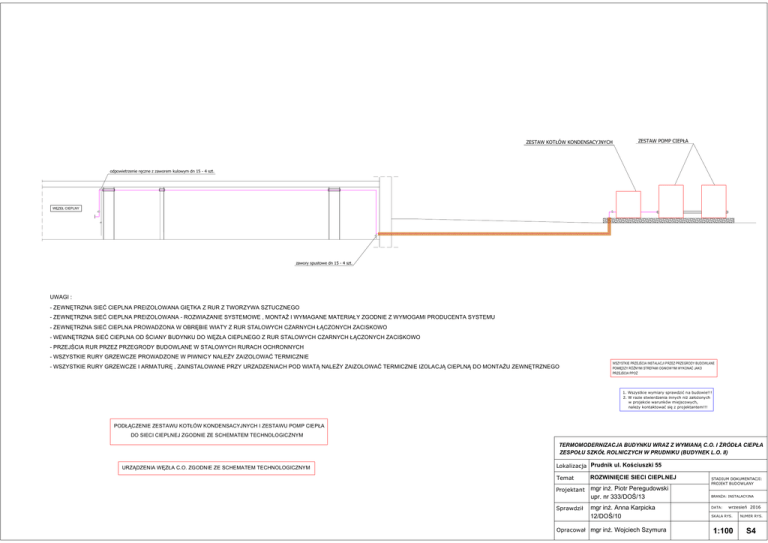 ZESTAW KOTŁÓW KONDENSACYJNYCH ZESTAW POMP CIEPŁA odpowietrzenie ręczne z zaworem kulowym dn 15 - 4 szt. WĘZEŁ CIEPLNY zawory spustowe dn 15 - 4 szt. UWAGI : - ZEWNĘTRZNA SIEĆ CIEPLNA PREIZOLOWANA GIĘTKA Z RUR Z TWORZYWA SZTUCZNEGO - ZEWNĘTRZNA SIEĆ CIEPLNA PREIZOLOWANA - ROZWIAZANIE SYSTEMOWE , MONTAŻ I WYMAGANE MATERIAŁY ZGODNIE Z WYMOGAMI PRODUCENTA SYSTEMU - ZEWNĘTRZNA SIEĆ CIEPLNA PROWADZONA W OBRĘBIE WIATY Z RUR STALOWYCH CZARNYCH ŁĄCZONYCH ZACISKOWO - WEWNĘTRZNA SIEĆ CIEPLNA OD ŚCIANY BUDYNKU DO WĘZŁA CIEPLNEGO Z RUR STALOWYCH CZARNYCH ŁĄCZONYCH ZACISKOWO - PRZEJŚCIA RUR PRZEZ PRZEGRODY BUDOWLANE W STALOWYCH RURACH OCHRONNYCH - WSZYSTKIE RURY GRZEWCZE PROWADZONE W PIWNICY NALEŻY ZAIZOLOWAĆ TERMICZNIE - WSZYSTKIE RURY GRZEWCZE I ARMATURĘ , ZAINSTALOWANE PRZY URZADZENIACH POD WIATĄ NALEŻY ZAIZOLOWAĆ TERMICZNIE IZOLACJĄ CIEPLNĄ DO MONTAŻU ZEWNĘTRZNEGO WSZYSTKIE PRZEJŚCIA INSTALACJI PRZEZ PRZEGRODY BUDOWLANE POMIĘDZY RÓŻNYMI STREFAMI OGNIOWYMI WYKONAĆ JAKO PRZEJŚCIA PPOŻ 1. Wszystkie wymiary sprawdzić na budowie!!! 2. W razie stwierdzenia innych niż założonych w projekcie warunków miejscowych, należy kontaktować się z projektantem!!! PODŁĄCZENIE ZESTAWU KOTŁÓW KONDENSACYJNYCH I ZESTAWU POMP CIEPŁA DO SIECI CIEPLNEJ ZGODNIE ZE SCHEMATEM TECHNOLOGICZNYM TERMOMODERNIZACJA BUDYNKU WRAZ Z WYMIANĄ C.O. I ŹRÓDŁA CIEPŁA ZESPOŁU SZKÓŁ ROLNICZYCH W PRUDNIKU (BUDYNEK L.O. II) URZĄDZENIA WĘZŁA C.O. ZGODNIE ZE SCHEMATEM TECHNOLOGICZNYM Lokalizacja Prudnik ul. Kościuszki 55 Temat ROZWINIĘCIE SIECI CIEPLNEJ Projektant mgr inż. Piotr Peregudowski upr. nr 333/DOŚ/13 Sprawdził mgr inż. Anna Karpicka 12/DOŚ/10 Opracował mgr inż. Wojciech Szymura STADIUM DOKUMENTACJI: PROJEKT BUDOWLANY BRANŻA: INSTALACYJNA DATA: wrzesień 2016 SKALA RYS. 1:100 NUMER RYS. S4