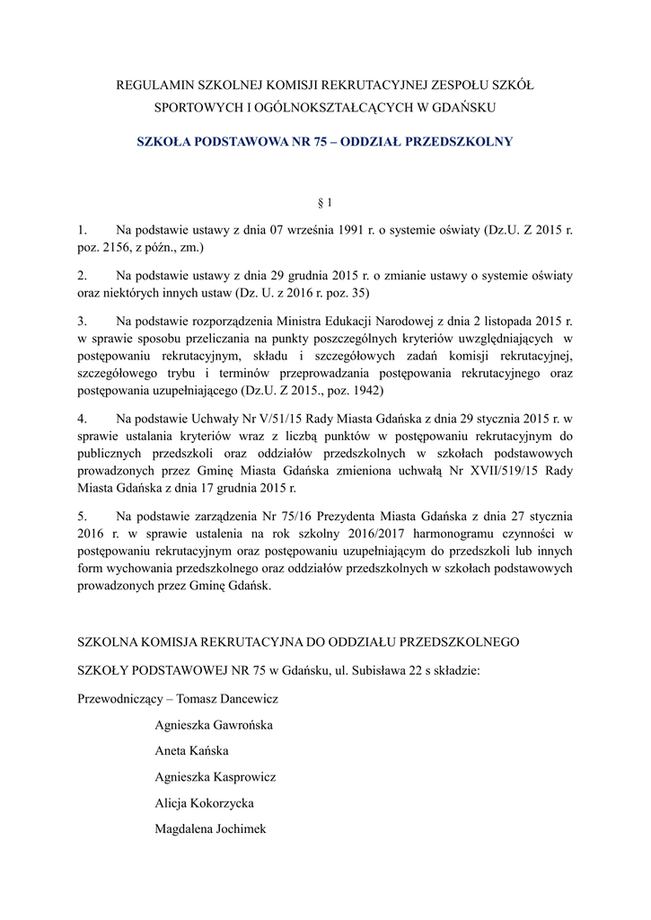 REGULAMIN SZKOLNEJ KOMISJI REKRUTACYJNEJ ZESPOŁU SZKÓŁ SPORTOWYCH I OGÓLNOKSZTAŁCĄCYCH W GDAŃSKU SZKOŁA PODSTAWOWA NR 75 – ODDZIAŁ PRZEDSZKOLNY §1 1. Na podstawie ustawy z dnia 07 września 1991 r. o systemie oświaty (Dz.U. Z 2015 r. poz. 2156, z późn., zm.) 2. Na podstawie ustawy z dnia 29 grudnia 2015 r. o zmianie ustawy o systemie oświaty oraz niektórych innych ustaw (Dz. U. z 2016 r. poz. 35) 3. Na podstawie rozporządzenia Ministra Edukacji Narodowej z dnia 2 listopada 2015 r. w sprawie sposobu przeliczania na punkty poszczególnych kryteriów uwzględniających w postępowaniu rekrutacyjnym, składu i szczegółowych zadań komisji rekrutacyjnej, szczegółowego trybu i terminów przeprowadzania postępowania rekrutacyjnego oraz postępowania uzupełniającego (Dz.U. Z 2015., poz. 1942) 4. Na podstawie Uchwały Nr V/51/15 Rady Miasta Gdańska z dnia 29 stycznia 2015 r. w sprawie ustalania kryteriów wraz z liczbą punktów w postępowaniu rekrutacyjnym do publicznych przedszkoli oraz oddziałów przedszkolnych w szkołach podstawowych prowadzonych przez Gminę Miasta Gdańska zmieniona uchwałą Nr XVII/519/15 Rady Miasta Gdańska z dnia 17 grudnia 2015 r. 5. Na podstawie zarządzenia Nr 75/16 Prezydenta Miasta Gdańska z dnia 27 stycznia 2016 r. w sprawie ustalenia na rok szkolny 2016/2017 harmonogramu czynności w postępowaniu rekrutacyjnym oraz postępowaniu uzupełniającym do przedszkoli lub innych form wychowania przedszkolnego oraz oddziałów przedszkolnych w szkołach podstawowych prowadzonych przez Gminę Gdańsk. SZKOLNA KOMISJA REKRUTACYJNA DO ODDZIAŁU PRZEDSZKOLNEGO SZKOŁY PODSTAWOWEJ NR 75 w Gdańsku, ul. Subisława 22 s składzie: Przewodniczący – Tomasz Dancewicz Agnieszka Gawrońska Aneta Kańska Agnieszka Kasprowicz Alicja Kokorzycka Magdalena Jochimek Alicja Szczepańska Daria Doruch/w zastępstwie Martyna Jabłońska Informuje, że: §2 SZKOŁA PODSTAWOWA NR 75 prowadzi rekrutację do oddziału przedszkolnego na rok szkolny 2016/2017 §3 Harmonogram czynności w postępowaniu rekrutacyjnym do oddziału przedszkolnego Szkoły Podstawowej nr 75 na rok szkolny 2016/2017 LP Rodzaj czynności w postępowaniu rekrutacyjnym 1. Złożenie wniosku o przyjęcie do przedszkola innej formy wychowania przedszkolnego lub oddziału przedszkolnego w szkole podstawowej wraz z dokumentami potwierdzającymi spełnienie przez kandydata warunków lub kryteriów branych pod uwagę w postępowaniu rekrutacyjnym Weryfikację przez komisję rekrutacyjną wniosków o przyjęcie do przedszkola innej formy wychowania przedszkolnego lub oddziału przedszkolnego w szkole podstawowej i dokumentów potwierdzających spełnienie przez kandydata warunków lub kryteriów branych pod uwagę w postępowaniu rekrutacyjnym, w tym dokonanie przez przewodniczącego komisji rekrutacyjnej czynności wymienionych w art. 20t ust. 7 ustawy o systemie oświaty. Podanie do publicznej wiadomości przez komisję rekrutacyjną listy kandydatów zakwalifikowanych i kandydatów niezakwalifikowanych Potwierdzanie przez rodzica kandydata woli przyjęcia w postaci pisemnego oświadczenia (umowa) 2. 3. 4. 5. LP Podanie do publicznej wiadomości przez komisję rekrutacyjną listy kandydatów przyjętych i kandydatów nieprzyjętych w postępowaniu rekrutacyjnym Rodzaj czynności w postępowaniu uzupełniającym Data rozpoczęcia Data zakończenia 14.03.2016 Godz. 9.00 30.03.2016 Godz. 15.00 14.03.2016 Godz. 9.00 04.04.2016 Godz. 15.00 22.04.2016 Godz. 12.00 25.04.2016 Godz. 8.00 04.05.2016 Godz. 15.00 06.05.2016 Godz. 13.00 Data rozpoczęcia Data zakończenia 1. 2. 3. 4. 5. Złożenie wniosku o przyjęcie do przedszkola innej formy wychowania przedszkolnego lub oddziału przedszkolnego w szkole podstawowej wraz z dokumentami potwierdzającymi spełnienie przez kandydata warunków lub kryteriów branych pod uwagę w postępowaniu rekrutacyjnym Weryfikację przez komisję rekrutacyjną wniosków o przyjęcie do przedszkola innej formy wychowania przedszkolnego lub oddziału przedszkolnego w szkole podstawowej i dokumentów potwierdzających spełnienie przez kandydata warunków lub kryteriów branych pod uwagę w postępowaniu rekrutacyjnym, w tym dokonanie przez przewodniczącego komisji rekrutacyjnej czynności wymienionych w art. 20t ust. 7 ustawy o systemie oświaty. Podanie do publicznej wiadomości przez komisję rekrutacyjną listy kandydatów zakwalifikowanych i kandydatów niezakwalifikowanych Potwierdzanie przez rodzica kandydata woli przyjęcia w postaci pisemnego oświadczenia (umowa) Podanie do publicznej wiadomości przez komisję rekrutacyjną listy kandydatów przyjętych i kandydatów nieprzyjętych w postępowaniu rekrutacyjnym 16.05.2016 Godz. 9.00 20.05.2016 Godz. 15.00 16.05.2016 Godz. 9.00 20.05.2016 Godz. 15.00 2.06.2016 Godz. 12.00 03.06.2016 Godz. 8.00 08.06.2016 Godz. 15.00 10.06.2016 Godz. 13.00 §4 Postępowanie rekrutacyjne prowadzone jest w oparciu o kryteria ustawowe oraz kryteria dodatkowe. §5 Dokumenty potwierdzające wybór danego kryterium muszą być dostarczone do placówki pierwszego wyboru wraz z Wnioskiem. §6 Ze względu na specyfikę szkoły oraz wybór w przyszłości wiodących dyscyplin sportowych szkoła dodatkowo rozpatrując kandydatów uwzględnia opinię wychowawcy/pedagoga z przedszkola. W przypadku osób którzy ponownie będą kontynuowały naukę w oddziale przedszkolnym Szkoły Podstawowej 75 taką opinię dostarczają wychowawca w porozumieniu z pedagogiem i trenerami prowadzącymi. §7 Rodzicom dzieci nieprzyjętych do oddziału przedszkolnego przysługuje prawo wystąpienia do komisji rekrutacyjnej z wnioskiem o sporządzenie uzasadnienia odmowy przyjęcia kandydata do oddziału przedszkolnego w terminie 7 dni od dnia podania do publicznej wiadomości listy kandydatów przyjętych i nieprzyjętych. W terminie 7 dni od dnia otrzymania uzasadnienia rodzice kandydata mogą wnieść do dyrektora szkoły odwołanie do rozstrzygnięcia komisji re