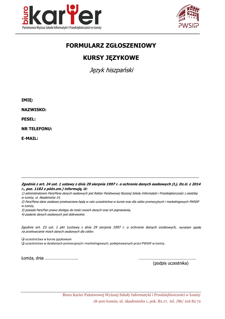 FORMULARZ ZGŁOSZENIOWY KURSY JĘZYKOWE Język hiszpański IMIĘ: NAZWISKO: PESEL: NR TELEFONU: E-MAIL: _________________________________________________________________________________________________________ Zgodnie z art. 24 ust. 1 ustawy z dnia 29 sierpnia 1997 r. o ochronie danych osobowych (t.j. Dz.U. z 2014 r., poz. 1182 z późn.zm.) informuję, iż: 1) administratorem Pani/Pana danych osobowych jest Rektor Państwowej Wyższej Szkoły Informatyki i Przedsiębiorczości z siedzibą w Łomży, ul. Akademicka 14, 2) Pani/Pana dane osobowe przetwarzane będą w celu uczestnictwa w kursie oraz dla celów promocyjnych i marketingowych PWSIiP w Łomży, 3) posiada Pani/Pan prawo dostępu do treści swoich danych oraz ich poprawiania, 4) podanie danych osobowych jest dobrowolne. Zgodnie art. 23 ust. 1 pkt 1ustawy z dnia 29 sierpnia 1997 r. o ochronie danych osobowych, wyrażam zgodę na przetwarzanie moich danych osobowych dla celów: uczestnictwa w kursie językowym uczestnictwa w działaniach promocyjnych i marketingowych, podejmowanych przez PWSIiP w Łomży. Łomża, dnia ……………………….. ………………………………………….. (podpis uczestnika) Biuro Karier Państwowej Wyższej Szkoły Informatyki i Przedsiębiorczości w Łomży 18-400 Łomża, ul. Akademicka 1, pok. B2.17, tel. /86/ 216 82 72