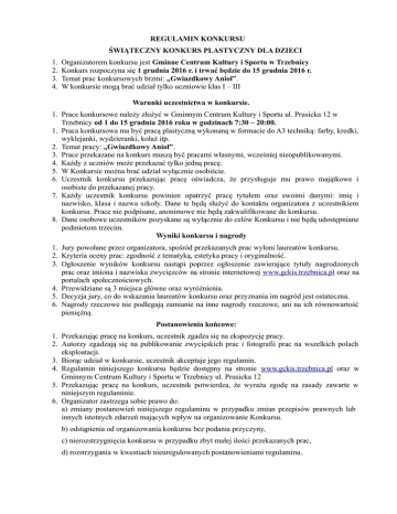 REGULAMIN KONKURSU ŚWIĄTECZNY KONKURS PLASTYCZNY DLA DZIECI 1. 2. 3. 4. Organizatorem konkursu jest Gminne Centrum Kultury i Sportu w Trzebnicy Konkurs rozpoczyna się 1 grudnia 2016 r. i trwać będzie do 15 grudnia 2016 r. Temat prac konkursowych brzmi: „Gwiazdkowy Anioł”. W konkursie mogą brać udział tylko uczniowie klas I – III Warunki uczestnictwa w konkursie. 1. Prace konkursowe należy złożyć w Gminnym Centrum Kultury i Sportu ul. Prusicka 12 w Trzebnicy od 1 do 15 grudnia 2016 roku w godzinach 7:30 – 20:00. 1. Praca konkursowa ma być pracą plastyczną wykonaną w formacie do A3 techniką: farby, kredki, wyklejanki, wydzieranki, kolaż itp. 2. Temat pracy: „Gwiazdkowy Anioł”. 3. Prace przekazane na konkurs muszą być pracami własnymi, wcześniej nieopublikowanymi. 4. Każdy z uczniów może przekazać tylko jedną pracę. 5. W Konkursie można brać udział wyłącznie osobiście. 6. Uczestnik konkursu przekazując pracę oświadcza, że przysługuje mu prawo majątkowe i osobiste do przekazanej pracy. 7. Każdy uczestnik konkursu powinien opatrzyć pracę tytułem oraz swoimi danymi: imię i nazwisko, klasa i nazwa szkoły. Dane te będą służyć do kontaktu organizatora z uczestnikiem konkursu. Prace nie podpisane, anonimowe nie będą zakwalifikowane do konkursu. 8. Dane osobowe uczestników pozyskane są wyłącznie do celów Konkursu i nie będą udostępniane podmiotom trzecim. Wyniki konkursu i nagrody 1. Jury powołane przez organizatora, spośród przekazanych prac wyłoni laureatów konkursu. 2. Kryteria oceny prac: zgodność z tematyką, estetyka pracy i oryginalność. 3. Ogłoszenie wyników konkursu nastąpi poprzez ogłoszenie zawierające tytuły nagrodzonych prac oraz imiona i nazwiska zwycięzców na stronie internetowej www.gckis.trzebnica.pl oraz na portalach społecznościowych. 4. Przewidziane są 3 miejsca główne oraz wyróżnienia. 5. Decyzja jury, co do wskazania laureatów konkursu oraz przyznania im nagród jest ostateczna. 6. Nagrody rzeczowe nie podlegają zamianie na inne nagrody rzeczowe, ani na ich równowartość pieniężną. Postanowienia końcowe: 1. Przekazując pracę na konkurs, uczestnik zgadza się na ekspozycję pracy. 2. Autorzy zgadzają się na publikowanie zwycięskich prac i fotografii prac na wszelkich polach eksploatacji. 3. Biorąc udział w konkursie, uczestnik akceptuje jego regulamin. 4. Regulamin niniejszego konkursu będzie dostępny na stronie www.gckis.trzebnica.pl oraz w Gminnym Centrum Kultury i Sportu w Trzebnicy ul. Prusicka 12 5. Przekazując pracę na konkurs, uczestnik potwierdza, że wyraża zgodę na zasady zawarte w niniejszym regulaminie. 6. Organizator zastrzega sobie prawo do: a) zmiany postanowień niniejszego regulaminu w przypadku zmian przepisów prawnych lub innych istotnych zdarzeń mających wpływ na organizowanie Konkursu. b) odstąpienia od organizowania konkursu bez podania przyczyny, c) nierozstrzygnięcia konkursu w przypadku zbyt małej ilości przekazanych prac, d) rozstrzygania w kwestiach nieuregulowanych postanowieniami regulaminu.