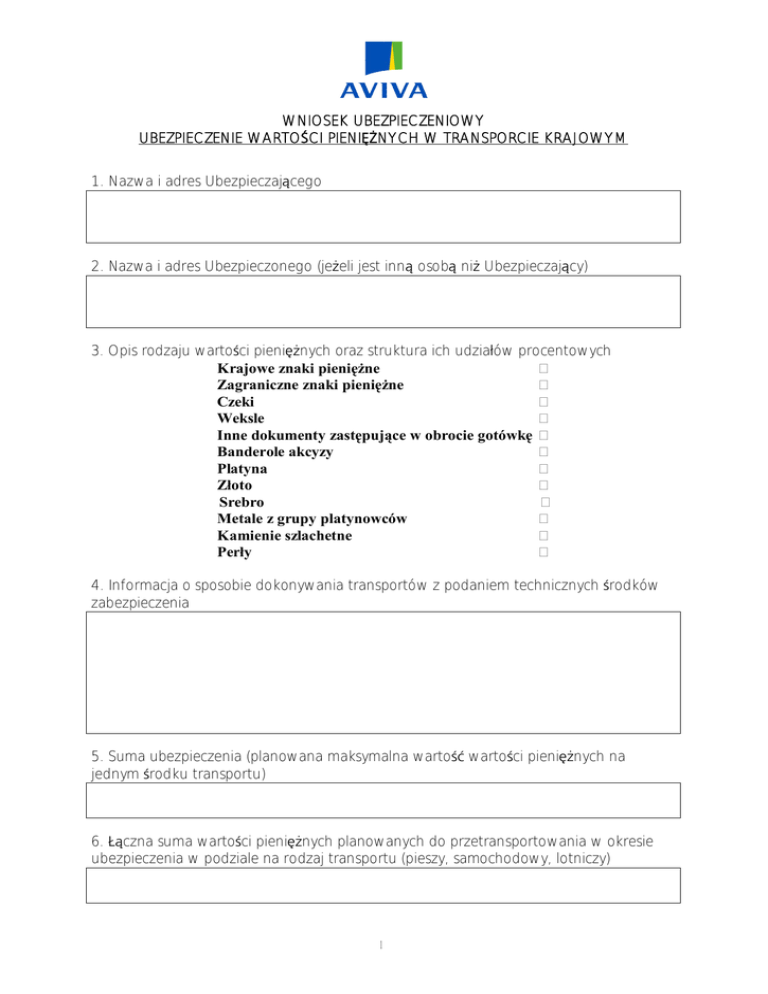 WNIOSEK UBEZPIECZENIOWY UBEZPIECZENIE WARTO CI PIENI NYCH W TRANSPORCIE KRAJOWYM 1. Nazwa i adres Ubezpieczaj cego 2. Nazwa i adres Ubezpieczonego (je eli jest inn osob ni Ubezpieczaj cy) 3. Opis rodzaju warto ci pieni nych oraz struktura ich udzia ów procentowych Krajowe znaki pieni ne Zagraniczne znaki pieni ne Czeki Weksle Inne dokumenty zast puj ce w obrocie gotówk Banderole akcyzy Platyna oto Srebro Metale z grupy platynowców Kamienie szlachetne Per y 4. Informacja o sposobie dokonywania transportów z podaniem technicznych rodków zabezpieczenia 5. Suma ubezpieczenia (planowana maksymalna warto jednym rodku transportu) warto ci pieni nych na 6. czna suma warto ci pieni nych planowanych do przetransportowania w okresie ubezpieczenia w podziale na rodzaj transportu (pieszy, samochodowy, lotniczy) 1 7. Data pocz tku okresu ubezpieczenia Data ko ca okresu ubezpieczenia 8. Trasy przewozów (prosz poda najcz ciej wykorzystywane trasy) 9. Informacja o osobach lub firmach dokonuj cych transportu Dotychczasowy przebieg szkodowy Prosimy poda dane o szkodach w ci gu ostatnich 5 lat, zgodnie z podan tabel . UWAGA: Prosimy poda wszystkie szkody, niezale nie od tego czy zdarzenia by y obj te jakimkolwiek ubezpieczeniem. Data szkody Przyczyna szkody Wielko szkody Otrzymane odszkodowanie w przypadku braku miejsca prosimy za czy osobny wykaz szkód wiadczamy, e wszystkie informacje podane we wniosku s prawdziwe i przyjmujemy do wiadomo ci, e niniejszy wniosek wraz z wszystkimi innymi dostarczonymi przez nas informacjami mo e stanowi podstaw umowy ubezpieczenia oraz jej integraln cz . Podpisanie niniejszego wniosku nie zobowi zuje wnioskodawcy ani Avivy do zawarcia umowy ubezpieczenia. Data Podpis Ubezpieczaj cego 2