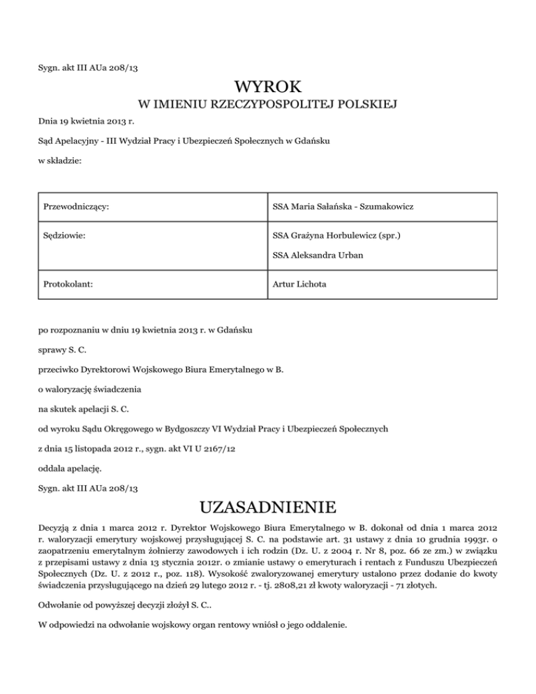 Sygn. akt III AUa 208/13 WYROK W IMIENIU RZECZYPOSPOLITEJ POLSKIEJ Dnia 19 kwietnia 2013 r. Sąd Apelacyjny - III Wydział Pracy i Ubezpieczeń Społecznych w Gdańsku w składzie: Przewodniczący: SSA Maria Sałańska - Szumakowicz Sędziowie: SSA Grażyna Horbulewicz (spr.) SSA Aleksandra Urban Protokolant: Artur Lichota po rozpoznaniu w dniu 19 kwietnia 2013 r. w Gdańsku sprawy S. C. przeciwko Dyrektorowi Wojskowego Biura Emerytalnego w B. o waloryzację świadczenia na skutek apelacji S. C. od wyroku Sądu Okręgowego w Bydgoszczy VI Wydział Pracy i Ubezpieczeń Społecznych z dnia 15 listopada 2012 r., sygn. akt VI U 2167/12 oddala apelację. Sygn. akt III AUa 208/13 UZASADNIENIE Decyzją z dnia 1 marca 2012 r. Dyrektor Wojskowego Biura Emerytalnego w B. dokonał od dnia 1 marca 2012 r. waloryzacji emerytury wojskowej przysługującej S. C. na podstawie art. 31 ustawy z dnia 10 grudnia 1993r. o zaopatrzeniu emerytalnym żołnierzy zawodowych i ich rodzin (Dz. U. z 2004 r. Nr 8, poz. 66 ze zm.) w związku z przepisami ustawy z dnia 13 stycznia 2012r. o zmianie ustawy o emeryturach i rentach z Funduszu Ubezpieczeń Społecznych (Dz. U. z 2012 r., poz. 118). Wysokość zwaloryzowanej emerytury ustalono przez dodanie do kwoty świadczenia przysługującego na dzień 29 lutego 2012 r. - tj. 2808,21 zł kwoty waloryzacji - 71 złotych. Odwołanie od powyższej decyzji złożył S. C.. W odpowiedzi na odwołanie wojskowy organ rentowy wniósł o jego oddalenie. Wyrokiem z dnia 15 listopada 2012 r. Sąd Okręgowy w Bydgoszczy VI Wydział Pracy i Ubezpieczeń Społecznych oddalił odwołanie. Uzasadniając swoje stanowisko Sąd wskazał, iż S. C. uprawniony jest do pobierania emerytury wojskowej. Waloryzacja przyznanej ubezpieczonemu emerytury w 2011 r. została dokonana poprzez pomnożenie kwoty świadczenia ustalonego na dzień 28 lutego 2011 r. przez wskaźnik waloryzacji wynoszący 103,10%. W ten sposób zwaloryzowane świadczenie od 1 marca 2011r. wyniosło 2.808,21 złote. Na podstawie art. 4 ustawy z dnia 13 stycznia 2012 r. o zmianie ustawy o emeryturach i rentach z FUS w 2012 r. waloryzacja od dnia 1 marca 2012 r. polega na dodaniu do kwoty świadczenia, w wysokości przysługującej w dniu 29 lutego 2012 r. kwoty waloryzacji w wysokości 71 zł. Zgodnie z art. 5 ust. 1 pkt 7 waloryzacji, o której mowa w art. 4, podlegają m. in. świadczenia pieniężne, o których mowa w art. 2 pkt 1 lit. a-c ustawy z dnia 10 grudnia 1993 r. o zaopatrzeniu emerytalnym żołnierzy zawodowych oraz ich rodzin (a więc również emerytura wojskowa). Na podstawie art. 5 ust. 3 w/w ustawy waloryzacyjnej do waloryzacji podstawy wymiaru świadczeń wypłacanych na podstawie ustawy o zaopatrzeniu emerytalnym żołnierzy zawodowych oraz ich rodzin stosuje się odpowiednio przepis ust. 2 art. 5 ustawy waloryzacyjnej. Zgodnie zaś z ostatnio powołanym przepisem waloryzacja podstawy wymiaru świadczenia z FUS polega na pomnożeniu podstawy wymiaru świadczenia przez wskaźnik stanowiący iloraz zwaloryzowanej kwoty świadczenia z FUS i kwoty tego świadczenia ustalonej na dzień poprzedzający termin waloryzacji. Jednocześnie na podstawie przepisu art. 7 ustawy z dnia 13 stycznia 2012 r. odnośnie dokonania waloryzacji wyłączona została możliwość przeprowadzania procentowej waloryzacji świadczeń w 2012 r., przewidzianej w przepisach art. 88 i art. 89 ustawy emerytalno – rentowej. Biorąc pod uwagę powyższe przepisy Sąd nie stwierdził nieprawidłowości przy dokonywaniu waloryzacji świadczenia emerytalnego przysługującego odwołującemu od 1 marca 2012r. Osobną kwestią natomiast jest zgodność waloryzacji kwotowej świadczeń emerytalnych w 2012r. z przepisami Konstytucji. Co do zasady każdy przepis ustawy korzysta z domniemania konstytucyjności do czasu wejścia w życie orzeczenia TK stwierdzającego jego niezgodność z Konstytucją. W ocenie Sądu, okoliczność, iż Prezydent RP oraz (...) wystąpili do Trybunału Konstytucyjnego z wnioskiem w celu zbadania zgodności z Konstytucją RP przepisów ustawy z dnia 13 stycznia 2012 r. odnoszących się do wprowadzonej w 2012 r. kwotowej waloryzacji świadczeń, nie stanowi podstawy do zmiany zaskarżonej decyzji. Sąd zaznaczył, że dopóki nie zostanie stwierdzona przez Trybunał niezgodność określonego przepisu z Konstytucją, dopóty ten przepis podlega stosowaniu i może stanowić podstawę merytorycznych rozstrzygnięć sądowych. Mając na uwadze powyższe Sąd Okręgowy na mocy art. 47714 § 1 k.p.c. oddalił odwołanie. O kosztach postępowania Sąd orzekł na podstawie art. 98 § 1 k.p.c. oraz § 11 ust. 2 rozporządzenia Ministra Sprawiedliwości z dnia 28 września 2002 r. w sprawie opłat za czynności radców prawnych oraz ponoszenia przez Skarb Państwa kosztów pomocy prawnej udzielonej przez radcę prawnego ustanowionego z urzędu. Apelację od wyroku wywiódł wnioskodawca wnosząc o jego unieważnienie oraz zwolnienie w całości z kosztów zastępstwa procesowego. Uzasadniając swoje stanowisko skarżący wskazał, iż wyrok Sądu Okręgowego jest nieważny, albowiem wnioskodawca nie został w nim pouczony o sposobie i terminie wniesienia odwołania oraz - pomimo zobowiązania go do uiszczenia na rzecz pozwanego kwoty 180 zł - nie wskazano terminu oraz numeru konta, na które przedmiotowa kwota miałaby zostać wpłacona. Dodatkowo podkreślił, że sędzia wydająca wyrok w sprawie naruszyła i podważyła „legalność” art. 8 pkt 1, art. 32, art. 78, art. 83, art. 87, art. 176 oraz art. 178 Konstytucji RP. Poza tym, w ocenie wnioskodawcy sędzia winna zawiesić sprawę z odwołania ubezpieczonego, zgodnie z jego wnioskiem – nie robiąc zaś tego naruszyła zagwarantowane apelującemu Konstytucją prawa. Poza tym ubezpieczony wniósł o zwolnienie go od ponoszenia kosztów zastępstwa procesowego wskazując, że radca prawny WBE sporządził 600 identycznych pism, co zapewne kosztowało go jeden dzień 