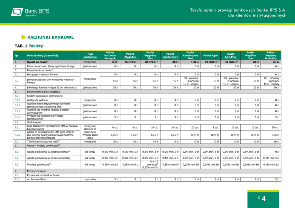 RACHUNKI BANKOWE TAB. 1 Pakiety Lp. Rodzaj usług (czynności) Tryb pobierania 1. Opłata za Pakiet1) miesięcznie 2. Otwarcie rachunku bieżącego/pomocniczego jednorazowo 3. Prowadzenie rachunku1): 3.1 bieżącego w ramach Pakietu 3.2 pomocniczego (w tym walutowe) w ramach Pakietu miesięcznie 4. Likwidacja Pakietu w ciągu 30 dni od otwarcia jednorazowo 5. Elektroniczne Kanały Dostępu: 5.1 System bankowości internetowej: 5.1.1 5.3 dostęp do systemu wysłanie hasła aktywacyjnego lub hasła jednorazowego za pomocą SMS wydanie lub wysłanie koperty z hasłem aktywacyjnym Wydanie lub wysłanie karty haseł jednorazowych SMS Kontakt: ilość darmowych powiadomień SMS w miesiącu kalendarzowym opłata za powiadomienie SMS poza limitem (nie dotyczy haseł jednorazowych Systemu bankowości internetowej) Telefoniczna usługa na hasło4) 6. Wpłaty i wypłaty gotówkowe5): 6.1 wpłata gotówkowa w placówce Banku6), 6.2 Pakiet Na Dobry Początek 0 zł2) 15 zł/0 zł 3) Pakiet Wygodny Plus 50 zł/0 zł 3) 30 zł Pakiet Komfortowy Plus 100 zł 0 zł 0 zł 0 zł 0 zł 0 zł 0 zł 0 zł 0 zł 15 zł 15 zł 15 zł 15 zł 20 zł 20 zł 20 zł 20 zł Pakiet Wygodny Pakiet Komfortowy 10 zł/0 zł 3) 30 zł/0 zł 3) Pakiet Wspólny Dom 20 zł 0 zł 0 zł 0 zł 0 zł 0 zł 0 zł 0zł - pierwsze 3 rachunki 15 zł - kolejne 20 zł 0 zł 0 zł 15 zł 15 zł 20 zł 0 zł 0zł - pierwsze 2 rachunki 15 zł - kolejne 20 zł 0 zł 0zł - pierwszy rachunek 15 zł - kolejny 20 zł Pakiet Agro Pakiet Agro Plus 20 zł Pakiet Wspólny Dom Plus 60 zł miesięcznie 0 zł 0 zł 0 zł 0 zł 0 zł 0 zł 0 zł 0 zł 0 zł jednorazowo 0 zł 0 zł 0 zł 0 zł 0 zł 0 zł 0 zł 0 zł 0 zł jednorazowo 0 zł 0 zł 0 zł 0 zł 0 zł 0 zł 0 zł 0 zł 0 zł jednorazowo 5 zł 5 zł 5 zł 5 zł 5 zł 5 zł 5 zł 5 zł 5 zł 0 szt. 5 szt. 10 szt. 10 szt. 20 szt. 5 szt. 10 szt. 10 szt. 20 szt. 0,25 zł 0,25 zł 0,25 zł 0,25 zł 0,25 zł 0,25 zł 0,25 zł 0,25 zł 0,25 zł 10 zł 10 zł 10 zł 10 zł 10 zł 10 zł 10 zł 10 zł 10 zł od kwoty 0,5% min. 5 zł 0,5% min. 5 zł 0,2% min. 2 zł 0,5% min. 5 zł 0,5% min. 5 zł 0,5% min. 5 zł 0,5% min. 5 zł 0,5% min. 5 zł 0 zł wpłata gotówkowa w formie zamkniętej od kwoty 0,3% min. 5 zł 0,3% min. 5 zł 0,3% min. 5 zł 0,3% min. 5 zł 0,3% min. 5 zł 0,3% min. 5 zł 0,3% min. 5 zł 0,3% min. 5 zł 6.3 Wypłata gotówkowa7), od kwoty 0,15% min.5zł 0,15%min.5 zł 0,3% min. 5 zł 0 zł – 3 pierwsze8) 0,15% min.5zł 0,20% min.5zł 0,15% min.5zł 0,15% min.5zł 0,15% min.5zł 0,20% min.5zł 0,15% min.5zł 7. Przelewy krajowe 7.1 Przelew na rachunek w Banku: 7.1.1 w placówce Banku 5 zł 5 zł 5 zł 5 zł 5 zł 5 zł 5 zł 5 zł 5 zł 5.1.2 5.1.3 5.1.4 5.2 5.2.1 5.2.2 miesięcznie zbiorczo za każdy SMS wysłany przez Bank miesięcznie za przelew 4 Lp. Rodzaj usług (czynności) Tryb pobierania 7.2 w Systemie bankowości internetowej/ SMS Kontakt Przelew na rachunek w innym banku w systemie ELIXIR: 7.2.1. w placówce Banku 7.2.2 w Systemie bankowości internetowej/ SMS Kontakt 7.1.2 7.2.2.1 7.2.2.2 7.3 7.4 8. 8.1 przelewy do ZUS/KRUS i organów podatkowych10) pozostałe przelewy 8.1.2 8.1.3 Regulowany za przelew od transakcji 12) polecenie wypłaty 8.2 Realizacja przelewów w trybie niestandardowym: 8.2.1 w EUR, USD i GBP w trybie „pilnym” 8.2.2 w USD, GBP i PLN w trybie „przyspieszonym” 8.3 Skup przelewów otrzymanych z banków krajowych i zagranicznych: przekazy na kwoty nie przekraczające równowartości 10 EUR SEPA od transakcji Regulowany 8.3.2 8.3.3 8.3.4 polecenia wypłaty z dyspozycją dotyczącą kosztów „BEN” lub „SHA” 8.4 Zwrot niepodjętej kwoty przekazu 8.5 8.6 8.6.1 0 zł 0 zł 8 zł 8 zł Pakiet Komfortowy Pakiet Komfortowy Plus 0 zł 0 zł 0 zł 0 zł 8 zł 8 zł 8 zł 8 zł od transakcji od transakcji od transakcji Pakiet Agro 0 zł – pierwsze 50 przelewów, a kolejne8)9): Pakiet Agro Plus Pakiet Wspólny Dom 0 zł 0 zł 8 zł 8 zł 0 zł – pierwsze 10 przelewów, a kolejne8)9): Pakiet Wspólny Dom Plus 0 zł 8 zł 0 zł – pierwsze 20 przelewów, a kolejne8)9): 0 zł 0 zł 0 zł 0 zł 0 zł 0 zł 0 zł 0 zł 0 zł 1 zł 1 zł 1 zł 1 zł 1 zł 1 zł 1 zł 1 zł 1 zł 15 zł 15 zł 15 zł 15 zł 15 zł 15 zł 15 zł 15 zł 10 zł 10 zł 10 zł 10 zł 10 zł 10 zł 10 zł 10 zł 10 zł 10 zł 10 zł 10 zł 10 zł 10 zł 10 zł 10 zł 10 zł 10 zł 10 zł 10 zł 10 zł 10 zł 10 zł 10 zł 10 zł 10 zł 30 zł 30 zł 30 zł 30 zł 30 zł 30 zł 30 zł 30 zł 30 zł 0,25% min.30 zł, max. 300 zł 0,25% min. 30 zł, max. 300 zł 0,25% min. 30 zł, max. 300 zł 0,25% min. 30 zł, max. 300 zł 0,25% min. 30 zł, max. 300 zł 0,25% min. 30 zł, max. 300 zł 0,25% min. 30 zł, max. 300 zł 0,25% min. 30 zł, max. 300 zł 0,25% min. 30 zł, max. 300 zł 100 zł 100 zł 100 zł 100 zł 100 zł 100 zł 100 zł 100 zł 100 zł 80 zł 80 zł 80 zł 80 zł 80 zł 80 zł 80 zł 80 zł 80 zł 5 zł 5 zł 5 zł 5 zł 5 zł 5 zł 5 zł 5 zł 5 zł 10 zł 10 zł 10 zł 10 zł 10 zł 10 zł 10 zł 10 zł 10 zł 20 zł 20 zł 20 zł 20 zł 20 zł 20 zł 20 zł 20 zł 20 zł 20 zł 20 zł 20 zł 20 zł 20 zł 20 zł 20 zł 20 zł 20 zł 0,15% min. 20 zł, max. 100 zł 75 zł + koszty 0,15% min. 20 zł, max. 100 zł 75 zł + koszty 0,15% min. 20 zł, max. 100 zł 75 zł + koszty 0,15% min. 20 zł, max. 100 zł 75 zł + koszty 0,15% min. 20 zł, max. 100 zł 75 zł + koszty 0,15% min. 20 zł, max. 100 zł 75 zł + koszty 0,15% min. 20 zł, max. 100 zł 75 zł + koszty 0,15% min. 20 zł, max. 100 zł 75 zł + koszty 0,15% min. 20 zł, max. 100 zł 75 zł + koszty banków trzecich banków trzecich banków trzecich banków trzecich banków trzecich banków trzecich banków trzecich 50 zł 50 zł 50 zł 50 zł 50 zł 50 zł 50 zł Zlecenie poszukiwania przelewu/ postępowanie za zlecenie banków trzecich banków trzecich wyjaśniające wykonane na zlecenie Klienta13) Zryczałtowane koszty banków pośredniczących pobierane „z góry” od poleceń wypłaty14) przy