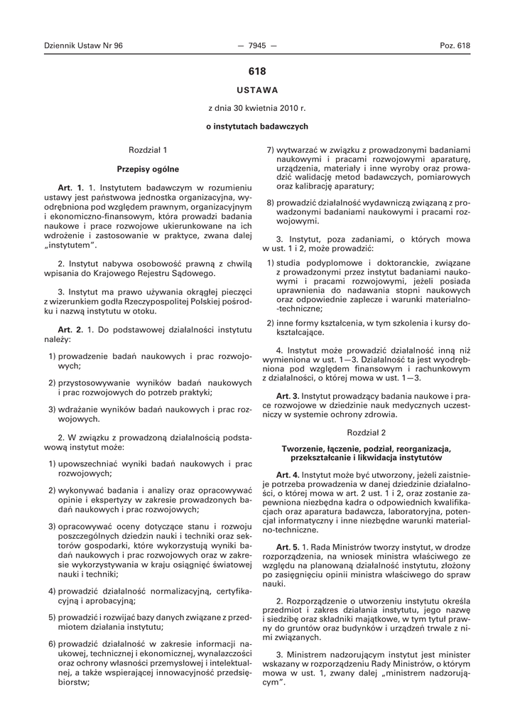 Dziennik Ustaw Nr 96 — 7945 — Poz. 618 618 USTA WA z dnia 30 kwietnia 2010 r. o instytutach badawczych Rozdział 1 Przepisy ogólne Art. 1. 1. Instytutem badawczym w rozumieniu ustawy jest państwowa jednostka organizacyjna, wyodrębniona pod względem prawnym, organizacyjnym i ekonomiczno-finansowym, która prowadzi badania naukowe i prace rozwojowe ukierunkowane na ich wdrożenie i zastosowanie w praktyce, zwana dalej „instytutem”. 2. Instytut nabywa osobowość prawną z chwilą wpisania do Krajowego Rejestru Sądowego. 3. Instytut ma prawo używania okrągłej pieczęci z wizerunkiem godła Rzeczypospolitej Polskiej pośrodku i nazwą instytutu w otoku. Art. 2. 1. Do podstawowej działalności instytutu należy: 1) prowadzenie badań naukowych i prac rozwojowych; 2) przystosowywanie wyników badań naukowych i prac rozwojowych do potrzeb praktyki; 3) wdrażanie wyników badań naukowych i prac rozwojowych. 2. W związku z prowadzoną działalnością podstawową instytut może: 1) upowszechniać wyniki badań naukowych i prac rozwojowych; 2) wykonywać badania i analizy oraz opracowywać opinie i ekspertyzy w zakresie prowadzonych badań naukowych i prac rozwojowych; 3) opracowywać oceny dotyczące stanu i rozwoju poszczególnych dziedzin nauki i techniki oraz sektorów gospodarki, które wykorzystują wyniki badań naukowych i prac rozwojowych oraz w zakresie wykorzystywania w kraju osiągnięć światowej nauki i techniki; 4) prowadzić działalność normalizacyjną, certyfikacyjną i aprobacyjną; 5) prowadzić i rozwijać bazy danych związane z przedmiotem działania instytutu; 6) prowadzić działalność w zakresie informacji naukowej, technicznej i ekonomicznej, wynalazczości oraz ochrony własności przemysłowej i intelektualnej, a także wspierającej innowacyjność przedsiębiorstw; 7) wytwarzać w związku z prowadzonymi badaniami naukowymi i pracami rozwojowymi aparaturę, urządzenia, materiały i inne wyroby oraz prowadzić walidację metod badawczych, pomiarowych oraz kalibrację aparatury; 8) prowadzić działalność wydawniczą związaną z prowadzonymi badaniami naukowymi i pracami rozwojowymi. 3. Instytut, poza zadaniami, o których mowa w ust. 1 i 2, może prowadzić: 1) studia podyplomowe i doktoranckie, związane z prowadzonymi przez instytut badaniami naukowymi i pracami rozwojowymi, jeżeli posiada uprawnienia do nadawania stopni naukowych oraz odpowiednie zaplecze i warunki materialno-techniczne; 2) inne formy kształcenia, w tym szkolenia i kursy dokształcające. 4. Instytut może prowadzić działalność inną niż wymieniona w ust. 1—3. Działalność ta jest wyodrębniona pod względem finansowym i rachunkowym z działalności, o której mowa w ust. 1—3. Art. 3. Instytut prowadzący badania naukowe i prace rozwojowe w dziedzinie nauk medycznych uczestniczy w systemie ochrony zdrowia. Rozdział 2 Tworzenie, łączenie, podział, reorganizacja, przekształcanie i likwidacja instytutów Art. 4. Instytut może być utworzony, jeżeli zaistnieje potrzeba prowadzenia w danej dziedzinie działalności, o której mowa w art. 2 ust. 1 i 2, oraz zostanie zapewniona niezbędna kadra o odpowiednich kwalifikacjach oraz aparatura badawcza, laboratoryjna, potencjał informatyczny i inne niezbędne warunki materialno-techniczne. Art. 5. 1. Rada Ministrów tworzy instytut, w drodze rozporządzenia, na wniosek ministra właściwego ze względu na planowaną działalność instytutu, złożony po zasięgnięciu opinii ministra właściwego do spraw nauki. 2. Rozporządzenie o utworzeniu instytutu określa przedmiot i zakres działania instytutu, jego nazwę i siedzibę oraz składniki majątkowe, w tym tytuł prawny do gruntów oraz budynków i urządzeń trwale z nimi związanych. 3. Ministrem nadzorującym instytut jest minister wskazany w rozporządzeniu Rady Ministrów, o którym mowa w ust. 1, zwany dalej „ministrem nadzorującym”. Dziennik Ustaw Nr 96 — 7946 — 4. W akcie o utworzeniu instytutu wskazuje się mienie, w które wyposaża się instytut. Akt ten wskazuje także formę i sposób tego wyposażenia. Art. 6. 1. Minister nadzorujący wyposaża instytut w środki niezbędne do prowadzenia działalności określonej w akcie o utworzeniu instytutu. 2. Instytut działa na podstawie statutu, który określa przedmiot i zakres działania instytutu. Statut uchwala rada naukowa, a zatwierdza minister nadzorujący. 3. Pierwszy statut nowo utworzonemu instytutowi oraz statut instytutowi powstałemu w wyniku połączenia lub podziału nadaje minister nadzorujący. Pierwszy statut obowiązuje do czasu zatwierdzenia przez ministra nadzorującego statutu uchwalonego zgodnie z trybem, o którym mowa w ust. 2. 4. Strukturę organizacyjną instytutu określa regulamin organizacyjny ustalony przez dyrektora, po zasięgnięciu opinii rady naukowej oraz zakładowych organizacji związkowych. 5. Do czasu powołania dyrektora w tworzonym instytucie minister nadzorujący wyznacza na okres nie dłuższy niż 6 miesięcy osobę pełniącą funkcję kierownika instytutu. Poz. 618 2. Minister właściwy ze względu na planowaną działalność instytutu powołuje zespół roboczy do przeprowadzenia postępowania przygotowawczego. Zespół roboczy przedstawia ministrowi opinię w terminie 3 miesięcy od dnia powołania. 3. Połączenie, podział, reorganizację, przekształcenie lub likwidację instytutu poprzedza postępowanie przygotowawcze mające na celu ocenę potrzeby oraz warunków jego połączenia, podziału, reorganizacji, przekształcenia lub likwidacji. 4. Minister nadzorujący powołuje zespół roboczy do przeprowadzenia postępowania przygotowawczego. Zespół roboczy przedstawia ministrowi opinię w terminie 3 miesięcy od dnia powołania. 5. Opinie w sprawie połączenia, podziału, reorganizacji, przekształcenia lub likwidacji instytutu przedstawiają ministrowi nadzorującemu również rada naukowa oraz dyrektor instytutu. 6. Rada Ministrów