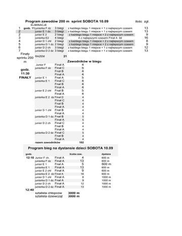 Program zawodów 200 m sprint SOBOTA 10.09 1 2 2 3 4 5 6 7 ELIMINACJE godz. 11:00 juniorka F dz 3 junior E 1 dz. 3 junior E 2 2 juniorka E2 4 junior D 1 chł 2 juniorka D 1 dz. 2 junior D 2 ch 3 juniorka D 2 dz 3 Finały RAZEM sprintu 200 m godz. 11:30 FINAŁY Junior F juniorka F dz junior E 1 juniorka E 1 junior E 2 chł biegi biegi biegi biegi biegi biegi biegi biegi z każdego biegu 1 miejsce + 1 z najlepszym czasem z każdego biegu 1 miejsce + 1 z najlepszym czasem z każdego biegu 1 miejsce + 2 z najlepszym czasem 4 z najlepszymi czasami Finał A itd z każdego biegu 1 miejsce + 2 z najlepszym czasem z każdego biegu 1 miejsce + 2 z najlepszym czasem z każdego biegu 1 miejsce + 1 z najlepszym czasem z każdego biegu 1 miejsce + 1 z najlepszym czasem 21 Finał A Finał C Fnał B Finał A Fnał A Finał C Fnał B Finał A Fnał B Finał A juniorka E 2 dz.Finał D Finał C Fnał B Finał A junior D 1 chł Fnał B Finał A juniorka D 1 dz. Fnał B Finał A junior D 2 ch Finał C Fnał B Finał A juniorka D 2 dz Finał C Fnał B Finał A razem zawodników Zawodników w biegu 4 5 4 4 5 4 4 4 5 4 4 4 4 4 4 4 5 5 4 4 4 5 4 4 102 Program bieg na dystansie dzieci SOBOTA 10.09 godz. liczba zaw. 12:10 Junior F ch. Finał A Finał A Fnał A Finał A Finał A 4 13 5 13 9 juniorka F dz junior E 1 juniorka E 1 junior E 2 chł juniorka E 2 dz.Finał A junior D 1 chł Finał A juniorka D 1 dz. Fnał A junior D 2 ch Finał A juniorka D 2 dz Finał A 12:40 sztafeta chłopców sztafeta dziewcząt 16 8 9 12 13 3000 m 3000 m dystans 600 m 600 m 600 m 600 m 600 m 600 m 1000 m 1000 m 1000 m 1000 m ilośc zgł. 13 13 9 16 8 9 12 13