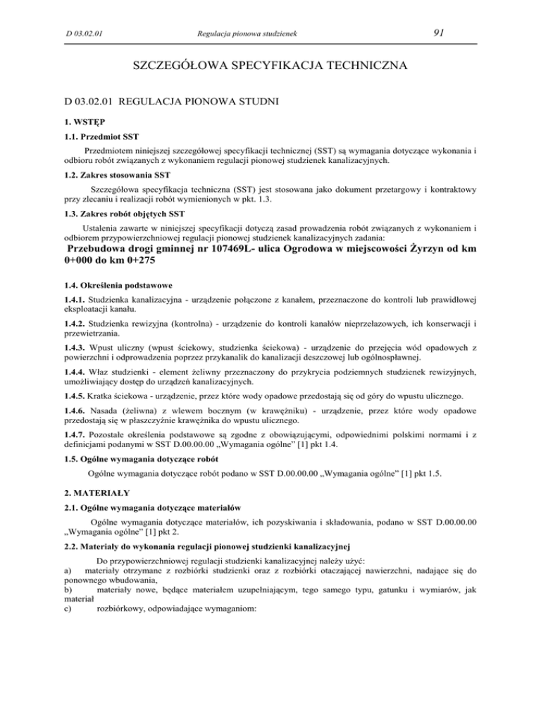D 03.02.01 Regulacja pionowa studzienek 91 SZCZEGÓŁOWA SPECYFIKACJA TECHNICZNA D 03.02.01 REGULACJA PIONOWA STUDNI 1. WSTĘP 1.1. Przedmiot SST Przedmiotem niniejszej szczegółowej specyfikacji technicznej (SST) są wymagania dotyczące wykonania i odbioru robót związanych z wykonaniem regulacji pionowej studzienek kanalizacyjnych. 1.2. Zakres stosowania SST Szczegółowa specyfikacja techniczna (SST) jest stosowana jako dokument przetargowy i kontraktowy przy zlecaniu i realizacji robót wymienionych w pkt. 1.3. 1.3. Zakres robót objętych SST Ustalenia zawarte w niniejszej specyfikacji dotyczą zasad prowadzenia robót związanych z wykonaniem i odbiorem przypowierzchniowej regulacji pionowej studzienek kanalizacyjnych zadania: Przebudowa drogi gminnej nr 107469L- ulica Ogrodowa w miejscowości śyrzyn od km 0+000 do km 0+275 1.4. Określenia podstawowe 1.4.1. Studzienka kanalizacyjna - urządzenie połączone z kanałem, przeznaczone do kontroli lub prawidłowej eksploatacji kanału. 1.4.2. Studzienka rewizyjna (kontrolna) - urządzenie do kontroli kanałów nieprzełazowych, ich konserwacji i przewietrzania. 1.4.3. Wpust uliczny (wpust ściekowy, studzienka ściekowa) - urządzenie do przejęcia wód opadowych z powierzchni i odprowadzenia poprzez przykanalik do kanalizacji deszczowej lub ogólnospławnej. 1.4.4. Właz studzienki - element Ŝeliwny przeznaczony do przykrycia podziemnych studzienek rewizyjnych, umoŜliwiający dostęp do urządzeń kanalizacyjnych. 1.4.5. Kratka ściekowa - urządzenie, przez które wody opadowe przedostają się od góry do wpustu ulicznego. 1.4.6. Nasada (Ŝeliwna) z wlewem bocznym (w krawęŜniku) - urządzenie, przez które wody opadowe przedostają się w płaszczyźnie krawęŜnika do wpustu ulicznego. 1.4.7. Pozostałe określenia podstawowe są zgodne z obowiązującymi, odpowiednimi polskimi normami i z definicjami podanymi w SST D.00.00.00 „Wymagania ogólne” [1] pkt 1.4. 1.5. Ogólne wymagania dotyczące robót Ogólne wymagania dotyczące robót podano w SST D.00.00.00 „Wymagania ogólne” [1] pkt 1.5. 2. MATERIAŁY 2.1. Ogólne wymagania dotyczące materiałów Ogólne wymagania dotyczące materiałów, ich pozyskiwania i składowania, podano w SST D.00.00.00 „Wymagania ogólne” [1] pkt 2. 2.2. Materiały do wykonania regulacji pionowej studzienki kanalizacyjnej Do przypowierzchniowej regulacji studzienki kanalizacyjnej naleŜy uŜyć: a) materiały otrzymane z rozbiórki studzienki oraz z rozbiórki otaczającej nawierzchni, nadające się do ponownego wbudowania, b) materiały nowe, będące materiałem uzupełniającym, tego samego typu, gatunku i wymiarów, jak materiał c) rozbiórkowy, odpowiadające wymaganiom: 92 Regulacja pionowa studzienek D 03.02.01 3. SPRZĘT 3.1. Ogólne wymagania dotyczące sprzętu Ogólne wymagania dotyczące sprzętu podano w SST D.00.00.00 „Wymagania ogólne” [1] pkt 3. 3.2. Sprzęt stosowany do wykonania regulacji pionowej studzienki kanalizacyjnej i telefonicznej Wykonawca przystępujący do wykonania regulacji, powinien wykazać się moŜliwością korzystania z następującego sprzętu: − piły tarczowej, − młota pneumatycznego, − spręŜarki powietrza, − zagęszczarki wibracyjnej, − sprzętu pomocniczego (szczotka, łopata, szablon itp.). 4. TRANSPORT 4.1. Ogólne wymagania dotyczące transportu Ogólne wymagania dotyczące transportu podano w SST D.00.00.00 „Wymagania ogólne” [1] pkt 4. 4.2. Transport materiałów Transport nowych materiałów do wykonania naprawy, powinien odpowiadać wymaganiom określonym w: a) SST D-03.02.01 [2], w przypadku materiałów do naprawy studzienki, b) SST, wymienionych w pkcie 5.6 niniejszej specyfikacji, w przypadku materiałów wykorzystywanych do wykonania nowej nawierzchni. 5. WYKONANIE ROBÓT 5.1. Ogólne zasady wykonania robót Ogólne zasady wykonania robót podano w SST D.00.00.00 „Wymagania ogólne” [1] pkt 5. 5.2. Wykonanie naprawy uszkodzonej studzienki JeŜeli dokumentacja projektowa lub SST nie przewiduje inaczej, to wykonanie przypowierzchniowej regulacji studzienki, pod warunkiem zaakceptowania przez InŜyniera, obejmuje: 1. zdjęcie przykrycia (pokrywy, włazu, kratki ściekowej, nasady z wlewem bocznym) urządzenia podziemnego, 2. rozebranie nawierzchni wokół studzienki: − ręczne (dłutami, haczykami z drutu, młotkami brukarskimi, ew. drągami stalowymi itp. - w przypadku nawierzchni typu kostkowego), − mechaniczne (w przypadku nawierzchni typu monolitycznego, np. nawierzchni asfaltowej, betonowej) - z pionowym wycięciem krawędzi uszkodzenia piłą tarczową i rozebraniem konstrukcji jezdni przy pomocy młotów pneumatycznych, drągów stalowych itp., 3. zebranie i odwiezienie lub odrzucenie elementów nawierzchni i gruzu na pobocze, chodnik lub miejsce składowania, z posortowaniem i zabezpieczeniem materiału przydatnego do dalszych robót, 4. sprawdzenie stanu konstrukcji studzienki i oczyszczenie górnej części studzienki (np. nasady wpustu, komina włazowego) z ew. uzupełnieniem ubytków, 5. osadzenie przykrycia studzienki lub kratki ściekowej z wykorzystaniem istniejących lub nowych materiałów oraz ew. wyrównaniem zaprawą cementową. W przypadku znacznych zapadnięć studzienki, wynikających z uszkodzeń (zniszczeń) korpusu studzienki, kanałów, przykanalików, elementów dennych, wymycia gruntu itp. - sposób naprawy naleŜy określić indywidualnie i wykonać ją według osobno opracowanej specyfikacji technicznej. 5.6. UłoŜenie nowej nawierzchni Nową nawierzchnię, wokół wyregulowanej studzienki, naleŜy wykonać w sposób zgodny z projektem. D 03.02.01 Regulacja pionowa studzienek 93 6. KONTROLA JAKOŚCI ROBÓT 6.1. Ogólne zasady kontroli jakości robót Ogólne zasady kontroli jakości robót podano w SST D.00.00.00 „Wymagania ogólne” [1] pkt 6. 6.2. Badania przed przystąpieniem do robót Przed przystąpieniem do robót Wykonawca powinien: − uzyskać wymagane dok