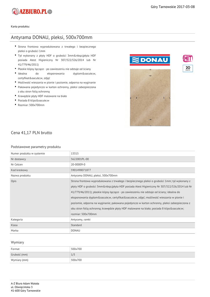 Góry Tarnowskie 2017-03-08 Karta produktu: Antyrama DONAU, pleksi, 500x700mm Strona frontowa wyprodukowana z trwałego i bezpiecznego pleksi o grubości 1mm Tył wykonany z płyty HDF o grubości 3mm (płyta HDF posiada Atest Higieniczny Nr 307/322/326/2014 lub Nr 41/779/46/2011) Płaskie klipsy łączące - po zawieszeniu nie odstaje od ściany Idealna do eksponowania dyplomów, certyfikatów, zdjęć Możliwość wieszania w pionie i poziomie, odporna na wyginanie Pakowana pojedynczo w karton ochronny, pleksi zabezpieczona z obu stron folią ochronną Krawędzie płyty HDF malowane na biało Posiada 8 klipsów Rozmiar: 500x700mm Cena 41,17 PLN brutto Podstawowe parametry produktu Numer produktu w systemie 13315 Nr dostawcy 5622001PL-00 Nr Celcen 20-00009-0 Kod kreskowy 5901498071877 Nazwa produktu Antyrama DONAU, pleksi, 500x700mm Opis Strona frontowa wyprodukowana z trwałego i bezpiecznego pleksi o grubości 1mm; tył wykonany z płyty HDF o grubości 3mm (płyta HDF posiada Atest Higieniczny Nr 307/322/326/2014 lub Nr 41/779/46/2011); płaskie klipsy łączące - po zawieszeniu nie odstaje od ściany; idealna do eksponowania dyplomów, certyfikatów, zdjęć; możliwość wieszania w pionie i poziomie, odporna na wyginanie; pakowana pojedynczo w karton ochronny, pleksi zabezpieczona z obu stron folią ochronną; krawędzie płyty HDF malowane na biało; posiada 8 klipsów; rozmiar: 500x700mm Kategoria Antyramy, ramki Klasa Standard Marka DONAU Wymiary Format 500x700 Grubość (mm) 1/3 Wymiary (mm) 500x700 A-Z Biuro Adam Watoła ul. Oświęcimska 3 41-600 Góry Tarnowskie Góry Tarnowskie 2017-03-08 Karta katalogowa produktu cd. Antyrama DONAU, pleksi, 500x700mm Cecha W ofercie od 2013-01 Materiał Pleksi/HDF Typ Nietłukąca Produkt Antyrama Zamiennik Zamiennik KF15657 Wspólny słownik zamówień CPV 39298200-9 Ramki do obrazków Certyfikaty Nowy produkt w ofercie Standard Hit Standard Kolor Kolor Pozostałe zdjęcia produktu Serdecznie zapraszamy do współpracy A-Z Biuro Adam Watoła zespół. A-Z Biuro Adam Watoła ul. Oświęcimska 3 41-600 Góry Tarnowskie Transparentny