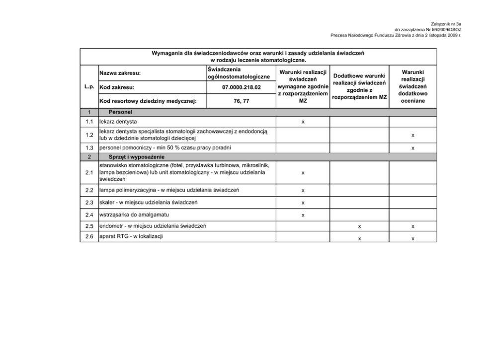 Załącznik nr 3a do zarządzenia Nr 59/2009/DSOZ Prezesa Narodowego Funduszu Zdrowia z dnia 2 listopada 2009 r. Wymagania dla świadczeniodawców oraz warunki i zasady udzielania świadczeń w rodzaju leczenie stomatologiczne. Nazwa zakresu: L.p. Kod zakresu: Świadczenia ogólnostomatologiczne 07.0000.218.02 Kod resortowy dziedziny medycznej: 1 76, 77 Warunki realizacji Dodatkowe warunki świadczeń realizacji świadczeń wymagane zgodnie zgodnie z z rozporządzeniem rozporządzeniem MZ MZ Warunki realizacji świadczeń dodatkowo oceniane Personel 1.1 lekarz dentysta 1.2 lekarz dentysta specjalista stomatologii zachowawczej z endodoncją lub w dziedzinie stomatologii dziecięcej x 1.3 personel pomocniczy - min 50 % czasu pracy poradni x 2 x Sprzęt i wyposażenie 2.1 stanowisko stomatologiczne (fotel, przystawka turbinowa, mikrosilnik, lampa bezcieniowa) lub unit stomatologiczny - w miejscu udzielania świadczeń x 2.2 lampa polimeryzacyjna - w miejscu udzielania świadczeń x 2.3 skaler - w miejscu udzielania świadczeń x 2.4 wstrząsarka do amalgamatu x 2.5 endometr - w miejscu udzielania świadczeń x x 2.6 aparat RTG - w lokalizacji x x Załącznik nr 3b do zarządzenia Nr 59/2009/DSOZ Prezesa Narodowego Funduszu Zdrowia z dnia 2 listopada 2009 r. Wymagania dla świadczeniodawców oraz warunki i zasady udzielania świadczeń w rodzaju leczenie stomatologiczne. Nazwa zakresu: L.p. Kod zakresu: Świadczenia ogólnostomatologicz Warunki realizacji Dodatkowe warunki ne dla dzieci i świadczeń wymagane realizacji świadczeń młodzieży do 18. r.ż. zgodnie z zgodnie z 07.0000.221.02 rozporządzeniem MZ rozporządzeniem MZ Kod resortowy dziedziny medycznej: 76, 77 Personel 1 1.1 lekarz dentysta 1.2 Warunki realizacji świadczeń dodatkowo oceniane x lekarz dentysta specjalista stomatologii zachowawczej z endodoncją lub w dziedzinie stomatologii dziecięcej x 1.3 personel pomocniczy - min 50 % czasu pracy poradni 2 x Sprzęt i wyposażenie 2.1 stanowisko stomatologiczne (fotel, przystawka turbinowa, mikrosilnik, lampa bezcieniowa) lub unit stomatologiczny - w miejscu udzielania świadczeń 2.2 lampa polimeryzacyjna - w miejscu udzielania świadczeń x 2.3 skaler - w miejscu udzielania świadczeń x 2.4 wstrząsarka do amalgamatu x x 2.5 endometr - w miejscu udzielania świadczeń x x 2.6 aparat RTG lub radiowizjograf - w lokalizacji x x Załącznik nr 3c do zarządzenia Nr 59/2009/DSOZ Prezesa Narodowego Funduszu Zdrowia z dnia 2 listopada 2009 r. Wymagania dla świadczeniodawców oraz warunki i zasady udzielania świadczeń w rodzaju leczenie stomatologiczne. Nazwa zakresu: L.p. Świadczenia ogólnostomatologiczne udzielane w znieczuleniu ogólnym Kod zakresu: 07.0000.219.02 Kod resortowy dziedziny medycznej: 77, 72 Warunki realizacji Dodatkowe świadczeń warunki realizacji wymagane świadczeń zgodnie zgodnie z z rozporządzeniem rozporządzeniem MZ MZ Warunki realizacji świadczeń dodatkowo oceniane Personel 1 1.1 lekarz dentysta posiadający co najmniej specjalizację I stopnia w zakresie stomatologii ogólnej lub w zakresie chirurgii stomatologicznej x 1.2 personel pomocniczy - pełny wymiar czasu pracy poradni x 1.3 lekarz posiadający co najmniej specjalizację I stopnia w zakresie anestezjologii i intensywnej terapii x 1.4 pielęgniarka anestezjologiczna x 1.5 lekarz specjalista stomatologii zachowawczej z endodoncją lub stomatologii dziecięcej lub chirurgii stomatologicznej x Sprzęt i wyposażenie 2 2.1 stanowisko stomatologiczne (fotel, przystawka turbinowa, mikrosilnik, lampa bezcieniowa) lub unit stomatologiczny - w miejscu udzielania świadczeń x 2.2 skaler - w miejscu udzielania świadczeń x 2.3 lampa polimeryzacyjna - w miejscu udzielania świadczeń x 2.4 wstrząsarka do amalgamatu x 2.5 stanowisko do znieczuleń x 2.6 stanowisko wybudzeń x 2.7 aparatura anestezjologiczna stanowiska znieczulenia ogólnego x 2.8 aparat RTG lub radiowizjograf - w lokalizacji x x Załącznik nr 3d do zarządzenia Nr 59/2009/DSOZ Prezesa Narodowego Funduszu Zdrowia z dnia 2 listopada 2009 r. Wymagania dla świadczeniodawców oraz warunki i zasady udzielania świadczeń w rodzaju leczenie stomatologiczne. Nazwa zakresu: L.p. Świadczenia chirurgii stomatologicznej i periodontologii Kod zakresu: Kod resortowy dziedziny medycznej: 1 07.0000.220.02 Dodatkowe Warunki realizacji warunki realizacji świadczeń wymagane zgodnie świadczeń zgodnie z rozporządzeniem z rozporządzeniem MZ MZ 06, 72, 74 Personel lekarz dentysta posiadający specjalizację I stopnia w zakresie chirurgii 1.1 stomatologicznej lub lekarz dentysta specjalista chirurgii szczękowotwarzowej, periodontologii lub paradontologii x 1.2 personel pomocniczy - pełny wymiar czasu pracy poradni x 2 Warunki realizacji świadczeń dodatkowo oceniane Sprzęt i wyposażenie stanowisko stomatologiczne (fotel, przystawka turbinowa, mikrosilnik, lampa 2.1 bezcieniowa) lub unit stomatologiczny - w miejscu miejscu udzielania świadczeń x 2.2 skaler - w miejscu x x 2.3 aparat RTG lub radiowizjograf - w lokalizacji x x 3 3.1 badania histopatologiczne Zapewnienie realizacji x Załącznik nr 3e do zarządzenia Nr 59/2009/DSOZ Prezesa Narodowego Funduszu Zdrowia z dnia 2 listopada 2009 r. Wymagania dla świadczeniodawców oraz warunki i zasady udzielania świadczeń w rodzaju leczenie stomatologiczne. Nazwa zakresu: L.p. Kod zakresu: Świadczenia protetyki stomatologicznej 07.0000.214.02 Kod resortowy dziedziny medycznej: 75 Warunki realizacji Dodatkowe świadczeń warunki realizacji wymagane zgodnie świadczeń zgodnie z rozporządzeniem z rozporządzeniem MZ MZ Personel 1 1.1 lekarz dentysta specjalista protetyki stomatologicznej x 1.2 personel pomocniczy - minimum 50% czasu pracy poradni x Sprzęt i wyposażenie 2 2.1 Warunki realizacji świadczeń dodatkowo oceniane stanowisko stomatologiczne (fotel, przystawka turbinowa, mikrosilnik, lampa bezcieniowa) lub unit stomatologiczny - w miejscu udzielania świadczeń 2.2 aparat RTG lub 