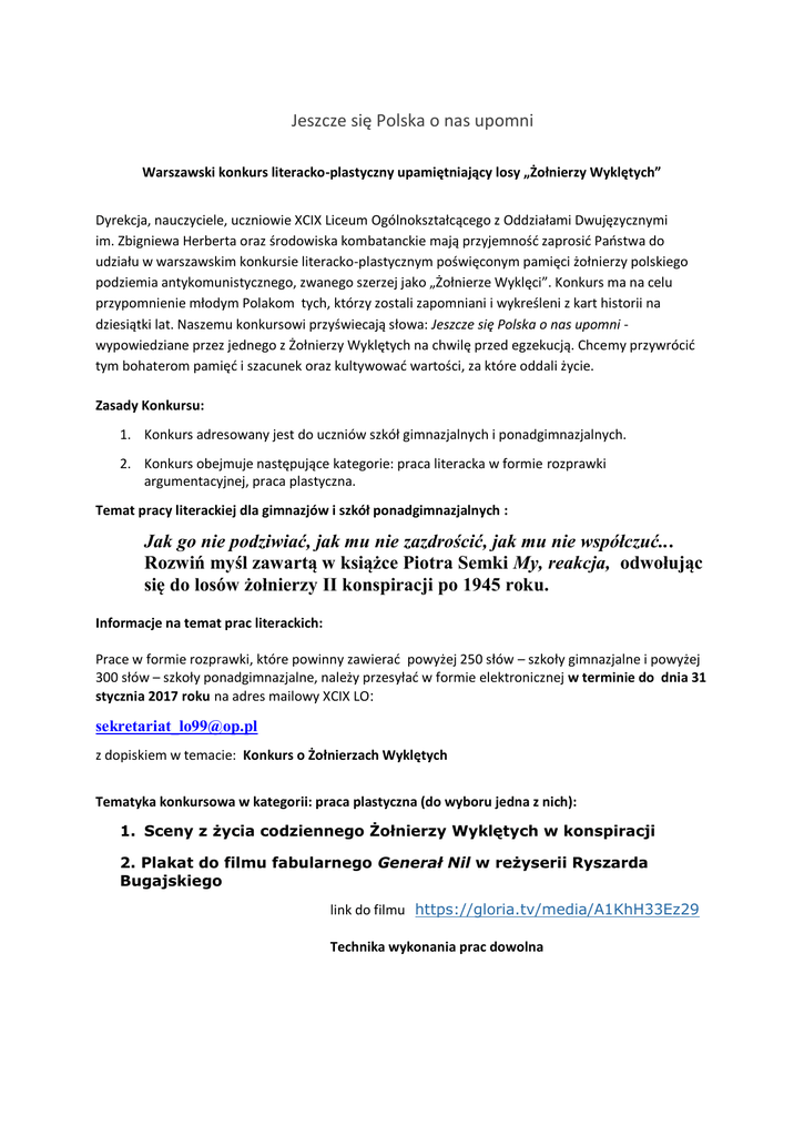 Jeszcze się Polska o nas upomni Warszawski konkurs literacko-plastyczny upamiętniający losy „Żołnierzy Wyklętych” Dyrekcja, nauczyciele, uczniowie XCIX Liceum Ogólnokształcącego z Oddziałami Dwujęzycznymi im. Zbigniewa Herberta oraz środowiska kombatanckie mają przyjemność zaprosić Państwa do udziału w warszawskim konkursie literacko-plastycznym poświęconym pamięci żołnierzy polskiego podziemia antykomunistycznego, zwanego szerzej jako „Żołnierze Wyklęci”. Konkurs ma na celu przypomnienie młodym Polakom tych, którzy zostali zapomniani i wykreśleni z kart historii na dziesiątki lat. Naszemu konkursowi przyświecają słowa: Jeszcze się Polska o nas upomni wypowiedziane przez jednego z Żołnierzy Wyklętych na chwilę przed egzekucją. Chcemy przywrócić tym bohaterom pamięć i szacunek oraz kultywować wartości, za które oddali życie. Zasady Konkursu: 1. Konkurs adresowany jest do uczniów szkół gimnazjalnych i ponadgimnazjalnych. 2. Konkurs obejmuje następujące kategorie: praca literacka w formie rozprawki argumentacyjnej, praca plastyczna. Temat pracy literackiej dla gimnazjów i szkół ponadgimnazjalnych : Jak go nie podziwiać, jak mu nie zazdrościć, jak mu nie współczuć... Rozwiń myśl zawartą w książce Piotra Semki My, reakcja, odwołując się do losów żołnierzy II konspiracji po 1945 roku. Informacje na temat prac literackich: Prace w formie rozprawki, które powinny zawierać powyżej 250 słów – szkoły gimnazjalne i powyżej 300 słów – szkoły ponadgimnazjalne, należy przesyłać w formie elektronicznej w terminie do dnia 31 stycznia 2017 roku na adres mailowy XCIX LO: [email protected] z dopiskiem w temacie: Konkurs o Żołnierzach Wyklętych Tematyka konkursowa w kategorii: praca plastyczna (do wyboru jedna z nich): 1. Sceny z życia codziennego Żołnierzy Wyklętych w konspiracji 2. Plakat do filmu fabularnego Generał Nil w reżyserii Ryszarda Bugajskiego link do filmu https://gloria.tv/media/A1KhH33Ez29 Technika wykonania prac dowolna Informacje na temat prac plastycznych: Prace plastyczne mogą zostać wykonane w formie obrazu, rysunku, fotografii, grafiki komputerowej lub innej. Rozmiar- papier w rozmiarze A2 lub A3 w przypadku obrazu lub rysunku, profesjonalna odbitka zdjęcia w formacie A2 lub A3; grafika komputerowa- wydruk w rozmiarze A2 lub A3 lub film na nośniku cyfrowym. Prace plastyczne, w zamkniętej kopercie z dopiskiem: Konkurs o Żołnierzach Wyklętych należy nadesłać pocztą w terminie do dnia 31 stycznia 2017 roku na adres: XCIX Liceum Ogólnokształcącego z Oddziałami Dwujęzycznymi im. Zbigniewa Herberta, ul. Fundamentowa 38/42, 04-046 Warszawa, (decyduje data stempla pocztowego) Nagrody będą przyznane w dwóch kategoriach - pracy literackiej oraz pracy plastycznej. Zostaną ufundowane przez kombatantów Polski Podziemnej i organizatorów konkursu. Termin ogłoszenia wyników Ogolnokształcącego. zostanie podany na stronie internetowej XCIX Liceum Uroczyste rozdanie nagród odbędzie się w siedzibie Światowego Związku Armii Krajowej przy ulicy Zielnej 39 w Warszawie lub innym miejscu ustalonym przez organizatora Konkursu.
