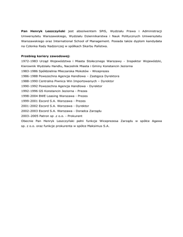 Pan Henryk Leszczyński jest absolwentem SPiS, Wydziału Prawa i Administracji Uniwersytetu Warszawskiego, Wydziału Dziennikarstwa i Nauk Politycznych Uniwersytetu Warszawskiego oraz International School of Management. Posiada takŜe dyplom kandydata na Członka Rady Nadzorczej w spółkach Skarbu Państwa. Przebieg kariery zawodowej: 1972-1983 Urząd Województwa i Miasta Stołecznego Warszawy - Inspektor Wojewódzki, Kierownik Wydziału Handlu, Naczelnik Miasta i Gminy Konstancin Jeziorna 1983-1986 Spółdzielnia Mleczarska Mokotów - Wiceprezes 1986-1988 Powszechna Agencja Handlowa – Zastępca Dyrektora 1988-1990 Centralna Piwnica Win Importowanych – Dyrektor 1990-1992 Powszechna Agencja Handlowa - Dyrektor 1992-1996 GS Konstancin Jeziorna - Prezes 1998-2004 BWE Leasing Warszawa - Prezes 1999-2001 Escord S.A. Warszawa - Prezes 2001-2002 Escord S.A. Warszawa - Dyrektor 2002-2003 Escord S.A. Warszawa - Doradca Zarządu 2003–2005 Patron sp .z o.o. - Prokurent Obecnie Pan Henryk Leszczyński pełni funkcje Wiceprezesa Zarządu w spółce Agawa sp. z o.o. oraz funkcje prokurenta w spółce Maksimus S.A.