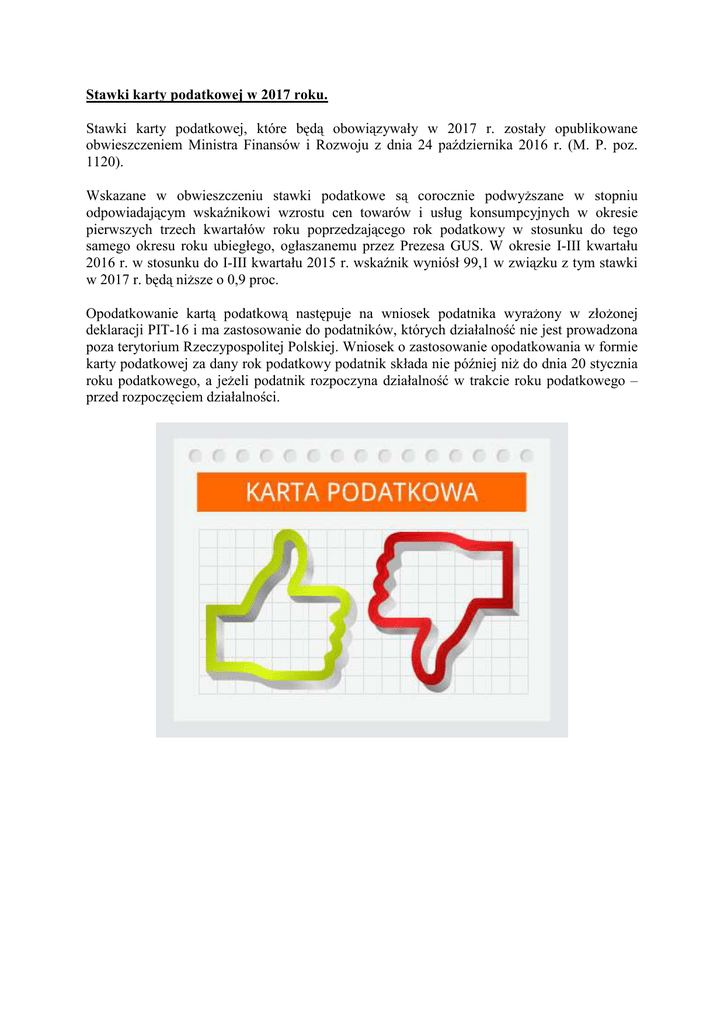 Stawki karty podatkowej w 2017 roku. Stawki karty podatkowej, które będą obowiązywały w 2017 r. zostały opublikowane obwieszczeniem Ministra Finansów i Rozwoju z dnia 24 października 2016 r. (M. P. poz. 1120). Wskazane w obwieszczeniu stawki podatkowe są corocznie podwyższane w stopniu odpowiadającym wskaźnikowi wzrostu cen towarów i usług konsumpcyjnych w okresie pierwszych trzech kwartałów roku poprzedzającego rok podatkowy w stosunku do tego samego okresu roku ubiegłego, ogłaszanemu przez Prezesa GUS. W okresie I-III kwartału 2016 r. w stosunku do I-III kwartału 2015 r. wskaźnik wyniósł 99,1 w związku z tym stawki w 2017 r. będą niższe o 0,9 proc. Opodatkowanie kartą podatkową następuje na wniosek podatnika wyrażony w złożonej deklaracji PIT-16 i ma zastosowanie do podatników, których działalność nie jest prowadzona poza terytorium Rzeczypospolitej Polskiej. Wniosek o zastosowanie opodatkowania w formie karty podatkowej za dany rok podatkowy podatnik składa nie później niż do dnia 20 stycznia roku podatkowego, a jeżeli podatnik rozpoczyna działalność w trakcie roku podatkowego – przed rozpoczęciem działalności.