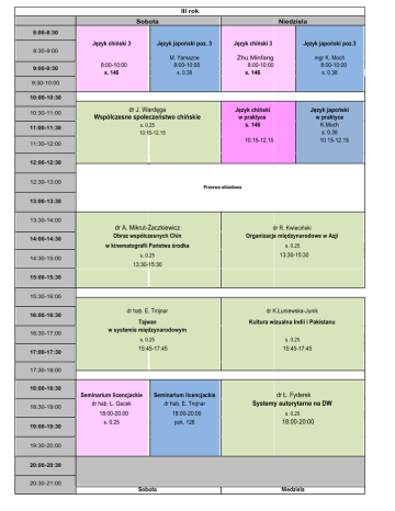 III rok Sobota Niedziela 8:00-8:30 Język chiński 3 Język japoński poz. 3 Język chiński 3 Język japoński poz.3 8:30-9:00 9:00-9:30 M. Yamazoe 8:00-10:00 s. 0.38 8:00-10:00 s. 146 mgr K. Moch 8:00-10:00 s. 0.38 Zhu Minfang 8:00-10:00 s. 146 9:30-10:00 10:00-10:30 10:30-11:00 dr J. Wardęga Współczesne społeczeństwo chińskie Język chiński w praktyce s. 146 s. 0.25 10:15-12.15 11:00-11:30 Język japoński w praktyce K.Moch s. 0.38 10.15-12.15 10.15-12.15 11:30-12:00 12:00-12:30 12:30-13:00 Przerwa obiadowa 13:00-13:30 13:30-14:00 dr A. Mikrut-Żaczkiewicz 14:00-14:30 Obraz współczesnych Chin dr R. Kwieciński Organizacje międzynarodowe w Azji w kinematografii Państwa środka s. 0.25 s. 0.25 13:30-15:30 14:30-15:00 13:30-15:30 15:00-15:30 15:30-16:00 16:00-16:30 16:30-17:00 dr hab. E. Trojnar dr K.Łuniewska-Junik Tajwan w systemie międzynarodowym Kultura wizualna Indii i Pakistanu s. 0.25 s. 0.25 15:45-17:45 17:00-17:30 15:45-17:45 17:30-18:00 18:00-18:30 18:30-19:00 19:00-19:30 Seminarium licencjackie dr hab. Ł. Gacek Seminarium licencjackie dr hab. E. Trojnar 18:00-20:00 s. 0.25 18:00-20:00 pok. 126 dr Ł. Fyderek Systemy autorytarne na DW s. 0.25 18:00-20:00 19:30-20:00 20:00-20:30 20:30-21:00 Sobota Niedziela