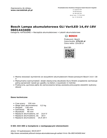 Zapraszamy do sklepu www.narzedziak.pl.pl Przedsiębiorstwo Handlowo Usługowe Gaabi Sławomir Gagatek ul. Legnicka 52A 54-204 Wrocław tel. 801 003 154 dla tel. kom.: 71 724 25 00 fax: 71 724 20 96 Bosch Lampa akumulatorowa GLI VariLED 14,4V-18V 0601443400 kategoria: KATEGORIE > Narzędzia akumulatorowe > Latarki akumulatorowe Producent: Bosch Cena brutto: 275,52 zł Cena netto: 224,00 zł Kod QR: Można stosować wymiennie ze wszystkimi akumulatorami litowo-jonowymi Bosch 14,4 i 18 V Maksymalna wytrzymałość: dzięki elastycznej obudowie Dura Shield urządzenie zachowuje pełną sprawność nawet po upadku na beton z wysokości 2 metrów Praktyczna, gumowa pętla do zamocowania lampy pozwala precyzyjnie oświetlić wybrany obszar Dane techniczne Czas pracy 150 min Waga (bez akumulatora) 0,3 kg Długość 130 mm Szerokość 80 mm Wysokość 40 mm Napięcie akumulatora, od 14,4 V Napięcie akumulatora, do 18 V Napięcie akumulatora 14,4-18 V 0 601 443 400 w komplecie z następującymi elementami: strona: 1/2 wydrukowano: 08-03-2017 http://www.narzedziak.pl/bosch-lampa-akumulatorowa-gli-variled-14-4v-18v-0601443400.html Akumulator i ładowarka nie znajdują się w wyposażeniu standardowym urządzenia Klips do paska Wersja z samym narzędziem Produkt bez akumulatorów i ładowarki w zestawie. strona: 2/2 wydrukowano: 08-03-2017 http://www.narzedziak.pl/bosch-lampa-akumulatorowa-gli-variled-14-4v-18v-0601443400.html