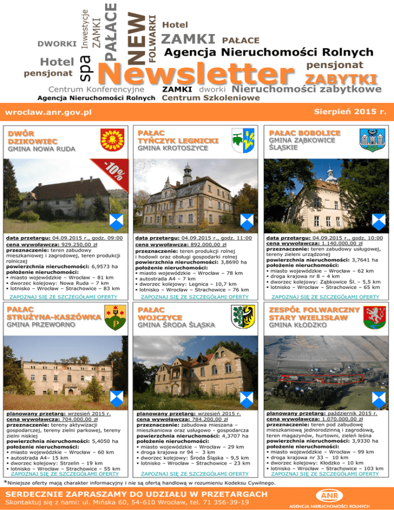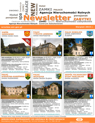 pensjonat FOLWARKI Hotel NEW PAŁACE ZAMKI Inwestycje spa DWORKI Hotel ZAMKI PAŁACE Agencja Nieruchomości Rolnych Newsletter pensjonat ZABYTKI ZAMKI dworki Nieruchomości Agencja Nieruchomości Rolnych Centrum Szkoleniowe Centrum Konferencyjne Sierpień 2015 r. wroclaw.anr.gov.pl DWÓR DZIKOWIEC GMINA NOWA RUDA zabytkowe PAŁAC TYŃCZYK LEGNICKI PAŁAC BOBOLICE GMINA ZĄBKOWICE ŚLĄSKIE GMINA KROTOSZYCE data przetargu: 04.09.2015 r., godz. 09:00 cena wywoławcza: 929.250,00 zł przeznaczenie: teren zabudowy mieszkaniowej i zagrodowej, teren produkcji rolniczej powierzchnia nieruchomości: 6,9573 ha położenie nieruchomości: miasto wojewódzkie – Wrocław – 81 km dworzec kolejowy: Nowa Ruda – 7 km lotnisko – Wrocław – Strachowice – 83 km data przetargu: 04.09.2015 r., godz. 11:00 cena wywoławcza: 892.000,00 zł przeznaczenie: teren produkcji rolnej i hodowli oraz obsługi gospodarki rolnej powierzchnia nieruchomości: 3,8690 ha położenie nieruchomości: miasto wojewódzkie – Wrocław – 78 km autostrada A4 – 7 km dworzec kolejowy: Legnica – 10,7 km lotnisko – Wrocław – Strachowice – 76 km data przetargu: 04.09.2015 r., godz. 10:00 cena wywoławcza: 1.140.000,00 zł przeznaczenie: teren zabudowy usługowej, tereny zieleni urządzonej powierzchnia nieruchomości: 3,7641 ha położenie nieruchomości: miasto wojewódzkie – Wrocław – 62 km droga krajowa nr 8 – 4 km dworzec kolejowy: Ząbkowice Śl. – 5,5 km lotnisko – Wrocław – Strachowice – 65 km ZAPOZNAJ SIĘ ZE SZCZEGÓŁAMI OFERTY ZAPOZNAJ SIĘ ZE SZCZEGÓŁAMI OFERTY ZAPOZNAJ SIĘ ZE SZCZEGÓŁAMI OFERTY PAŁAC STRUŻYNA-KASZÓWKA GMINA PRZEWORNO planowany przetarg: wrzesień 2015 r. cena wywoławcza: 704.000,00 zł przeznaczenie: tereny aktywizacji gospodarczej, tereny zielni parkowej, tereny zielni niskiej powierzchnia nieruchomości: 5,4050 ha położenie nieruchomości: miasto wojewódzkie – Wrocław – 60 km autostrada A4– 15 km dworzec kolejowy: Strzelin – 19 km lotnisko – Wrocław – Strachowice – 55 km ZAPOZNAJ SIĘ ZE SZCZEGÓŁAMI OFERTY *Niniejsze oferty mają charakter informacyjny PAŁAC WOJCZYCE ZESPÓŁ FOLWARCZNY STARY WIELISŁAW GMINA ŚRODA ŚLĄSKA planowany przetarg: wrzesień 2015 r. cena wywoławcza: 784.200,00 zł przeznaczenie: zabudowa mieszana – mieszkaniowa oraz usługowo - gospodarcza powierzchnia nieruchomości: 4,3707 ha położenie nieruchomości: miasto wojewódzkie – Wrocław – 29 km droga krajowa nr 94 – 3 km dworzec kolejowy: Środa Śląska – 9,5 km lotnisko – Wrocław – Strachowice – 23 km ZAPOZNAJ SIĘ ZE SZCZEGÓŁAMI OFERTY GMINA KŁODZKO planowany przetarg: październik 2015 r. cena wywoławcza: 1.070.000,00 zł przeznaczenie: teren pod zabudowę mieszkaniową jednorodzinną i zagrodową, teren magazynów, hurtowni, zieleń leśna powierzchnia nieruchomości: 3,9330 ha położenie nieruchomości: miasto wojewódzkie – Wrocław – 99 km droga krajowa nr 33 – 10 km dworzec kolejowy: Kłodzko – 10 km lotnisko – Wrocław – Strachowice – 103 km ZAPOZNAJ SIĘ ZE SZCZEGÓŁAMI OFERTY i nie są ofertą handlową w rozumieniu Kodeksu Cywilnego. SERDECZNIE ZAPRASZAMY DO UDZIAŁU W PRZETARGACH Skontaktuj się z nami: ul. Mińska 60, 54-610 Wrocław, tel. 71 356-39-19