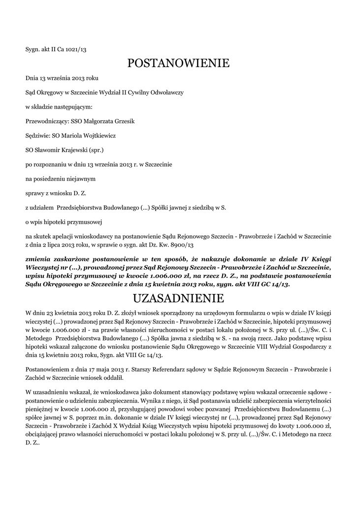 Sygn. akt II Ca 1021/13 POSTANOWIENIE Dnia 13 września 2013 roku Sąd Okręgowy w Szczecinie Wydział II Cywilny Odwoławczy w składzie następującym: Przewodniczący: SSO Małgorzata Grzesik Sędziwie: SO Mariola Wojtkiewicz SO Sławomir Krajewski (spr.) po rozpoznaniu w dniu 13 września 2013 r. w Szczecinie na posiedzeniu niejawnym sprawy z wniosku D. Z. z udziałem Przedsiębiorstwa Budowlanego (...) Spółki jawnej z siedzibą w S. o wpis hipoteki przymusowej na skutek apelacji wnioskodawcy na postanowienie Sądu Rejonowego Szczecin - Prawobrzeże i Zachód w Szczecinie z dnia 2 lipca 2013 roku, w sprawie o sygn. akt Dz. Kw. 8900/13 zmienia zaskarżone postanowienie w ten sposób, że nakazuje dokonanie w dziale IV Księgi Wieczystej nr (...), prowadzonej przez Sąd Rejonowy Szczecin - Prawobrzeże i Zachód w Szczecinie, wpisu hipoteki przymusowej w kwocie 1.006.000 zł, na rzecz D. Z., na podstawie postanowienia Sądu Okręgowego w Szczecinie z dnia 15 kwietnia 2013 roku, sygn. akt VIII GC 14/13. UZASADNIENIE W dniu 23 kwietnia 2013 roku D. Z. złożył wniosek sporządzony na urzędowym formularzu o wpis w dziale IV księgi wieczystej (...) prowadzonej przez Sąd Rejonowy Szczecin - Prawobrzeże i Zachód w Szczecinie, hipoteki przymusowej w kwocie 1.006.000 zł - na prawie własności nieruchomości w postaci lokalu położonej w S. przy ul. (...)/Św. C. i Metodego Przedsiębiorstwa Budowlanego (...) Spółka jawna z siedzibą w S. - na swoją rzecz. Jako podstawę wpisu hipoteki wskazał załączone do wniosku postanowienie Sądu Okręgowego w Szczecinie VIII Wydział Gospodarczy z dnia 15 kwietniu 2013 roku, Sygn. akt VIII Gc 14/13. Postanowieniem z dnia 17 maja 2013 r. Starszy Referendarz sądowy w Sądzie Rejonowym Szczecin - Prawobrzeże i Zachód w Szczecinie wniosek oddalił. W uzasadnieniu wskazał, że wnioskodawca jako dokument stanowiący podstawę wpisu wskazał orzeczenie sądowe postanowienie o udzieleniu zabezpieczenia. Wynika z niego, iż Sąd postanawia udzielić zabezpieczenia wierzytelności pieniężnej w kwocie 1.006.000 zł, przysługującej powodowi wobec pozwanej Przedsiębiorstwu Budowlanemu (...) spółce jawnej w S. poprzez m.in. dokonanie w dziale IV księgi wieczystej nr (...), prowadzonej przez Sąd Rejonowy Szczecin - Prawobrzeże i Zachód X Wydział Ksiąg Wieczystych wpisu hipoteki przymusowej do kwoty 1.006.000 zł, obciążającej prawo własności nieruchomości w postaci lokalu położonej w S. przy ul. (...)/Św. C. i Metodego na rzecz D. Z.. Dalej podał, że zgodnie z poglądem wyrażonym w orzecznictwie - w sytuacji gdy podstawę wpisu stanowi orzeczenie sądowe sąd wieczystoksięgowy nie może badać merytorycznej zasadności orzeczenia, bada jedynie, czy zawiera ono wszystkie dane konieczne do dokonania wpisu, czy jest prawomocne, czy zawiera wzmiankę o wykonalności (jeżeli nie podlega wykonaniu w drodze egzekucji - art. 743 § 2 kpc) i czy z przyczyn technicznych nadaje się do wpisu. (postanowienie Sądu Najwyższego z dnia 17 lica 2008 r., II CSK 115/08, LEX nr 548808). Przedłożony do wniosku odpis postanowienia Sądu Okręgowego w Szczecinie zawiera pod sentencją pieczęć „na oryginale właściwe podpisy za zgodność” i podpis sekretarza sądowego, a także pieczęć okrągłą. Poniżej zaś widnieje wzmianka „na podstawie art. 743 § 2 k.p.c. „postanowienie podlega wykonaniu” jednakże brak podpisu pod przedmiotową wzmianką uniemożliwiał ustalenie, że stwierdzenie wykonalności orzeczenia dokonane zostało przez przewodniczącego. Wniosek nie mógł zostać, więc uwzględniony albowiem przedłożony przez wnioskodawcę dokument nie mógł być uznany za wystarczającą podstawę do wpisu hipoteki przymusowej. W dalszej kolejności zauważono, że przedmiot hipoteki został opisany w postanowieniu jako: prawo własności nieruchomości w postaci lokalu położonego w S. przy ul. (...)/Św. C. i Metodego, podczas gdy księga wieczysta jest prowadzona dla nieruchomości gruntowej, stanowiącej działkę nr (...) o powierzchni 0,0573 ha, położonej w S. przy ul. (...)/Św. C. i Metodego. Tym samym istniejąca między treścią wniosku oraz postanowienia o udzieleniu zabezpieczenia, a treścią księgi wieczystej rozbieżność w oznaczeniu nieruchomości uniemożliwia dokonanie żądanego wpisu. Skargę na powyższe orzeczenie referendarza sądowego wniósł wnioskodawca i zaskarżając postanowienie w całości, domagał się jego zmiany i wpisanie w Dziale IV księgi wieczystej o numerze KW (...) prowadzonej przez Sąd Rejonowy Szczecin - Prawobrzeże i Zachód w Szczecinie X Wydział Ksiąg Wieczystych, hipoteki przymusowej w kwocie 1.006.000 złotych na prawie własności nieruchomości gruntowej położonej w S. przy ul. (...)/Św. C. i Metodego przysługującym Przedsiębiorstwu Budowlanemu (...) spółka jawna z siedzibą w S. na rzecz D. Z.. Zaskarżonemu postanowieniu zarzucił obrazę art. 6269 kpc, poprzez uznanie, że oczywiście mylne oznaczenie w postanowieniu z dnia 15 kwietnia 2013 roku przedmiotu hipoteki jako nieruchomości w postaci lokalu, zamiast nieruchomości gruntowej oraz brak podpisu przewodniczącego pod wzmianką o wykonalności nadawaną przez Sąd z urzędu stanowią przeszkodę do dokonania wpisu w księdze wieczystej, skutkującą oddaleniem wniosku, podczas gdy ww. okoliczności są oczywistymi niedokładnościami i stanowiły co najwyżej braki formalne usuwalne na podstawie art. 130 § 1 kpc, w zw. z ar. 13 § 2 kpc. W uzasadnieniu wskazał, że z załączonych do wniosku dokumentów oraz z treści księgi wieczystej wprost wynika, że przedmiotem własności uczestnika jest nieruchomość gruntowa. Wydając postanowienie o udzieleniu zabezpieczenia z dnia 15 kwietnia 2013 roku Sąd orzekał na podstawie załączonych do wniosku dokumentów, w tym wydruków z ksiąg wieczystych. W kontekście powyższego brak jest, zdaniem wnioskodawcy wątpliwości, że wydając postan