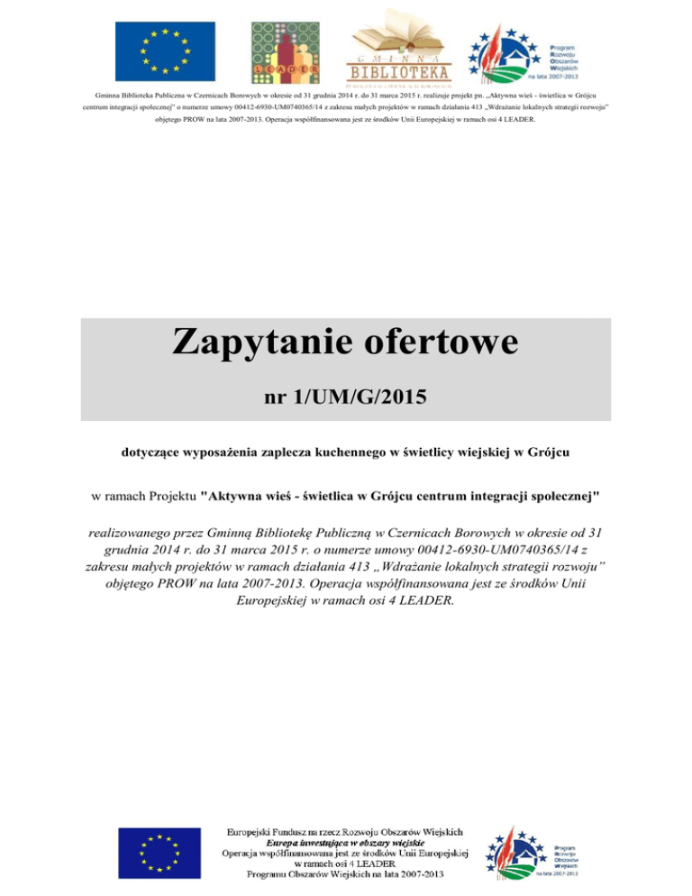Gminna Biblioteka Publiczna w Czernicach Borowych w okresie od 31 grudnia 2014 r. do 31 marca 2015 r. realizuje projekt pn. „Aktywna wieś - świetlica w Grójcu centrum integracji społecznej” o numerze umowy 00412-6930-UM0740365/14 z zakresu małych projektów w ramach działania 413 „Wdrażanie lokalnych strategii rozwoju” objętego PROW na lata 2007-2013. Operacja współfinansowana jest ze środków Unii Europejskiej w ramach osi 4 LEADER. Zapytanie ofertowe nr 1/UM/G/2015 dotyczące wyposażenia zaplecza kuchennego w świetlicy wiejskiej w Grójcu w ramach Projektu "Aktywna wieś - świetlica w Grójcu centrum integracji społecznej" realizowanego przez Gminną Bibliotekę Publiczną w Czernicach Borowych w okresie od 31 grudnia 2014 r. do 31 marca 2015 r. o numerze umowy 00412-6930-UM0740365/14 z zakresu małych projektów w ramach działania 413 „Wdrażanie lokalnych strategii rozwoju” objętego PROW na lata 2007-2013. Operacja współfinansowana jest ze środków Unii Europejskiej w ramach osi 4 LEADER. Gminna Biblioteka Publiczna w Czernicach Borowych w okresie od 31 grudnia 2014 r. do 31 marca 2015 r. realizuje projekt pn. „Aktywna wieś - świetlica w Grójcu centrum integracji społecznej” o numerze umowy 00412-6930-UM0740365/14 z zakresu małych projektów w ramach działania 413 „Wdrażanie lokalnych strategii rozwoju” objętego PROW na lata 2007-2013. Operacja współfinansowana jest ze środków Unii Europejskiej w ramach osi 4 LEADER. ZAMAWIAJĄCY Gminna Biblioteka Publiczna w Czerniach Borowych ul. Chełchowskiego 12 06-415 Czernice Borowe NIP: 761-147-28-78 REGON: 551319574 tel.: 23 674 60 72 PRZEDMIOT ZAMÓWIENIA Przedmiotem zamówienia jest: dostawa w terminie do 20 marca 2015 r. do siedziby Gminnej Biblioteki Publicznej w Czernicach Borowych przy ul. Chełchowskiego 12, 06-415 Czernice Borowe wyposażenia zaplecza kuchennego do świetlicy w miejscowości Grójec: Zakup zastawy w skład której wejdą: 1.Półmisek duży 10 szt., 2. Talerz głęboki 120 szt., 3. Talerz duży obiadowy 120 szt., 4. Talerz deserowy 120 szt., 5. Waza do zupy 10 szt. 6. Chochla do wazy 10 szt., 7. Półmisek mały 10 szt., 8. Salaterka duża 10 szt., 9. Salaterka mała 10 szt., 10. Cukiernica 10 szt., 11. Patera 10 szt., 12. Szklanka 120 szt., 13. Kieliszki 120 szt., 14. Literatki 120 szt., 15. Zestaw sztućców 120 kpl. Gminna Biblioteka Publiczna w Czernicach Borowych w okresie od 31 grudnia 2014 r. do 31 marca 2015 r. realizuje projekt pn. „Aktywna wieś - świetlica w Grójcu centrum integracji społecznej” o numerze umowy 00412-6930-UM0740365/14 z zakresu małych projektów w ramach działania 413 „Wdrażanie lokalnych strategii rozwoju” objętego PROW na lata 2007-2013. Operacja współfinansowana jest ze środków Unii Europejskiej w ramach osi 4 LEADER. Zakup 2 czajników bezprzewodowych (elektrycznych) Zakup 2 kompletów garnków: w komplecie 8 elementów: 4 garnki, 4 szklane pokrywki. Zamawiający nie dopuszcza możliwości składania ofert częściowych. TERMIN WYKONANIA ZAMÓWIENIA Termin dostawy przedmiotu zamówienia do siedziby Zamawiającego: do dnia 20.03.2015 r. INFORMACJA O OŚWIADCZENIACH I DOKUMENTACH, JAKIE MAJĄ DOSTARCZYĆ WYKONAWCY Ofertę należy sporządzić na formularzu ofertowym, którego wzór stanowi Załącznik nr 1 do Zapytania Ofertowego. OSOBY UPARWNIONE DO KONTAKTU Z WYKONAWCAMI Osoby do kontaktu: Iwona Zakrzewska p.o. Kierownik – tel./fax 23 674 60 72; e-mail: [email protected] OPIS SPOSOBU PRZYGOTOWANIA OFERTY Oferta musi mieć formę pisemną i być sporządzona w języku polskim. Oferta powinna zawierać: - imię, nazwisko, firmę, nazwę i dokładny adres Wykonawcy, datę sporządzenia oferty oraz imię i nazwisko osoby uprawnionej do reprezentowania Wykonawcy; - własnoręczny podpis wykonawcy bądź osób mających prawo zaciągać zobowiązania w jego imieniu; Gminna Biblioteka Publiczna w Czernicach Borowych w okresie od 31 grudnia 2014 r. do 31 marca 2015 r. realizuje projekt pn. „Aktywna wieś - świetlica w Grójcu centrum integracji społecznej” o numerze umowy 00412-6930-UM0740365/14 z zakresu małych projektów w ramach działania 413 „Wdrażanie lokalnych strategii rozwoju” objętego PROW na lata 2007-2013. Operacja współfinansowana jest ze środków Unii Europejskiej w ramach osi 4 LEADER. W przypadku przesyłek koperta powinna być oznaczona następująco: Odpowiedź na zapytanie ofertowe nr 1/UM/G/2015 w ramach projektu pn. "Aktywna wieś - świetlica w Grójcu centrum integracji społecznej" Adres: Gminna Biblioteka Publiczna w Czernicach Borowych, ul. Chełchowskiego 12, 06-415 Czernice Borowe MIEJSCE ORAZ TERMIN SKŁADANIA OFERT Oferty można składać: Pocztą lub osobiście na adres Gminna Biblioteka Publiczna w Czernicach Borowych, ul. Chełchowskiego 12, 06-415 Czernice Borowe. Oferty można składać do 11.03.2015 r. włącznie. OPIS KRYTERIÓW, KTÓRYMI ZAMAWIAJĄCY BĘDZIE KIEROWAŁ SIĘ PRZY WYBORZE OFERTY, WRAZ Z PODANIEM ZNACZENIA TYCH KRYTERIÓW Zamawiający przyzna kontrakt Wykonawcy, co do którego oferty ustalono, iż odpowiada ona wymaganiom przedstawionym w niniejszej dokumentacji, oraz który zaoferował najkorzystniejszą – najniższą cenę ofertową brutto. Jeżeli cena zaproponowana przez Wykonawcę przekroczy zaplanowany budżet na wykonanie zadania, oferta zostanie odrzucona. Gminna Biblioteka Publiczna w Czernicach Borowych w okresie od 31 grudnia 2014 r. do 31 marca 2015 r. realizuje projekt pn. „Aktywna wieś - świetlica w Grójcu centrum integracji społecznej” o numerze umowy 00412-6930-UM0740365/14 z zakresu małych projektów w ramach działania 413 „Wdrażanie lokalnych strategii rozwoju” objętego PROW na lata 2007-2013. Operacja współfinansowana jest ze środków Unii Europejskiej w ramach osi 4 LEADER. PROJEKT UMOWY UMOWA NR ..... w ramach Projektu "Aktywna wieś - świetlica w Grójcu centrum integracji społecznej" realizowanego przez Gminną
