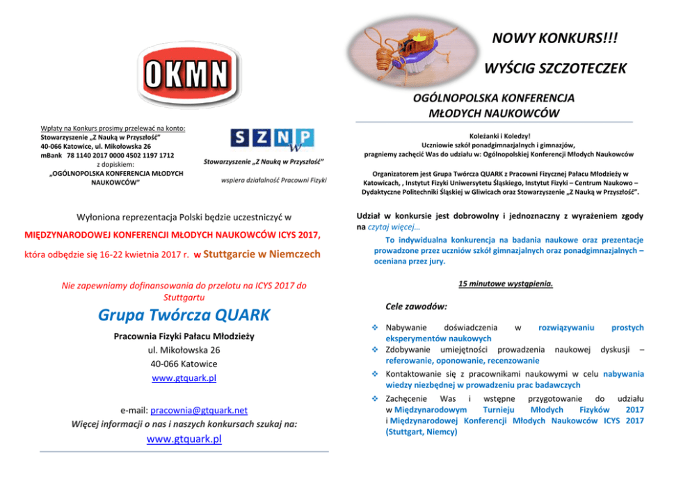 NOWY KONKURS!!! WYŚCIG SZCZOTECZEK OGÓLNOPOLSKA KONFERENCJA MŁODYCH NAUKOWCÓW Wpłaty na Konkurs prosimy przelewad na konto: Stowarzyszenie „Z Nauką w Przyszłośd” 40-066 Katowice, ul. Mikołowska 26 mBank 78 1140 2017 0000 4502 1197 1712 z dopiskiem: „OGÓLNOPOLSKA KONFERENCJA MŁODYCH NAUKOWCÓW” Koleżanki i Koledzy! Uczniowie szkół ponadgimnazjalnych i gimnazjów, pragniemy zachęcid Was do udziału w: Ogólnopolskiej Konferencji Młodych Naukowców Stowarzyszenie „Z Nauką w Przyszłośd” wspiera działalnośd Pracowni Fizyki Wyłoniona reprezentacja Polski będzie uczestniczyd w MIĘDZYNARODOWEJ KONFERENCJI MŁODYCH NAUKOWCÓW ICYS 2017, która odbędzie się 16-22 kwietnia 2017 r. w Stuttgarcie w Niemczech Nie zapewniamy dofinansowania do przelotu na ICYS 2017 do Stuttgartu Grupa Twórcza QUARK Pracownia Fizyki Pałacu Młodzieży ul. Mikołowska 26 40-066 Katowice www.gtquark.pl e-mail: [email protected] Więcej informacji o nas i naszych konkursach szukaj na: www.gtquark.pl Organizatorem jest Grupa Twórcza QUARK z Pracowni Fizycznej Pałacu Młodzieży w Katowicach, , Instytut Fizyki Uniwersytetu Śląskiego, Instytut Fizyki – Centrum Naukowo – Dydaktyczne Politechniki Śląskiej w Gliwicach oraz Stowarzyszenie „Z Nauką w Przyszłośd”. Udział w konkursie jest dobrowolny i jednoznaczny z wyrażeniem zgody na czytaj więcej… To indywidualna konkurencja na badania naukowe oraz prezentacje prowadzone przez uczniów szkół gimnazjalnych oraz ponadgimnazjalnych – oceniana przez jury. 15 minutowe wystąpienia. Cele zawodów: Nabywanie doświadczenia w rozwiązywaniu prostych eksperymentów naukowych Zdobywanie umiejętności prowadzenia naukowej dyskusji – referowanie, oponowanie, recenzowanie Kontaktowanie się z pracownikami naukowymi w celu nabywania wiedzy niezbędnej w prowadzeniu prac badawczych Zachęcenie Was i wstępne przygotowanie do udziału w Międzynarodowym Turnieju Młodych Fizyków 2017 i Międzynarodowej Konferencji Młodych Naukowców ICYS 2017 (Stuttgart, Niemcy) I Etap – Zgłoszenie udziału w Konferencji – Zawodach – 27.10.2016 – w Konferencji mogą brad udział uczniowie gimnazjów oraz szkół ponadgimnazjalnych startując indywidualnie lub w dwuosobowych zespołach, podając imię i nazwisko ucznia (uczniów), adres mailowy, temat pracy, (jedną pracę mogą pisad co najwyżej 2 osoby). Imię i nazwiska nauczyciela-opiekuna pracy, adres mailowy opiekuna i nr telefonu kontaktowego DO AUTORA PRACY. Należy starannie WPISAD dokładny adres szkoły. Formularz zgłoszenia dostępny jest na stronie www.gtquark.pl. Zgłoszenie związane jest z wpłatą wpisowego w wysokości 10 zł od ucznia (nie od pracy). Środki wykorzystujemy na organizację konkursu. Prosimy o zbiorcze wpłaty ze szkół. II Etap – Finał Konferencji – Zawodów – w języku polskim – 24.11.2016 – dla młodzieży umiejącej pokazad własne badania (z zakresu wykorzystania matematyki, fizyki, informatyki w ekologii) prowadzone pod okiem nauczyciela lub opiekuna. Doświadczenia, prace lub projekty badawcze możliwe do wykonania w sali wykładowej lub w klasie szkolnej. Łączny czas na prezentację multimedialną, wykonanie doświadczenia oraz omówienie demonstrowanego zjawiska wynosi 15 minut, a przez 5 minut jurorzy prowadzą dyskusję z uczestnikiem, zadając pytania. III Etap – Finał Konferencji – Zawodów – w języku angielskim – 02.02.2017 – dla osób zainteresowanych, znające język angielski, chętnych do udziału w kwalifikacjach do Międzynarodowej Konferencji Młodych Naukowców ICYS 2017 w Stuttgarcie (Niemcy). Swój udział deklarujemy na formularzu zgłoszeniowym dostępnym na stronie www.gtquark.pl Dopuszczalne są własne propozycje tematów badawczych. Obowiązująca tematyka: I.1. Wyścig Szczoteczek Zbudowad pojazd oparty na silniczku elektrycznym (np. silniczku wibracyjnym z telefonu) i szczoteczki do zębów. Wymiary pojazdu nie mogą przekraczad 2x5cm. Podwozie może byd wykonane tylko ze szczoteczek do zębów. Konkurencja polega na równoległych wyścigach pojazdów na przygotowanym prostoliniowym torze o długości 1m, szerokości 2 cm, ograniczonego ściankami. W trakcie wyścigów nie można w żaden sposób dotykad pojazdu. Start następuje poprzez podniesienie poprzeczki blokującej pojazdy. Informacji i inspiracji szukaj w Internecie także w języku obcym I.2. Jak żeglowad szybciej od wiatru? Fizyka sportów ekstremalnych Sporty ekstremalne - sporty, których uprawianie wiąże się z większym ryzykiem niż w innych dyscyplinach. Zazwyczaj wymagają ponadprzeciętnych zdolności fizycznych lub psychicznych oraz odpowiedniego przygotowania. Chociaż sporty te są bardzo niebezpieczne, profesjonaliści bardzo rzadko ulegają groźnym wypadkom. Jeżeli cokolwiek jest zgodne z prawami fizyki, jesteśmy w stanie tego dokonad, musimy jednak dobrze zrozumied i opisad całe zjawisko. Wykonaj układ doświadczalny i przeprowadź wyjaśnienie analizowanego problemu pomiary umożliwiające I.3. Używając sterownika Arduino zbuduj stacje meteo zbierającą dane z dwóch czujników (np. temperatury, ciśnienia, wilgotności, zachmurzenia, hałasu, etc.). Opracuj dane z jednej doby i przedstaw je na wykresie. Zapisz dane w pamięci zewnętrznej SD w formacie umożliwiającym wygodną interpretację wyników. I.4. Zbuduj i zoptymalizuj elektromagnetyczne działo Gaussa sterowane mikrokontrolerem z Arduino (sekwencyjne wyzwalanie elektromagnesów przez tyrystory). Użyj do zasilania elektromagnesów bezpiecznego napięcia przemiennego co najwyżej 24V-AC, lub < 42V DC. I.5. Zbuduj kalorymetr używając modułu Peltiera (pompa ciepła), styropianu i inteligentnego zasilania. Zmierz przy jego pomocy ciepło właściwe różnych ciał stałych i porównaj uzyskane wyniki z rezultatami otrzymanymi przy wykorzystaniu innych metod. I.6. Używając karty dźwiękowej komputera, mikrofonu, darmowego oprogramowania zbadaj