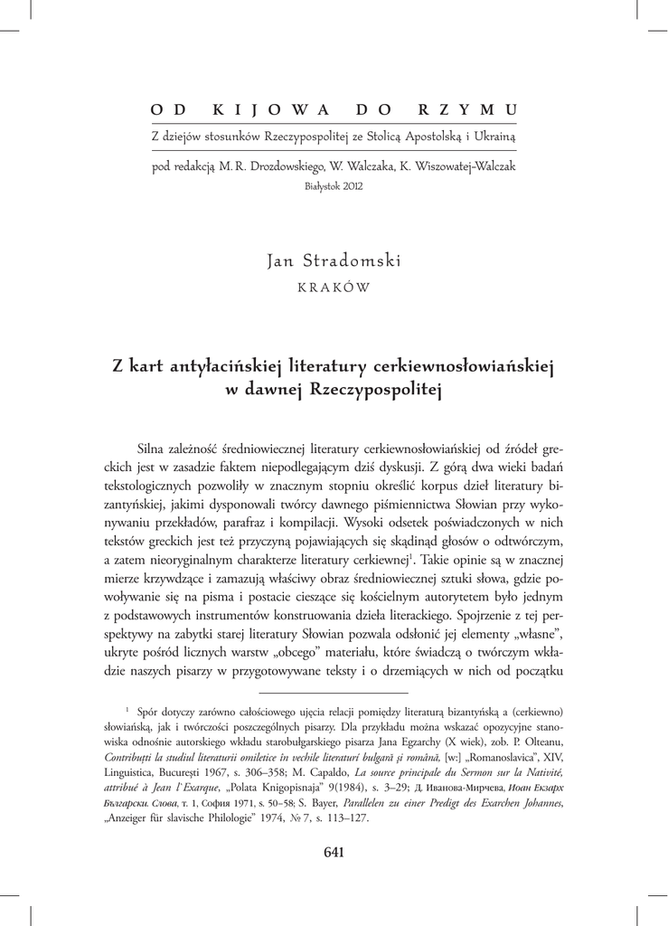 O d K i j o w a d o R z y m u Z dziejów stosunków Rzeczypospolitej ze Stolicą Apostolską i Ukrainą pod redakcją M. R. Drozdowskiego, W. Walczaka, K. Wiszowatej-Walczak Białystok 2012 Jan Stradomski K rak ó w Z kart antyłacińskiej literatury cerkiewnosłowiańskiej w dawnej Rzeczypospolitej Silna zależność średniowiecznej literatury cerkiewnosłowiańskiej od źródeł greckich jest w zasadzie faktem niepodlegającym dziś dyskusji. Z górą dwa wieki badań tekstologicznych pozwoliły w znacznym stopniu określić korpus dzieł literatury bizantyńskiej, jakimi dysponowali twórcy dawnego piśmiennictwa Słowian przy wykonywaniu przekładów, parafraz i kompilacji. Wysoki odsetek poświadczonych w nich tekstów greckich jest też przyczyną pojawiających się skądinąd głosów o odtwórczym, a zatem nieoryginalnym charakterze literatury cerkiewnej1. Takie opinie są w znacznej mierze krzywdzące i zamazują właściwy obraz średniowiecznej sztuki słowa, gdzie powoływanie się na pisma i postacie cieszące się kościelnym autorytetem było jednym z podstawowych instrumentów konstruowania dzieła literackiego. Spojrzenie z tej perspektywy na zabytki starej literatury Słowian pozwala odsłonić jej elementy „własne”, ukryte pośród licznych warstw „obcego” materiału, które świadczą o twórczym wkładzie naszych pisarzy w przygotowywane teksty i o drzemiących w nich od początku 1 Spór dotyczy zarówno całościowego ujęcia relacji pomiędzy literaturą bizantyńską a (cerkiewno) słowiańską, jak i twórczości poszczególnych pisarzy. Dla przykładu można wskazać opozycyjne stanowiska odnośnie autorskiego wkładu starobułgarskiego pisarza Jana Egzarchy (X wiek), zob. P. Olteanu, Contribuţti la studiul literaturii omiletice în vechile literaturí bulgară şi română, [w:] „Romanoslavica”, XIV, Linguistica, Bucureşti 1967, s. 306–358; M. Capaldo, La source principale du Sermon sur la Nativité, attribué à Jean l`Exarque, „Polata Knigopisnaja” 9(1984), s. 3–29; Д. Иванова-Мирчева, Иоан Екзарх Български. Слова, т. 1, София 1971, s. 50–58; S. Bayer, Parallelen zu einer Predigt des Exarchen Johannes, „Anzeiger für slavische Philologie” 1974, № 7, s. 113–127. 641 Jan Stradomski zdolnościach. Najlepiej obrazują to w pełni oryginalne utwory słowiańskie, czyli te nieposiadające greckich analogii tekstowych. Dla mechanizmów średniowiecznego systemu literackiego nie ma większego znaczenia nawet fakt, że i wówczas stanowiły one jedynie ułamek procenta użytkowanej przez Słowian literatury. Literatura ta bowiem, mimo że na wskroś przesiąknięta tekstami obcymi, już przez sam akt przekładu na język słowiański uznawana była przecież w całości za własną – podobnie zresztą jak dogmatyka i tradycja chrześcijańska – a więc i użyty w niej (przetłumaczony lub parafrazowany) tekst grecki stanowił w pewnym sensie również jej „rodzimy” komponent. Te zasady operacji twórczych widoczne są dobrze również na materiale antyłacińskiej polemiki religijnej w literaturze staroruskiej. Piśmiennictwo Rusi Kijowskiej w zasadzie od początku rozwijało się w atmosferze narastającego konfliktu chrześcijaństwa wschodniego z zachodnim, którego kulminacją stały się brzemienne w skutki wydarzenia wielkiej schizmy (1054). Wyraźny wpływ kultury bizantyńskiej na ziemie ruskie – wynikający choćby z faktu przyjęcia chrztu w obrządku greckim czy regularnego obsadzania kijowskiego tronu biskupiego przez Greków – sprawił, że literatura praktycznie na bieżąco reagowała na nasilającą się od połowy XI wieku grecko-łacińską kontrowersję. Pojawiające się w tym kontekście wypowiedzi i pisma znane były na Rusi (głównie za sprawą południowosłowiańskich przekładów, choć nie tylko), toteż staroruska polemika doktrynalna bezpośrednio odwoływała się do źródeł bizantyńskich2. Stosunkowo słabo rozwinęła się natomiast rodzima tradycja teologiczna3. Przegląd wcale pokaźnego zestawu tekstów antyłacińskich z XI–XV wieku4, jakie znane były na Rusi, pozwala dostrzec, że w tym okresie dominują przekłady pism greckich, a polemika koncentruje się na różnicach natury obrzędowej, zwyczajowej i dyscyplinarnej. W prowadzonym głównie przez Bizantyńczyków sporze z Rzymem Rusini zdają się zajmować pozycję obserwatorów dyskusji toczącej się na linii Wschód–Zachód, z rzadka tylko dorzucają do niej coś od siebie – zresztą i tak zwykle z wykorzystaniem tradycyjnej greckiej argumentacji. Taki obraz polemiki utrzyma się jeszcze w okresie sporów hesychastycznych, gdy pisma Grzegorza Palamasa i Nila Kabasilasa zostaną niemal natychmiast 2 G. Podskalsky, Chrześcijaństwo i literatura teologiczna na Rusi Kijowskiej (988–1237), tłum. J. Zychowicz, Kraków 2000, s. 242–243. 3 Б. Ґудзяк, Криза і реформа: Київська митрополія, Царгородський патріархат і генеза Берестеиської унії, перекл. М. Габлевич, під ред. О. Турія, Львів 2000, s. 312–313. 4 А. Попов, Историко-литературный обзоръ полемическихъ сочинений против латинян (XI–XV в.), Москва 1875; А. Павлов, Критические опыты по истории древнейшей греко-русской полемики против латинян, Санктпетербург 1878; G. Podskalsky, Chrześcijaństwo i literatura teologiczna…, s. 242–262; В. Зема, Вiзiя разколу Церкви в раннiй православнiй полемiцi, „Ковчег. Науковий сбiрник iз церковної iисторiї” 2001, ч. 3, s. 182–216; idem, Полемiко-догматичнi збiрки XVI – початку XVII ст., 