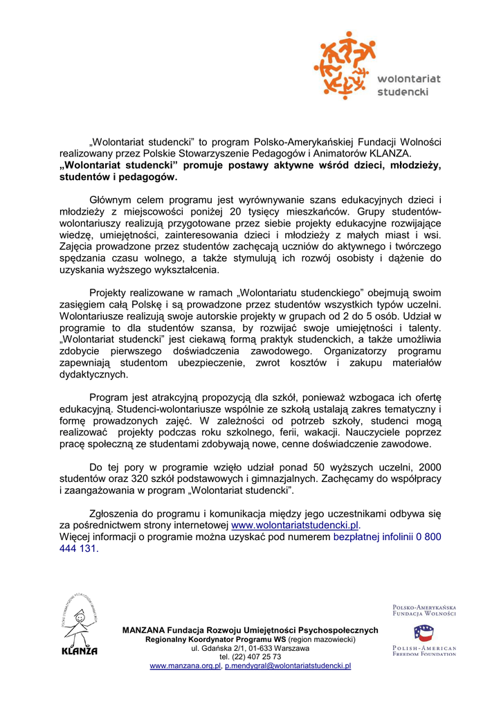 „Wolontariat studencki” to program Polsko-Amerykańskiej Fundacji Wolności realizowany przez Polskie Stowarzyszenie Pedagogów i Animatorów KLANZA. „Wolontariat studencki” promuje postawy aktywne wśród dzieci, młodzieży, studentów i pedagogów. Głównym celem programu jest wyrównywanie szans edukacyjnych dzieci i młodzieży z miejscowości poniżej 20 tysięcy mieszkańców. Grupy studentówwolontariuszy realizują przygotowane przez siebie projekty edukacyjne rozwijające wiedzę, umiejętności, zainteresowania dzieci i młodzieży z małych miast i wsi. Zajęcia prowadzone przez studentów zachęcają uczniów do aktywnego i twórczego spędzania czasu wolnego, a także stymulują ich rozwój osobisty i dążenie do uzyskania wyższego wykształcenia. Projekty realizowane w ramach „Wolontariatu studenckiego” obejmują swoim zasięgiem całą Polskę i są prowadzone przez studentów wszystkich typów uczelni. Wolontariusze realizują swoje autorskie projekty w grupach od 2 do 5 osób. Udział w programie to dla studentów szansa, by rozwijać swoje umiejętności i talenty. „Wolontariat studencki” jest ciekawą formą praktyk studenckich, a także umożliwia zdobycie pierwszego doświadczenia zawodowego. Organizatorzy programu zapewniają studentom ubezpieczenie, zwrot kosztów i zakupu materiałów dydaktycznych. Program jest atrakcyjną propozycją dla szkół, ponieważ wzbogaca ich ofertę edukacyjną. Studenci-wolontariusze wspólnie ze szkołą ustalają zakres tematyczny i formę prowadzonych zajęć. W zależności od potrzeb szkoły, studenci mogą realizować projekty podczas roku szkolnego, ferii, wakacji. Nauczyciele poprzez pracę społeczną ze studentami zdobywają nowe, cenne doświadczenie zawodowe. Do tej pory w programie wzięło udział ponad 50 wyższych uczelni, 2000 studentów oraz 320 szkół podstawowych i gimnazjalnych. Zachęcamy do współpracy i zaangażowania w program „Wolontariat studencki”. Zgłoszenia do programu i komunikacja między jego uczestnikami odbywa się za pośrednictwem strony internetowej www.wolontariatstudencki.pl. Więcej informacji o programie można uzyskać pod numerem bezpłatnej infolinii 0 800 444 131. MANZANA Fundacja Rozwoju Umiejętności Psychospołecznych Regionalny Koordynator Programu WS (region mazowiecki) ul. Gdańska 2/1, 01-633 Warszawa tel. (22) 407 25 73 www.manzana.org.pl, [email protected] Informacja dla uczelni Aktywizacja studentów „Wolontariat studencki” to dla studentów: – – atrakcyjna forma wykorzystania studiów wiedzy i umiejętności zdobytych w trakcie możliwość rozwoju pasji i zainteresowań – szansa, aby rozwijać zdolności twórczego myślenia, umiejętności pracy w grupie i koordynacji projektu, czyli umiejętności, które z pewnością przydadzą się studentom w przyszłym życiu zawodowym – ciekawa forma praktyk studenckich doświadczenia zawodowego – okazja do poznania problemów społeczności lokalnych, idei pracy dla dobra innych, co może w przyszłości zaowocować ich zaangażowaniem w działalność społeczną i możliwość zdobycia pierwszego Co zyskuje uczelnia? – środowisko akademickie umożliwiające rozwijanie pasji i zainteresowań staje się dla młodych ludzi niezwykle atrakcyjne – zaangażowanie wyższych uczelni w promocję programu przyczynia się do wzrostu ich prestiżu – każda szkoła wyższa może zostać Uczelnią Partnerską programu, a przez to móc stale rozwijać swoją ofertę praktyk oraz działań społecznych dla studentów MANZANA Fundacja Rozwoju Umiejętności Psychospołecznych Regionalny Koordynator Programu WS (region mazowiecki) ul. Gdańska 2/1, 01-633 Warszawa tel. (22) 407 25 73 www.manzana.org.pl, [email protected]