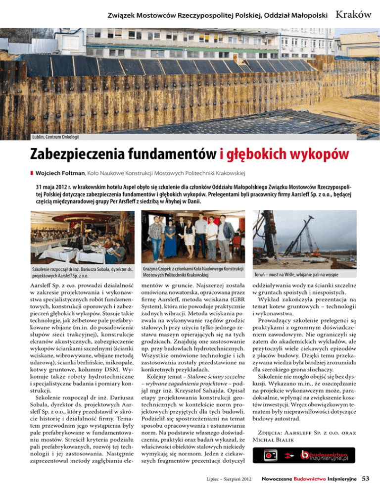 Związek Mostowców Rzeczypospolitej Polskiej, Oddział Małopolski Kraków Lublin, Centrum Onkologii Zabezpieczenia fundamentów i głębokich wykopów ❚❚ Wojciech Foltman, Koło Naukowe Konstrukcji Mostowych Politechniki Krakowskiej 31 maja 2012 r. w krakowskim hotelu Aspel obyło się szkolenie dla członków Oddziału Małopolskiego Związku Mostowców Rzeczypospolitej Polskiej dotyczące zabezpieczenia fundamentów i głębokich wykopów. Prelegentami byli pracownicy firmy Aarsleff Sp. z o.o., będącej częścią międzynarodowej grupy Per Arsfleff z siedzibą w Åbyhøj w Danii. Szkolenie rozpoczął dr inż. Dariusza Sobala, dyrektor ds. projektowych Aarsleff Sp. z o.o. Grażyna Czopek z członkami Koła Naukowego Konstrukcji Mostowych Politechniki Krakowskiej Aarsleff Sp. z o.o. prowadzi działalność w zakresie projektowania i wykonawstwa specjalistycznych robót fundamentowych, konstrukcji oporowych i zabezpieczeń głębokich wykopów. Stosuje takie technologie, jak żelbetowe pale prefabrykowane wbijane (m.in. do posadowienia słupów sieci trakcyjnej), konstrukcje ekranów akustycznych, zabezpieczenie wykopów ściankami szczelnymi (ścianki wciskane, wibrowywane, wbijane metodą udarową), ścianki berlińskie, mikropale, kotwy gruntowe, kolumny DSM. Wykonuje także roboty hydrotechniczne i specjalistyczne badania i pomiary konstrukcji. Szkolenie rozpoczął dr inż. Dariusza Sobala, dyrektor ds. projektowych Aarsleff Sp. z o.o., który przedstawił w skrócie historię i działalność firmy. Tematem przewodnim jego wystąpienia były pale prefabrykowane w fundamentowaniu mostów. Streścił kryteria podziału pali prefabrykowanych, rozwój tej technologii i jej zastosowania. Następnie zaprezentował metody zagłębiania ele- mentów w gruncie. Najszerzej została omówiona nowatorska, opracowana przez firmę Aarsleff, metoda wciskana (GBR System), która nie powoduje praktycznie żadnych wibracji. Metoda wciskania pozwala na wykonywanie rzędów grodzic stalowych przy użyciu tylko jednego zestawu maszyn opierających się na tych grodzicach. Znajdują one zastosowanie np. przy budowlach hydrotechnicznych. Wszystkie omówione technologie i ich zastosowania zostały przedstawione na konkretnych przykładach. Kolejny temat – Stalowe ściany szczelne – wybrane zagadnienia projektowe – podjął mgr inż. Krzysztof Sahajda. Opisał etapy projektowania konstrukcji geotechnicznych w kontekście norm projektowych przyjętych dla tych budowli. Podzielił się spostrzeżeniami na temat sposobu opracowywania i ustanawiania norm. Na podstawie własnego doświadczenia, praktyki oraz badań wykazał, że właściwości obiektów stalowych niekiedy wymykają się normom. Jeden z ciekawszych fragmentów prezentacji dotyczył Toruń – most na Wiśle, wbijanie pali na wyspie oddziaływania wody na ścianki szczelne w gruntach spoistych i niespoistych. Wykład zakończyła prezentacja na temat kotew gruntowych – technologii i wykonawstwa. Prowadzący szkolenie prelegenci są praktykami z ogromnym doświadczeniem zawodowym. Nie ograniczyli się zatem do akademickich wykładów, ale przytoczyli wiele ciekawych epizodów z placów budowy. Dzięki temu przekazywana wiedza była bardziej zrozumiała dla szerokiego grona słuchaczy. Szkolenie nie mogło obejść się bez dyskusji. Wykazano m.in., że oszczędzanie na projekcie wykonawczym może, paradoksalnie, wpłynąć na zwiększenie kosztów inwestycji. Wręcz obowiązkowym tematem były nieprawidłowości dotyczące budowy autostrad. Zdjęcia: Aarsleff Sp. z o.o. oraz Michał Bialik Lipiec – Sierpień 2012 Nowoczesne Budownictwo Inżynieryjne 53