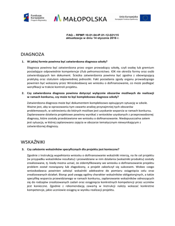 FAQ – RPMP.10.01.04-IP.01-12-021/15 aktualizacja w dniu 14 stycznia 2016 r. DIAGNOZA 1. W jakiej formie powinna być zatwierdzona diagnoza szkoły? Diagnoza powinna być zatwierdzona przez organ prowadzący szkołę, czyli osobę lub gremium posiadające odpowiednie kompetencje i/lub pełnomocnictwo. IOK nie określa formy oraz osób zatwierdzających ten dokument. Ścieżka zatwierdzenia powinna być zgodna z obowiązującą praktyką oraz statutem odpowiedniej jednostki. Fakt posiadania zgody organu prowadzącego powinien być wskazany przez Wnioskodawcę we wniosku o dofinansowanie, co może podlegać weryfikacji w trakcie kontroli projektu. 2. Czy zatwierdzona diagnoza powinna dotyczyć wyłącznie obszarów możliwych do realizacji w ramach konkursu, czy może to być kompleksowa diagnoza szkoły? Zatwierdzona diagnoza może być dokumentem kompleksowo opisującym sytuację w szkole. Ważne jest, aby w opracowaniu tym zawarto analizę przynajmniej tych obszarów problemowych, w odniesieniu do których możliwe jest uzyskanie wsparcia w ramach konkursu. Zaplanowane działania projektowe powinny wynikać z wniosków uzyskanych z przeprowadzonej diagnozy, które zostały przedstawione we wniosku o dofinansowanie. Niedopuszczalna zatem jest sytuacja, w której zaplanowano zajęcia w obszarze tematycznym niewynikającym z zatwierdzonej diagnozy. WSKAŹNIKI 3. Czy założenie wskaźników specyficznych dla projektu jest konieczne? Zgodnie z Instrukcją wypełniania wniosku o dofinansowanie wskaźniki mierzą, na ile cel projektu (w przypadku wskaźników rezultatu) i przewidziane w nim działania (wskaźniki produktu) zostały zrealizowane, tj. kiedy można uznać, że zidentyfikowany we wniosku o dofinansowanie projektu problem został rozwiązany lub złagodzony, a projekt zakończył się sukcesem. Wobec czego wnioskodawca powinien założyć wskaźniki adekwatne do pomiaru osiągnięcia celu oraz zrealizowanych działań. Biorąc pod uwagę ogólny charakter wskaźników obligatoryjnych, a także specyfikę wsparcia przewidzianego w ramach konkursu, zaplanowanie wskaźników odnoszących się do rodzajów zrealizowanych zadań oraz osiągnięcia konkretnych kompetencji przez uczniów jest konieczne. Zgodnie z rekomendacją zawartą w Instrukcji należy wskazać konkretne kompetencje, jakie uczniowie osiągną w wyniku realizacji projektu. 4. Czy wykonanie wskaźnika przypisanego do kwoty ryczałtowej należy dokumentować z każdym wnioskiem o płatność, czy na koniec rozliczając kwotę ryczałtową? Zgodnie zapisami umowy o dofinansowanie projektu rozliczanymi kwotami ryczałtowymi: kolejne transze dofinansowania (n+1) przekazywane są po złożeniu i zweryfikowaniu wniosku o płatność rozliczającego ostatnią transzę dofinansowania (n), (…) w którym wykazano wydatki kwalifikowalne wynikające z realizacji zadań objętych kwotą ryczałtową rozliczające co najmniej 70% łącznej kwoty otrzymanych transz dofinansowania lub po zatwierdzeniu wniosku o płatność, w którym Beneficjent oświadczył, ze wydatkował 70% otrzymanych transz, oraz zatwierdzeniu przez IP wniosku o płatność rozliczającego przedostatnią transzę dofinansowania (n-1). Dokumenty, które stanowią dowód wykonania tych zadań zostały wymienione w umowie o dofinansowanie projektu. 5. Jak określić liczbę uczestników w kontekście wskaźnika obowiązkowego liczba uczniów, którzy nabyli kompetencje kluczowe po opuszczeniu programu? Wnioskodawca powinien na podstawie diagnozy ustalić, jaka liczba uczniów jest zainteresowana korzystaniem z projektu. Następnie w oparciu o te informacje należy zaplanować liczbę osób, które wezmą udział w projekcie. Liczba osób, które uzyskały kompetencje w wyniku realizacji wsparcia projektowego, powinna być oszacowana rzetelnie i racjonalnie. W tym celu zasadne jest uwzględnienie doświadczenia w realizacji podobnych przedsięwzięć. Należy przy tym wziąć pod uwagę fakt, że dla tego wskaźnika osoba uczestnicząca w kilku rodzajach zajęć i osiągająca w efekcie różne kompetencje kluczowe wykazywana jest tylko raz. 6. Pytanie dotyczy wskaźnika udział projektu w odniesieniu do obszaru objętego programem rewitalizacji. Jeśli szkoła nie jest zlokalizowana na obszarze rewitalizowanym, ale uczniowie mieszkają na takim obszarze, w jaki sposób należy określić wartość docelową wskaźnika? Czy w takiej sytuacji można uznać, iż projekt wpływa na obszar rewitalizowany? W takim przypadku udział projektu w odniesieniu do obszaru programu rewitalizacji należy oszacować proporcjonalnie do wydatków planowanych do poniesienia lub poniesionych na danym obszarze, tj. w odniesieniu do uczestników projektu zamieszkujących obszar rewitalizowany. FINANSE 7. W jaki sposób wykazać wkład pieniężny w budżecie? Wkład pieniężny powinien zostać wykazany w części I Budżet ogólny w wierszu w tym w ramach kosztów bezpośrednich lub w wierszu w tym w ramach kosztów pośrednich. Planując wkład własny, należy zawsze dokonać sprawdzenia wymaganego poziomu wkładu własnego dla danej wartości projektu. 8. Czy dopuszczalne jest wniesienie wkładu własnego w formie niefinansowej? Jeżeli tak, to jak należy poprawnie taki wkład oznaczyć we wniosku oraz jak należy dokumentować wniesiony wkład własny? Wniesienie wkładu własnego w formie niefinansowej jest możliwe. We wniosku konieczne jest wykazanie w budżecie szczegółowym kosztów, które będą stanowić wkład własny i oznaczyć jako Wkład rzeczowy. Sposób dokumentowania wniesionego wkładu własnego jest tożsamy z dokumentowaniem pozostałych wydatków kwalifikowalnych. 9. W której części wniosku należy wskazać, kto jest realizatorem projektu? W jaki sposób pokazać w budżecie wydatek ponoszony przez realizatora projektu? Informację na temat realizatora projektu powinny znaleźć się we wniosku i odpowiednim na to miejscem jest część D., gdzie należy
