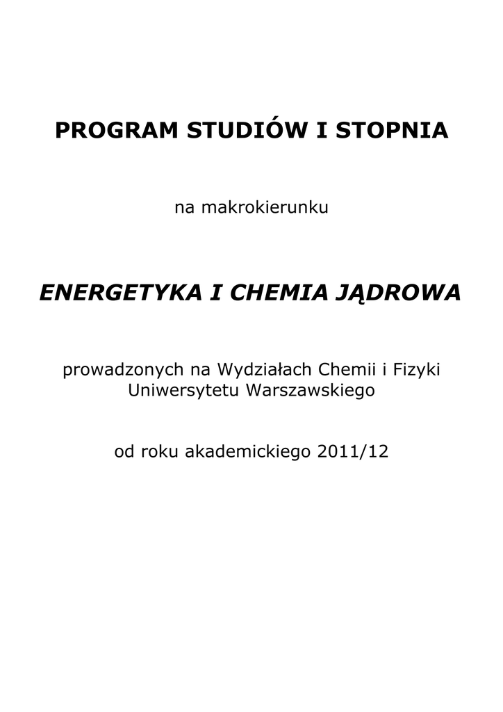 PROGRAM STUDIÓW I STOPNIA na makrokierunku ENERGETYKA I CHEMIA JĄDROWA prowadzonych na Wydziałach Chemii i Fizyki Uniwersytetu Warszawskiego od roku akademickiego 2011/12 Wakacyjne zajęcia przygotowawcze (wrzesień) Przedmiot Matematyka Fizyka Chemia Suma godzin 30 25 30 85 Wykłady Ćwicz. Konw. Lab. ECTS Forma zaliczenia Suma godzin 180 Wykłady Ćwicz. Konw. Lab. ECTS 90 90 12 Forma zaliczenia Egzamin 60 30 30 4 Egzamin 15 15 1 120 30 Zaliczenie na ocenę Egzamin Semestr 1 (Rok 1, Semestr 1) Przedmiot Rachunek różniczkowy i całkowy Algebra z geometrią Wstęp do fizyki I Chemia organiczna z elementami biochemii Język obcy 90 (60) Zajęcia ogólnouniwersyteckie BHP Zajęcia ogólnouniwersyteckie Ochrona własności intelektualnej WF 10 2 Zaliczenie na ocenę 0,5 0,5 (30) 375 30 Semestr 2 (Rok 1, Semestr 2) Przedmiot Suma godzin 135 15 Wykłady 75 15 60 9 1 Mechanika i szczególna teoria względności Chemia nieorganiczna z elementami syntezy nieorganicznej Pracownia analizy danych 105 60 45 8 Forma zaliczenia Egzamin Zaliczenie na ocenę Egzamin 90 30 60 8 Egzamin 15 6 9 1 Język obcy (60) 2 Zajęcia ogólnouniwersyteckie WF (30) 1 Zaliczenie na ocenę Zaliczenie na ocenę Zaliczenie na ocenę (30) 360 30 Analiza Wstęp do fizyki II Ćwicz. Konw. Lab. ECTS Semestr 3 (Rok 2, Semestr 1) Przedmiot Suma godzin 120 Wykłady Wstęp do fizyki III 15 15 1 Podstawy fizyki współczesnej Chemia fizyczna Podstawy fizyki subatomowej Pracownia fizyczna i elektroniczna Zajęcia ogólnouniwersyteckie WF 30 30 2 105 60 30 30 Elektrodynamika 60 Ćwicz. Konw. Lab. 60 ECTS 8 15 30 60 60 8 4 60 5 (30) 2 (30) 390 30 Forma zaliczenia Egzamin Zaliczenie na ocenę Zaliczenie na ocenę Egzamin Zaliczenie na ocenę Egzamin Zaliczenie na ocenę Semestr 4 (Rok 2, Semestr 2) Przedmiot Mechanika i chemia kwantowa z elementami spektroskopii molekularnej Zastosowania fizyki jądrowej Ochrona radiologiczna Krystalografia z elementami teorii grup Analiza instrumentalna WF Egzamin certyfikujący z języka obcego Suma godzin 150 Wykłady 60 60 60 30 30 75 45 30 15 15 30 45 (30) 15 375 Ćwicz. Konw. Lab. ECTS 30 13 Forma zaliczenia Egzamin 4 Egzamin 30 5 3 30 3 Egzamin Zaliczenie na ocenę Egzamin 2 Egzamin 30 Semestr 5 (Rok 3, Semestr 1) Przedmiot Elementy termodynamiki i fizyki statystycznej Zaawansowana fizyka jądrowa Chemia jądrowa i radiacyjna Programowanie i metody numeryczne Elementy astronomii i astrofizyki jądrowej Biologia komórki Suma godzin 60 Wykłady 30 30 120 30 30 90 30 75 30 30 30 2 15 15 1 390 Ćwicz. 45 Konw. Lab. ECTS 5 Forma zaliczenia Egzamin 60 8 Egzamin 60 6 Egzamin 5 Zaliczenie na ocenę Zaliczenie na ocenę Zaliczenie na ocenę 27 Semestr 6 (Rok 3, Semestr 2) Przedmiot Praktyki studenckie (po 2 roku studiów) Pracownia licencjacka i wykonanie pracy Chemia stosowana, odpady i zarządzanie chemikaliami Chemia materiałów Suma godzin Wykłady Ćwicz. Konw. Lab. ECTS Forma zaliczenia 2 170 170 10 10 10 1 Zaliczenie na ocenę 30 30 3 Technologia chemiczna 60 30 Zaliczenie na ocenę Zaliczenie na ocenę Seminarium specjalizacyjne Zajęcia do wyboru – zajęcia humanistyczne Zajęcia do wyboru (60 h) Eksperyment fizyczny w warunkach ekstremalnych Wstęp do fizyki środowiska 30 30 30 6 2 (60) 5 60 30 30 4 2 30 30 2 Fizyka pogody i klimatu 30 30 2 Fizyka wnętrza ziemi 30 30 2 Fizyka neutrin 30 30 2 Metody jądrowe w fizyce ciała stałego Techniki jądrowe w diagnostyce i terapii medycznej Efekty izotopowe w chemii 30 30 2 30 30 2 30 30 2 Synteza radionuklidów i ich zastosowanie w medycynie jądrowej Paliwo jądrowe i odpady powstające w energetyce jądrowej Energetyka jądrowa w percepcji społeczeństwa Energia i broń jądrowa 30 30 2 15 15 1 Zaliczenie na ocenę 15 15 1 30 30 2 Zaliczenie na ocenę Zaliczenie na ocenę 360 33 Zaliczenie na ocenę Zaliczenie na ocenę Zaliczenie na ocenę Zaliczenie na ocenę Zaliczenie na ocenę Zaliczenie na ocenę Zaliczenie na ocenę Zaliczenie na ocenę Zaliczenie na ocenę