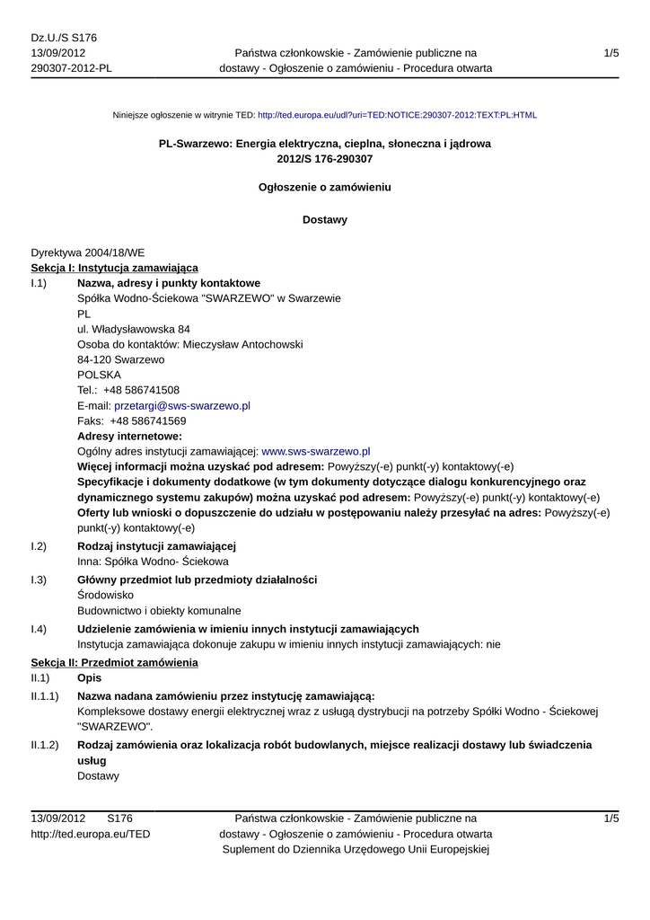 Dz.U./S S176 13/09/2012 290307-2012-PL Państwa członkowskie - Zamówienie publiczne na dostawy - Ogłoszenie o zamówieniu - Procedura otwarta 1/5 Niniejsze ogłoszenie w witrynie TED: http://ted.europa.eu/udl?uri=TED:NOTICE:290307-2012:TEXT:PL:HTML PL-Swarzewo: Energia elektryczna, cieplna, słoneczna i jądrowa 2012/S 176-290307 Ogłoszenie o zamówieniu Dostawy Dyrektywa 2004/18/WE Sekcja I: Instytucja zamawiająca I.1) Nazwa, adresy i punkty kontaktowe Spółka Wodno-Ściekowa "SWARZEWO" w Swarzewie PL ul. Władysławowska 84 Osoba do kontaktów: Mieczysław Antochowski 84-120 Swarzewo POLSKA Tel.: +48 586741508 E-mail: [email protected] Faks: +48 586741569 Adresy internetowe: Ogólny adres instytucji zamawiającej: www.sws-swarzewo.pl Więcej informacji można uzyskać pod adresem: Powyższy(-e) punkt(-y) kontaktowy(-e) Specyfikacje i dokumenty dodatkowe (w tym dokumenty dotyczące dialogu konkurencyjnego oraz dynamicznego systemu zakupów) można uzyskać pod adresem: Powyższy(-e) punkt(-y) kontaktowy(-e) Oferty lub wnioski o dopuszczenie do udziału w postępowaniu należy przesyłać na adres: Powyższy(-e) punkt(-y) kontaktowy(-e) I.2) Rodzaj instytucji zamawiającej Inna: Spółka Wodno- Ściekowa I.3) Główny przedmiot lub przedmioty działalności Środowisko Budownictwo i obiekty komunalne I.4) Udzielenie zamówienia w imieniu innych instytucji zamawiających Instytucja zamawiająca dokonuje zakupu w imieniu innych instytucji zamawiających: nie Sekcja II: Przedmiot zamówienia II.1) Opis II.1.1) Nazwa nadana zamówieniu przez instytucję zamawiającą: Kompleksowe dostawy energii elektrycznej wraz z usługą dystrybucji na potrzeby Spółki Wodno - Ściekowej "SWARZEWO". II.1.2) Rodzaj zamówienia oraz lokalizacja robót budowlanych, miejsce realizacji dostawy lub świadczenia usług Dostawy 13/09/2012 S176 http://ted.europa.eu/TED Państwa członkowskie - Zamówienie publiczne na dostawy - Ogłoszenie o zamówieniu - Procedura otwarta Suplement do Dziennika Urzędowego Unii Europejskiej 1/5 Dz.U./S S176 13/09/2012 290307-2012-PL Państwa członkowskie - Zamówienie publiczne na dostawy - Ogłoszenie o zamówieniu - Procedura otwarta 2/5 Główne miejsce lub lokalizacja robót budowlanych, miejsce realizacji dostawy lub świadczenia usług: Swarzewo, Jastarnia. Kod NUTS PL II.1.3) Informacje na temat zamówienia publicznego, umowy ramowej lub dynamicznego systemu zakupów (DSZ) Ogłoszenie dotyczy zamówienia publicznego II.1.4) Informacje na temat umowy ramowej II.1.5) Krótki opis zamówienia lub zakupu Oczyszczalnia ścieków w Swarzewie- transformatory 1 i 2 wraz z sumatorem: Planowane roczne zużycie energii 2 000 000 kWh. Planowane zużycie energii przez okres trwania umowy 2 000 000 kWh. Grupa taryfowa B23. Moc przyłączeniowa 800 kW. Moc transformatorów 1000 i 400 kVA. Moc umowna w rozbiciu na miesiące (od stycznia do grudnia)- współczynnik mocy tg φ ≤ 0,4 mocy umownej 450, 450, 450, 450, 450, 450, 550, 550, 550, 450, 450, 450 kW. Przepompownia ścieków w Pucku- transformator 1: Planowane roczne zużycie energii 50 000 kWh. Planowane zużycie energii przez okres trwania umowy 50 000 kWh. Grupa taryfowa B22. Moc przyłączeniowa 350 kW. Moc transformatora 400 kVA. Moc umowna w rozbiciu na miesiące (od stycznia do grudnia)- współczynnik mocy tg φ ≤ 0,4 mocy umownej 100, 100, 100, 100, 100, 120, 120, 120, 120, 100, 100, 100 kW. Przepompownia ścieków w Pucku- transformator 2: Planowane roczne zużycie energii 180 000 kWh. Planowane zużycie energii przez okres trwania umowy 180 000 kWh. Grupa taryfowa B22. Moc przyłączeniowa 235 kW. Moc transformatora 400 kVA. Moc umowna w rozbiciu na miesiące (od stycznia do grudnia)- współczynnik mocy tg φ ≤ 0,4 mocy umownej 100, 100, 100, 100, 100, 120, 120, 120, 120, 100, 100, 100 kW. Przepompownia ścieków we Władysławowie: Planowane roczne zużycie energii 220 000 kWh. Planowane zużycie energii przez okres trwania umowy 220 000 kWh. Grupa taryfowa B21. Moc przyłączeniowa 250 kW. Moc transformatora 400 kVA. Moc umowna w rozbiciu na miesiące (od stycznia do grudnia)- współczynnik mocy tg φ ≤ 0,4 120, 120, 120, 150, 150, 150, 170, 170, 150, 120, 120, 120 kW. Oczyszczalnia ścieków w Jastarni transformator 1: Planowane roczne zużycie energii 220 000 kWh. Planowane zużycie energii przez okres trwania umowy 220 000 kWh. Grupa taryfowa B21. Moc przyłączeniowa 200 kW. 13/09/2012 S176 http://ted.europa.eu/TED Państwa członkowskie - Zamówienie publiczne na dostawy - Ogłoszenie o zamówieniu - Procedura otwarta Suplement do Dziennika Urzędowego Unii Europejskiej 2/5 Dz.U./S S176 13/09/2012 290307-2012-PL Państwa członkowskie - Zamówienie publiczne na dostawy - Ogłoszenie o zamówieniu - Procedura otwarta 3/5 Moc transformatora 250 kVA. Moc umowna w rozbiciu na miesiące (od stycznia do grudnia)- współczynnik mocy tg φ ≤ 0,4 mocy umownej 140, 140, 140, 140, 140, 200, 200, 200, 200, 140, 140, 140 kW. Oczyszczalnia ścieków w Jastarni- transformator 2: Planowane roczne zużycie energii 390 000 kWh. Planowane zużycie energii przez okres trwania umowy 390 000 kWh. Grupa taryfowa B21. Moc przyłączeniowa 200 kW. Moc transformatora 400 kVA. Moc umowna w rozbiciu na miesiące (od stycznia do grudnia)- współczynnik mocy tg φ ≤ 0,4 mocy umownej 140, 140, 140, 140, 140, 200, 200, 200, 200, 140, 140, 140 kW. II.1.6) Wspólny Słownik Zamówień (CPV) 09300000 II.1.7) Informacje na temat Porozumienia w sprawie zamówień rządowych (GPA) Zamówienie jest objęte Porozumieniem w sprawie zamówień rządowych (GPA): nie II.1.8) Części To zamówienie podzielone jest na części: nie II.1.9) Informacje o ofertach wariantowych Dopuszcza się składanie ofert wariantowych: nie II.2) Wielkość lub zakres zamówienia II.2.1) Całkowita wielkość lub zakres: Szacunkowa wartość bez VAT: 1 402 164,00 PLN II.2.2) Informacje o opcjach Opcje: nie II.2.3) Informacje o wznowieniach Jest to zamówi