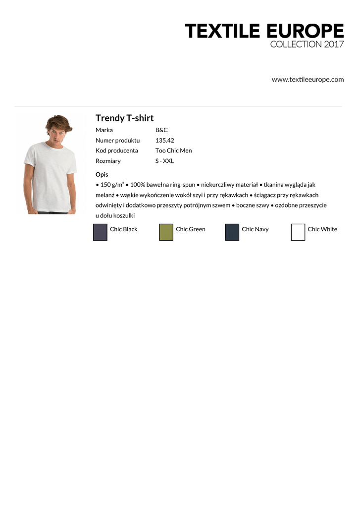Trendy T-shirt Marka B&C Numer produktu 135.42 Kod producenta Too Chic Men Rozmiary S - XXL Opis • 150 g/m² • 100% bawełna ring-spun • niekurczliwy materiał • tkanina wygląda jak melanż • wąskie wykończenie wokół szyi i przy rękawkach • ściągacz przy rękawkach odwinięty i dodatkowo przeszyty potrójnym szwem • boczne szwy • ozdobne przeszycie u dołu koszulki Chic Black Chic Green Chic Navy Chic White