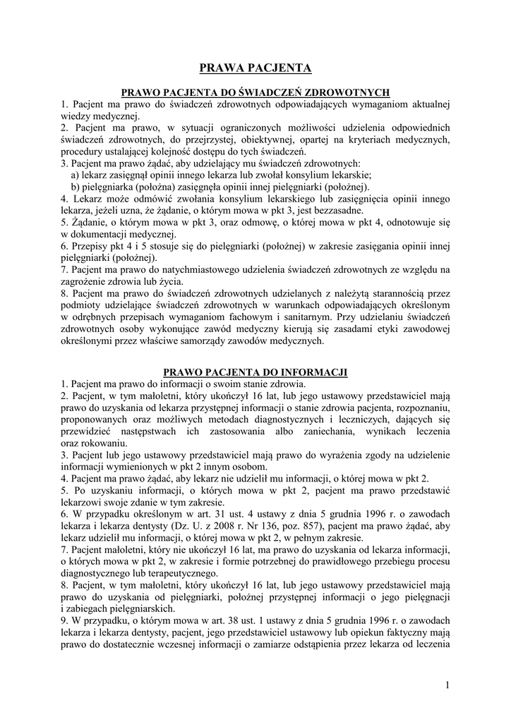 PRAWA PACJENTA PRAWO PACJENTA DO ŚWIADCZEŃ ZDROWOTNYCH 1. Pacjent ma prawo do świadczeń zdrowotnych odpowiadających wymaganiom aktualnej wiedzy medycznej. 2. Pacjent ma prawo, w sytuacji ograniczonych możliwości udzielenia odpowiednich świadczeń zdrowotnych, do przejrzystej, obiektywnej, opartej na kryteriach medycznych, procedury ustalającej kolejność dostępu do tych świadczeń. 3. Pacjent ma prawo żądać, aby udzielający mu świadczeń zdrowotnych: a) lekarz zasięgnął opinii innego lekarza lub zwołał konsylium lekarskie; b) pielęgniarka (położna) zasięgnęła opinii innej pielęgniarki (położnej). 4. Lekarz może odmówić zwołania konsylium lekarskiego lub zasięgnięcia opinii innego lekarza, jeżeli uzna, że żądanie, o którym mowa w pkt 3, jest bezzasadne. 5. Żądanie, o którym mowa w pkt 3, oraz odmowę, o której mowa w pkt 4, odnotowuje się w dokumentacji medycznej. 6. Przepisy pkt 4 i 5 stosuje się do pielęgniarki (położnej) w zakresie zasięgania opinii innej pielęgniarki (położnej). 7. Pacjent ma prawo do natychmiastowego udzielenia świadczeń zdrowotnych ze względu na zagrożenie zdrowia lub życia. 8. Pacjent ma prawo do świadczeń zdrowotnych udzielanych z należytą starannością przez podmioty udzielające świadczeń zdrowotnych w warunkach odpowiadających określonym w odrębnych przepisach wymaganiom fachowym i sanitarnym. Przy udzielaniu świadczeń zdrowotnych osoby wykonujące zawód medyczny kierują się zasadami etyki zawodowej określonymi przez właściwe samorządy zawodów medycznych. PRAWO PACJENTA DO INFORMACJI 1. Pacjent ma prawo do informacji o swoim stanie zdrowia. 2. Pacjent, w tym małoletni, który ukończył 16 lat, lub jego ustawowy przedstawiciel mają prawo do uzyskania od lekarza przystępnej informacji o stanie zdrowia pacjenta, rozpoznaniu, proponowanych oraz możliwych metodach diagnostycznych i leczniczych, dających się przewidzieć następstwach ich zastosowania albo zaniechania, wynikach leczenia oraz rokowaniu. 3. Pacjent lub jego ustawowy przedstawiciel mają prawo do wyrażenia zgody na udzielenie informacji wymienionych w pkt 2 innym osobom. 4. Pacjent ma prawo żądać, aby lekarz nie udzielił mu informacji, o której mowa w pkt 2. 5. Po uzyskaniu informacji, o których mowa w pkt 2, pacjent ma prawo przedstawić lekarzowi swoje zdanie w tym zakresie. 6. W przypadku określonym w art. 31 ust. 4 ustawy z dnia 5 grudnia 1996 r. o zawodach lekarza i lekarza dentysty (Dz. U. z 2008 r. Nr 136, poz. 857), pacjent ma prawo żądać, aby lekarz udzielił mu informacji, o której mowa w pkt 2, w pełnym zakresie. 7. Pacjent małoletni, który nie ukończył 16 lat, ma prawo do uzyskania od lekarza informacji, o których mowa w pkt 2, w zakresie i formie potrzebnej do prawidłowego przebiegu procesu diagnostycznego lub terapeutycznego. 8. Pacjent, w tym małoletni, który ukończył 16 lat, lub jego ustawowy przedstawiciel mają prawo do uzyskania od pielęgniarki, położnej przystępnej informacji o jego pielęgnacji i zabiegach pielęgniarskich. 9. W przypadku, o którym mowa w art. 38 ust. 1 ustawy z dnia 5 grudnia 1996 r. o zawodach lekarza i lekarza dentysty, pacjent, jego przedstawiciel ustawowy lub opiekun faktyczny mają prawo do dostatecznie wczesnej informacji o zamiarze odstąpienia przez lekarza od leczenia 1 pacjenta i wskazania przez tego lekarza możliwości uzyskania świadczenia zdrowotnego u innego lekarza lub podmiotu udzielającego świadczeń zdrowotnych. 10. Pacjent ma prawo do informacji o prawach pacjenta określonych w ustawie o prawach pacjenta i Rzeczniku Praw Pacjenta oraz w przepisach odrębnych, uwzględniającej ograniczenia tych praw określone w tych przepisach. Podmiot udzielający świadczeń zdrowotnych udostępnia tę informację w formie pisemnej, poprzez umieszczenie jej w swoim lokalu, w miejscu ogólnodostępnym. 11. W przypadku pacjenta niemogącego się poruszać informację, o której mowa w pkt 10 udostępnia się w sposób umożliwiający zapoznanie się z nią w pomieszczeniu, w którym pacjent przebywa. 12. Pacjent ma prawo do informacji o rodzaju i zakresie świadczeń zdrowotnych udzielanych przez podmiot udzielający świadczeń zdrowotnych, w tym o profilaktycznych programach zdrowotnych finansowanych ze środków publicznych, realizowanych przez ten podmiot. PRAWO PACJENTA DO TAJEMNICY INFORMACJI Z NIM ZWIĄZANYCH 1. Pacjent ma prawo do zachowania w tajemnicy przez osoby wykonujące zawód medyczny, w tym udzielające mu świadczeń zdrowotnych, informacji z nim związanych, a uzyskanych w związku z wykonywaniem zawodu medycznego. 2. W celu realizacji prawa, o którym mowa w pkt 1, osoby wykonujące zawód medyczny są obowiązane zachować w tajemnicy informacje związane z pacjentem, w szczególności ze stanem zdrowia pacjenta. 3. Przepisu pkt 2 nie stosuje się, w przypadku gdy: a) tak stanowią przepisy odrębnych ustaw; b) zachowanie tajemnicy może stanowić niebezpieczeństwo dla życia lub zdrowia pacjenta lub innych osób; c) pacjent lub jego przedstawiciel ustawowy wyraża zgodę na ujawnienie tajemnicy; d) zachodzi potrzeba przekazania niezbędnych informacji o pacjencie związanych z udzielaniem świadczeń zdrowotnych innym osobom wykonującym zawód medyczny, uczestniczącym w udzielaniu tych świadczeń. 3a. Przepisu pkt 2 nie stosuje się także do postępowania przed wojewódzką komisją do spraw orzekania o zdarzeniach medycznych. 4. Osoby wykonujące zawód medyczny, z wyjątkiem przypadków, o których mowa w pkt 3 lit. a-c, są związane tajemnicą również po śmierci pacjenta. PRAWO PACJENTA DO WYRAŻENIA ZGODY NA UDZIELENIE ŚWIADCZEŃ ZDROWOTNYCH 1. Pacjent ma prawo do wyrażenia zgody na udzielenie określonych świadczeń zdrowotnych lub odmowy takiej zgody, po uzyskaniu informacji w zakresie określonym w pkt 1-8 Praw pacjenta do informacji. 2. Pacjent, w tym małoletni, który ukończył 16 lat, ma prawo do wy