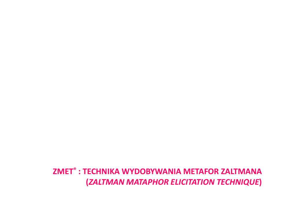 ZMET® : TECHNIKA WYDOBYWANIA METAFOR ZALTMANA (ZALTMAN MATAPHOR ELICITATION TECHNIQUE) GERALD ZALTMAN • • • • • profesor zarządzania, ekonomii i marketingu na Harvard Business School, doktorat z socjologii uzyskany na The John Hopkins University w 1968r., zainteresowania badawcze: strategie marki, zachowania konsumenckie, innowacje, zmiana społeczna, reprezentacje myśli, sposoby myślenia; współzałożyciel firmy konsultingowej Olson Zaltman Associates (1997r.), http://www.olsonzaltman.com członek działającej na Uniwersytecie Harvarda międzywydziałowej grupy, która zajmuje się badaniem zależności między umysłem, mózgiem i zachowaniem; od 1998 roku grupa prowadzi badania w wykorzystaniem rezonansu magnetycznego (skanowanie mózgów) oraz techniki ZMET®; uznawany za twórcę neuromarketingu: swoich pracach skupia się przede wszystkim na nieuświadomionym zachowaniach konsumenckich i strategiach marketingowych; jest autorem i współautorem kilkunastu książek oraz licznych artykułów dla takich czasopism, jak The New York Times, Forbes, Time i wiele innych; najważniejsze prace: Jak myślą klienci (2003, przełożona na 15 języków i należy do najlepiej sprzedających się książek biznesowych w USA i Europie) oraz Marketing Metaphoria (2008). ZMET® - CHARAKTERYSTYKA • połączenie elementów neurobiologii, semiotyki, psychologii K.G. Junga • założenia: 1. ludzie myślą obrazami; 2. 95% naszych myśli nie dociera do naszej świadomości, tradycyjne metody badawcze dostarczają jedynie skrawka potrzebnych informacji; 3. metafory są kluczem do zrozumienia ludzkiego nastawienia (przeciętny człowiek, gdy mówi, używa około sześciu metafor na minutę, najczęściej nie zdając sobie z tego sprawy); • początki: 1990r., badania Zaltmana w Nepalu podczas wakacji, udoskonalenie techniki po powrocie do USA, badania dla Coca-Coli (coca-cola i mnich buddyjski), opatentowanie techniki w lipcu 1995r. • zastosowanie w marketingu: metodą tą bada się, jakie metafory najbardziej adekwatnie określają nieświadome nastawienie konsumentów do konkretnych produktów i marek; badania w oparciu o tę technikę prowadziły m.in. Procter& Gamble, General Motors, Eastman Kodak, Nestlé, Bank od America • Więcej: wywiad z Zaltmanem: http://www.youtube.com/watch?v=NQzYclR8ufM&feature=player_emb edded ZMET®- SPOSÓB PROWADZENIA BADANIA • prosimy uczestników by przez tydzień poprzedzający badanie myśleli intensywnie o jego temacie (np. konkretnych produktach lub markach) • prosimy także, by wybrali 8-10 zdjęć najtrafniej ilustrujących ich nastawienie do tych produktów i marek (zdjęcia nie muszą być wykonane przez badanych, mogą oni korzystać z istniejących reprezentacji) • skanujemy zdjęcia wybrane przez badanych i tworzymy z nich kolaż • przeprowadzamy ok. 2-godzinny pogłębiony wywiad indywidualny, w którym stosujemy pytania sondujące (badani opisują zdjęcia i powody ich wyboru, ich związek z badanym tematem)